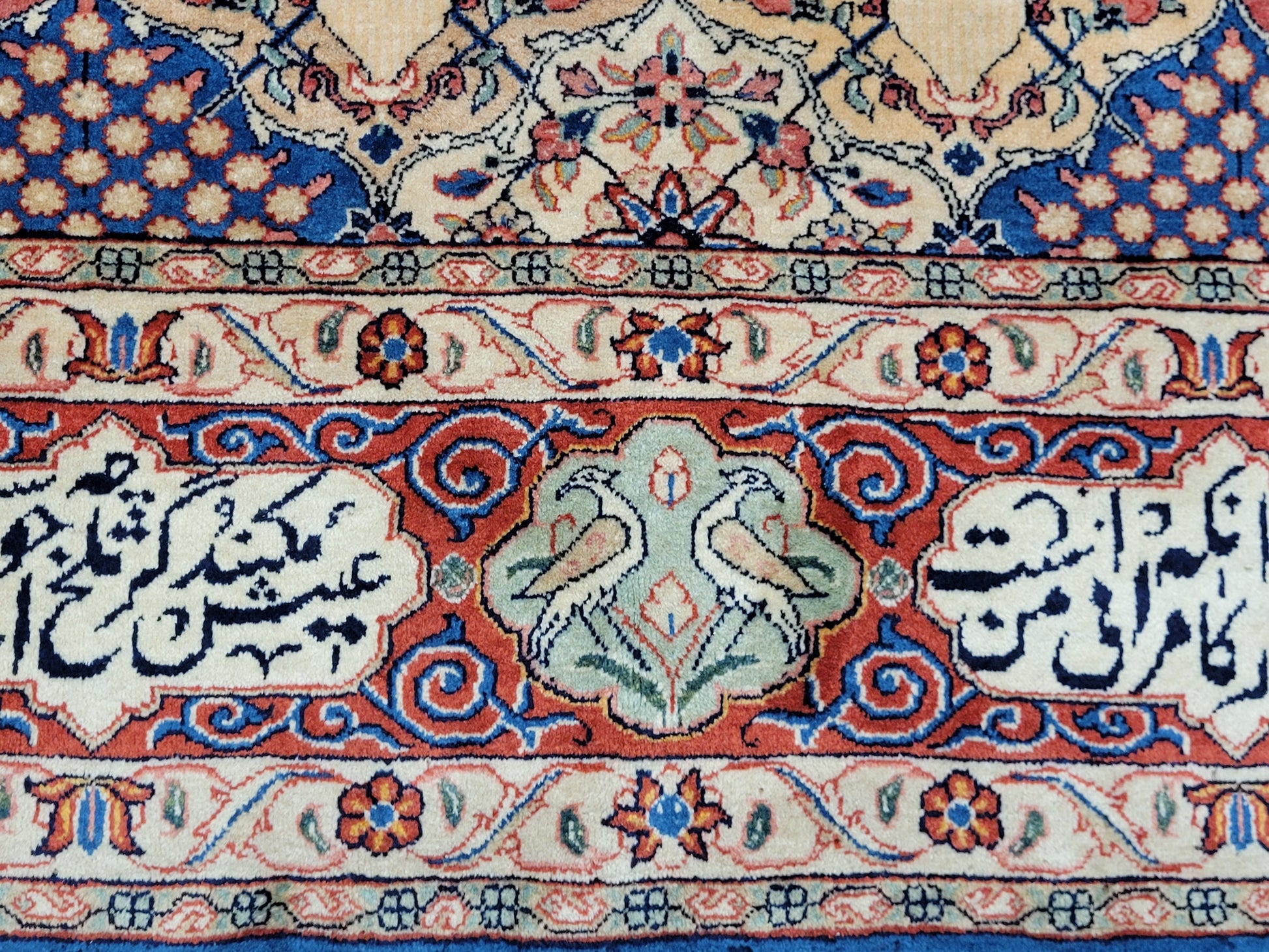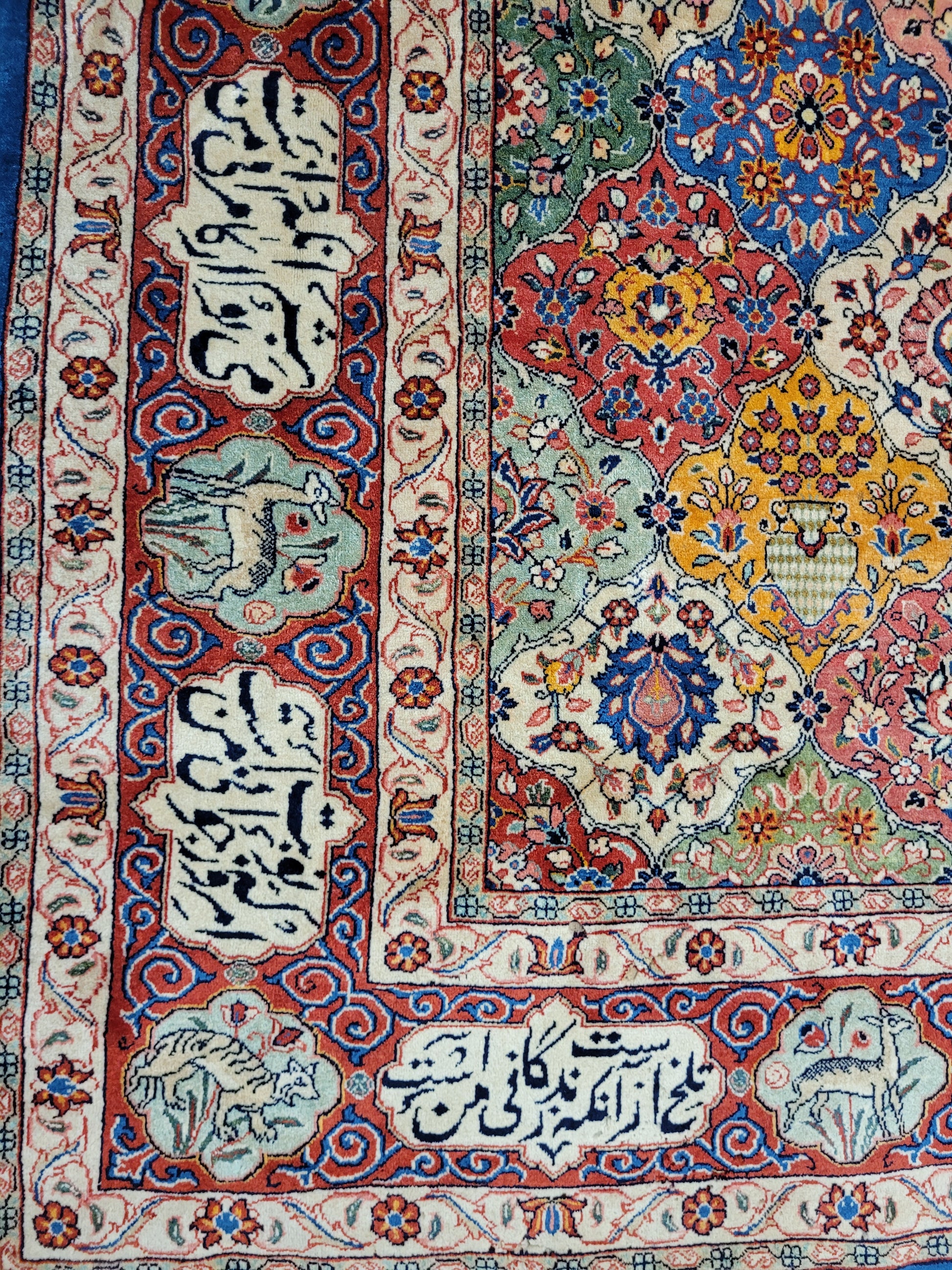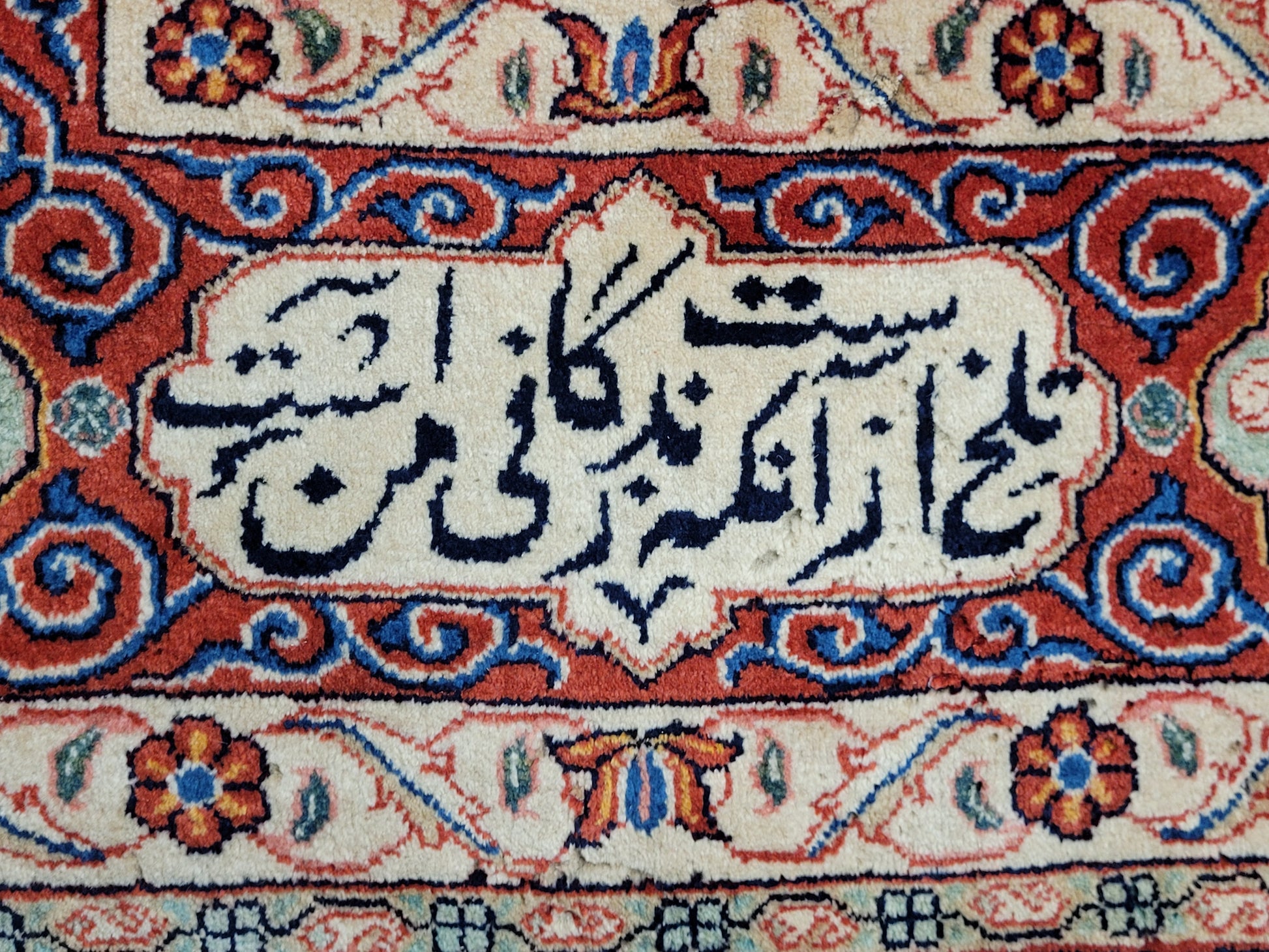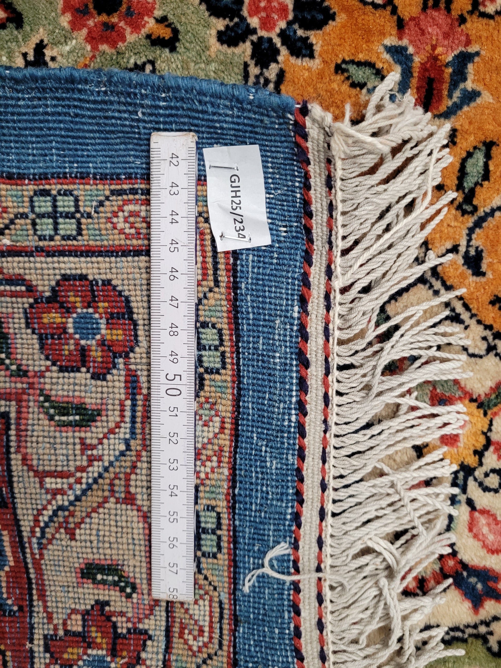 angeboten wird ein prachtvoller Sarough Teppich aus feiner Korkwolle, handgeknüpft und mit Signatur im Bordürenfeld. Das dekorative Gartenmuster besteht aus unzähligen floralen Feldern in leuchtenden Farben – jedes Einzelmotiv kunstvoll gestaltet und harmonisch aufeinander abgestimmt. Ein beeindruckendes Sammlerstück traditioneller Knüpfkunst mit seltener Detailvielfalt und künstlerischem Ausdruck.