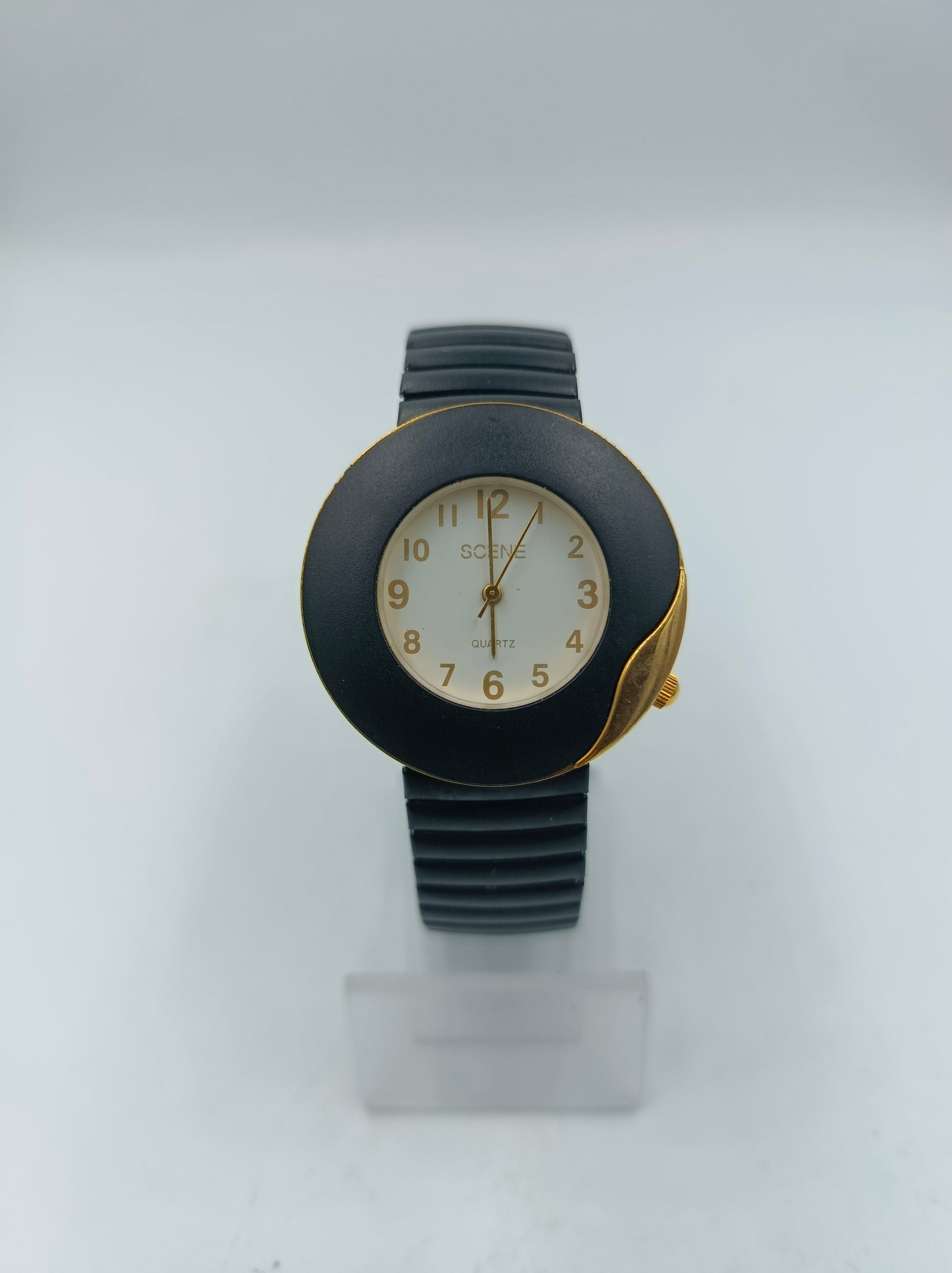 Stilvolle Scene Armbanduhr mit markantem, rundem Gehäuse in Schwarz-Gold-Optik. Das schlichte, elegante Zifferblatt mit goldfarbenen Zahlen harmoniert perfekt mit dem elastischen schwarzen Armband. Ideal für Alltag und Freizeit, angenehm zu tragen dank dehnbarem Band.