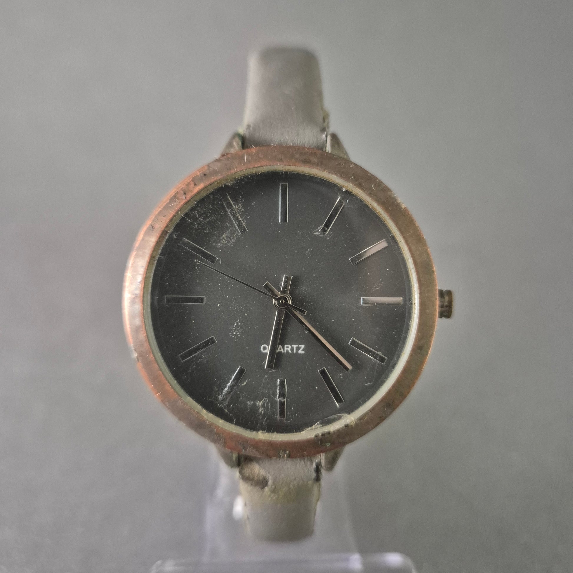 Diese Woolworth Herrenarmbanduhr besticht durch ihr schlichtes, minimalistisches Design mit einem dunklen Zifferblatt und schmalen Stundenmarkierungen. Das runde Gehäuse zeigt eine deutliche Patina, die der Uhr einen authentischen Vintage-Look verleiht. Das Quarzwerk sorgt für eine präzise Zeitmessung. Das schlichte Kunstlederarmband passt sich dem Handgelenk an und unterstreicht den klassischen Stil dieser Uhr.