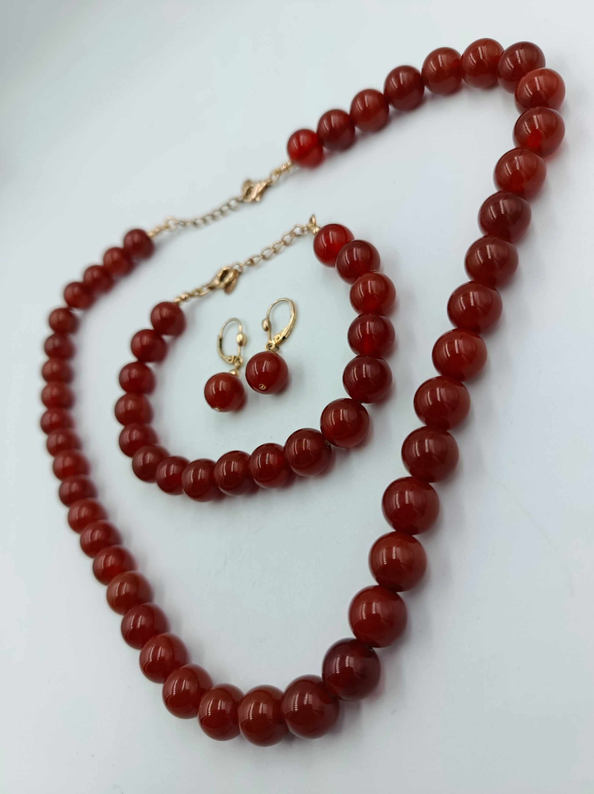 Elegantes Schmuckset bestehend aus einer Halskette, einem Armband und passenden Ohrringen. Die natürlichen Karneol-Perlen verleihen dem Set eine warme, rötlich-braune Farbgebung, während die vergoldeten 925er Silberverschlüsse für einen edlen Glanz sorgen. Perfekt geeignet für besondere Anlässe oder als stilvolles Alltagsaccessoire.