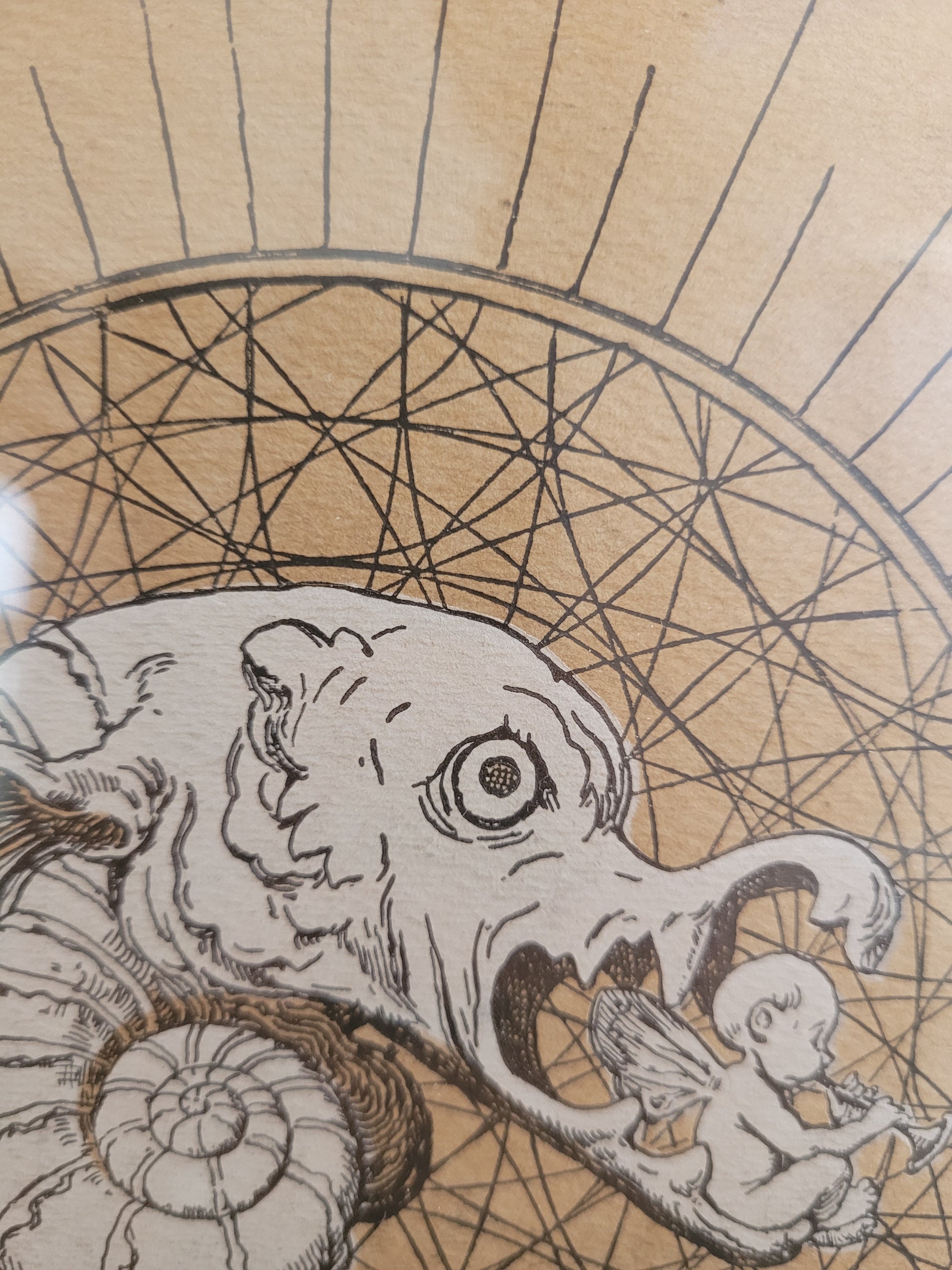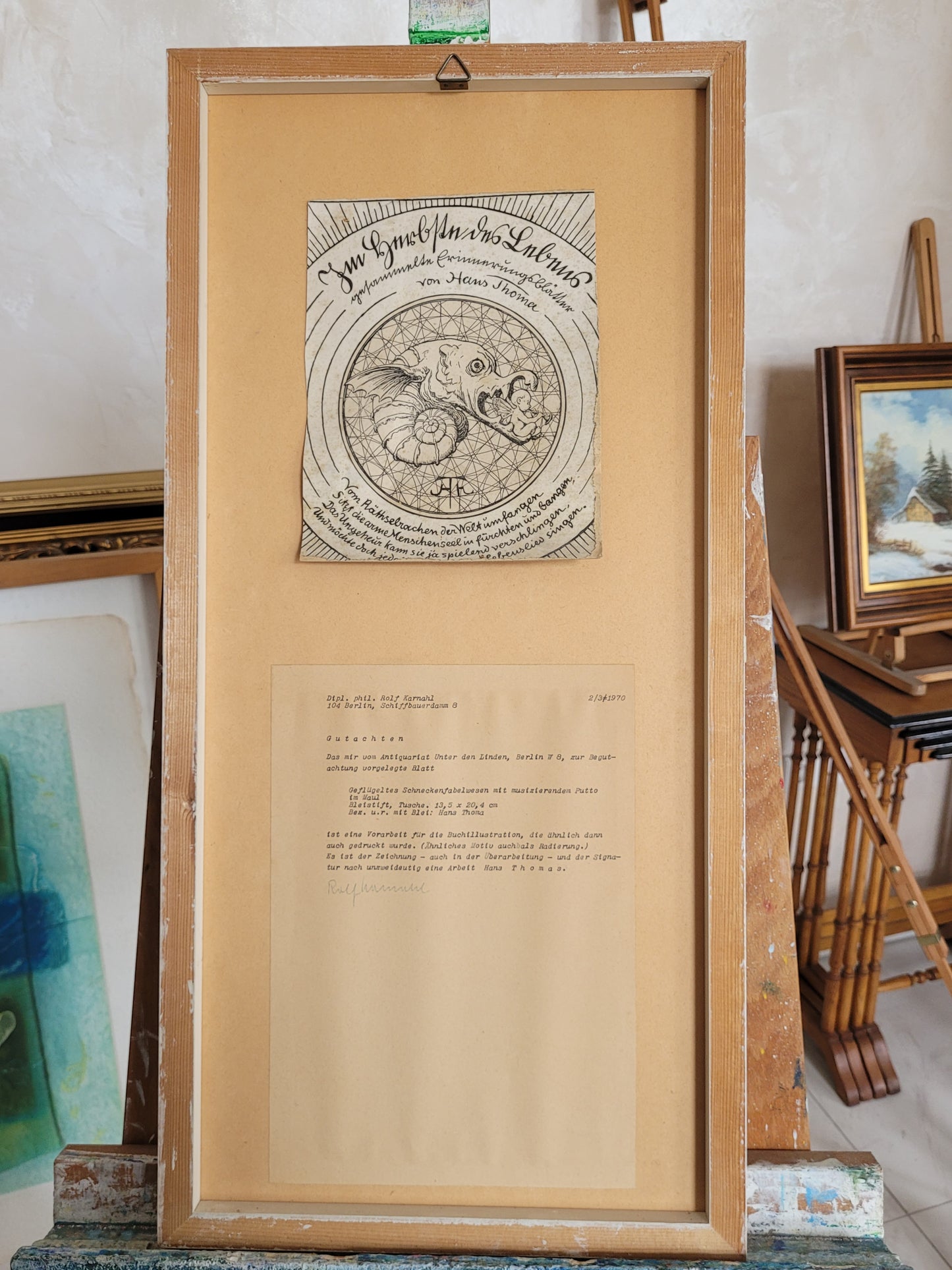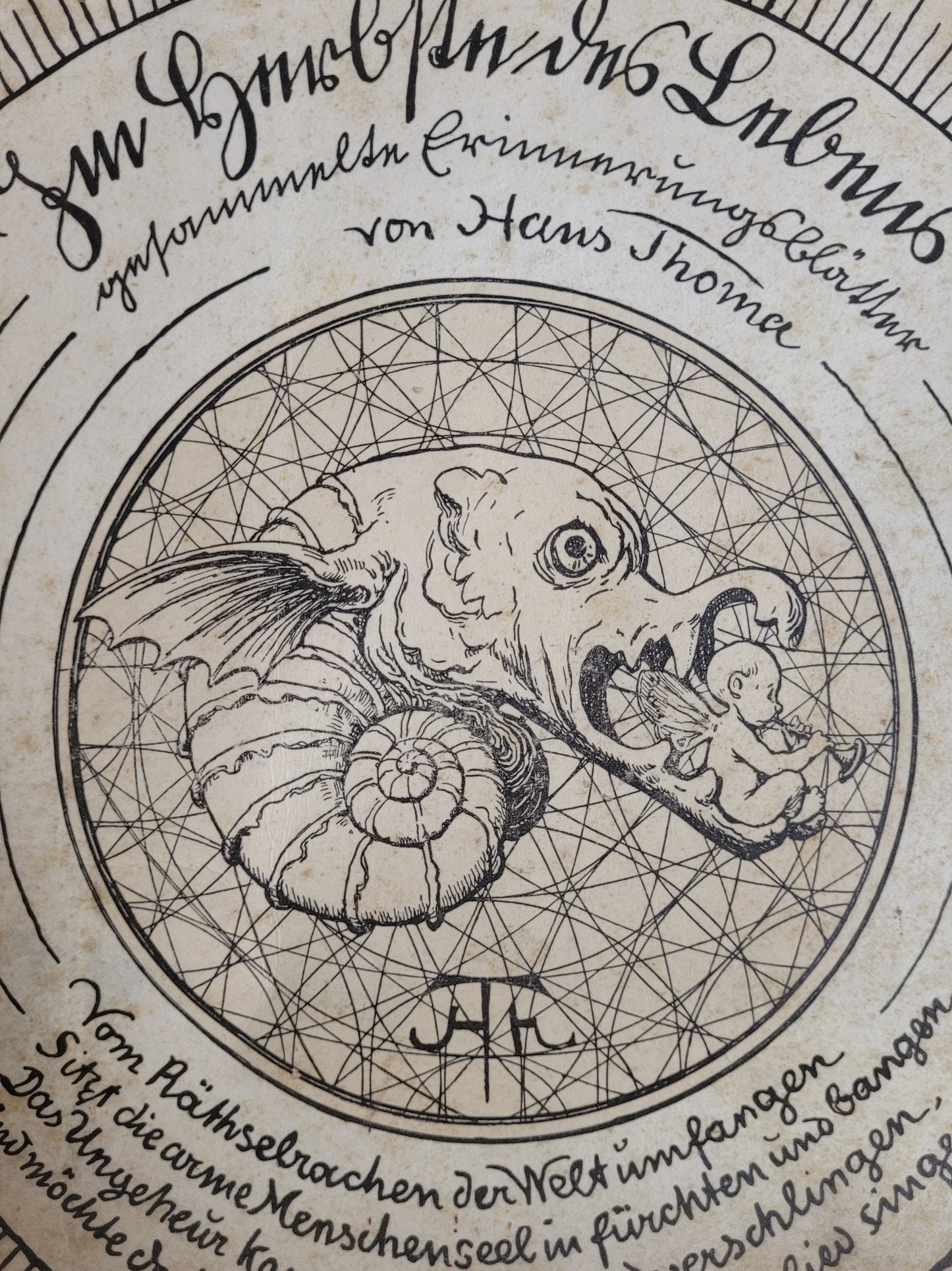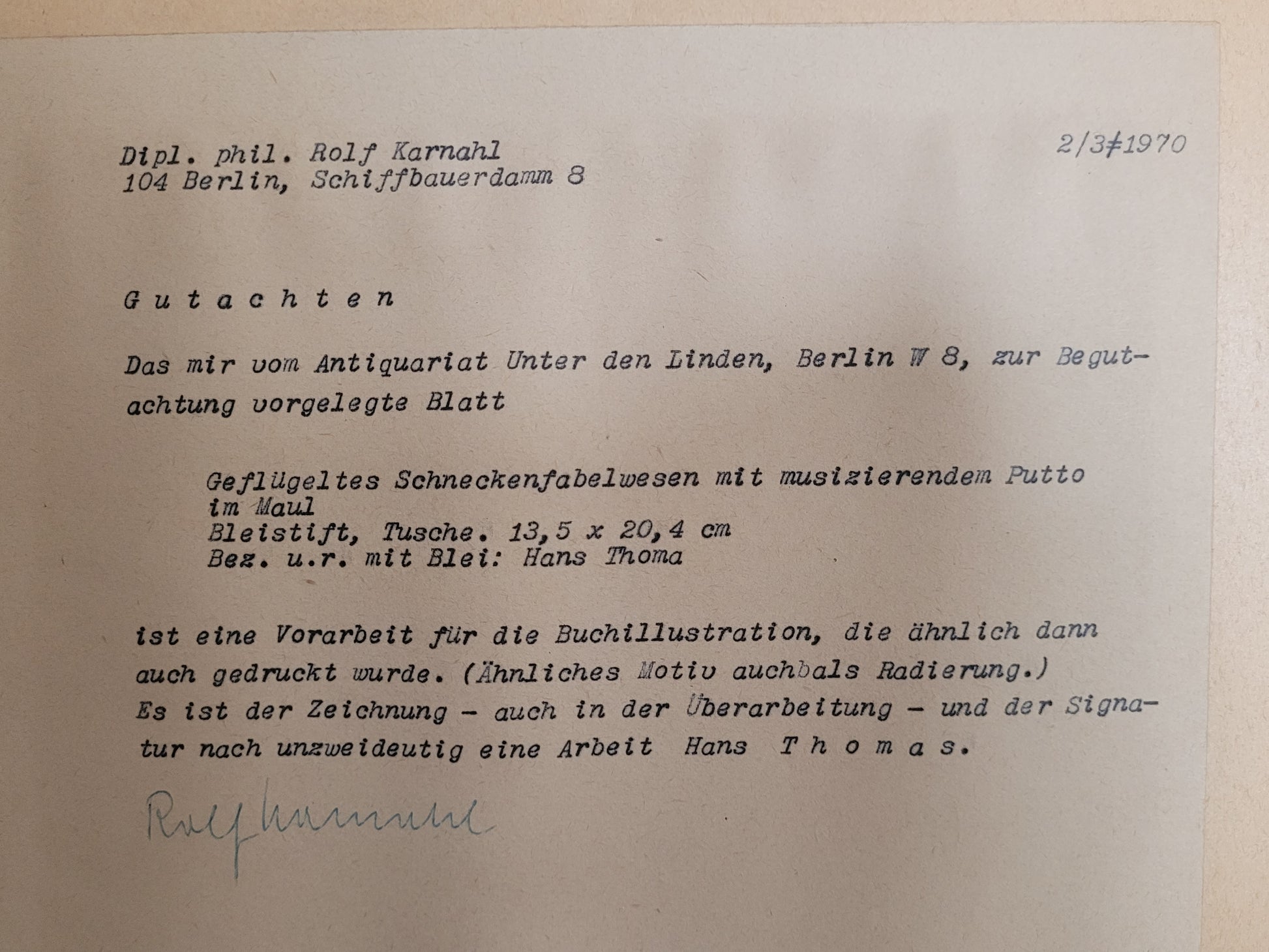 Tauchen Sie ein in die fantastische Bildwelt von Hans Thoma: Diese außergewöhnliche, handsignierte Radierung zeigt ein geflügeltes Schneckenfabelwesen in Begleitung eines Putto – eine märchenhafte Szene voller Anmut, Ironie und geheimnisvoller Symbolik.