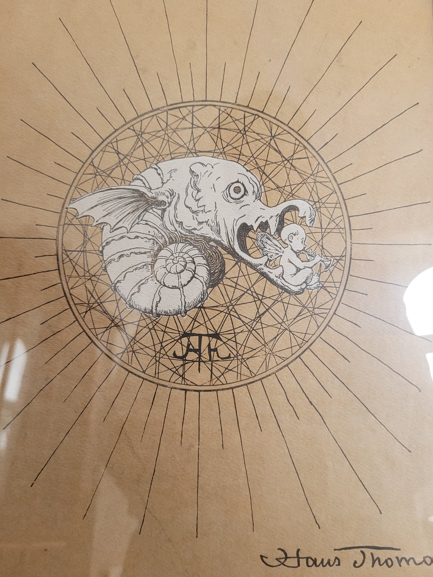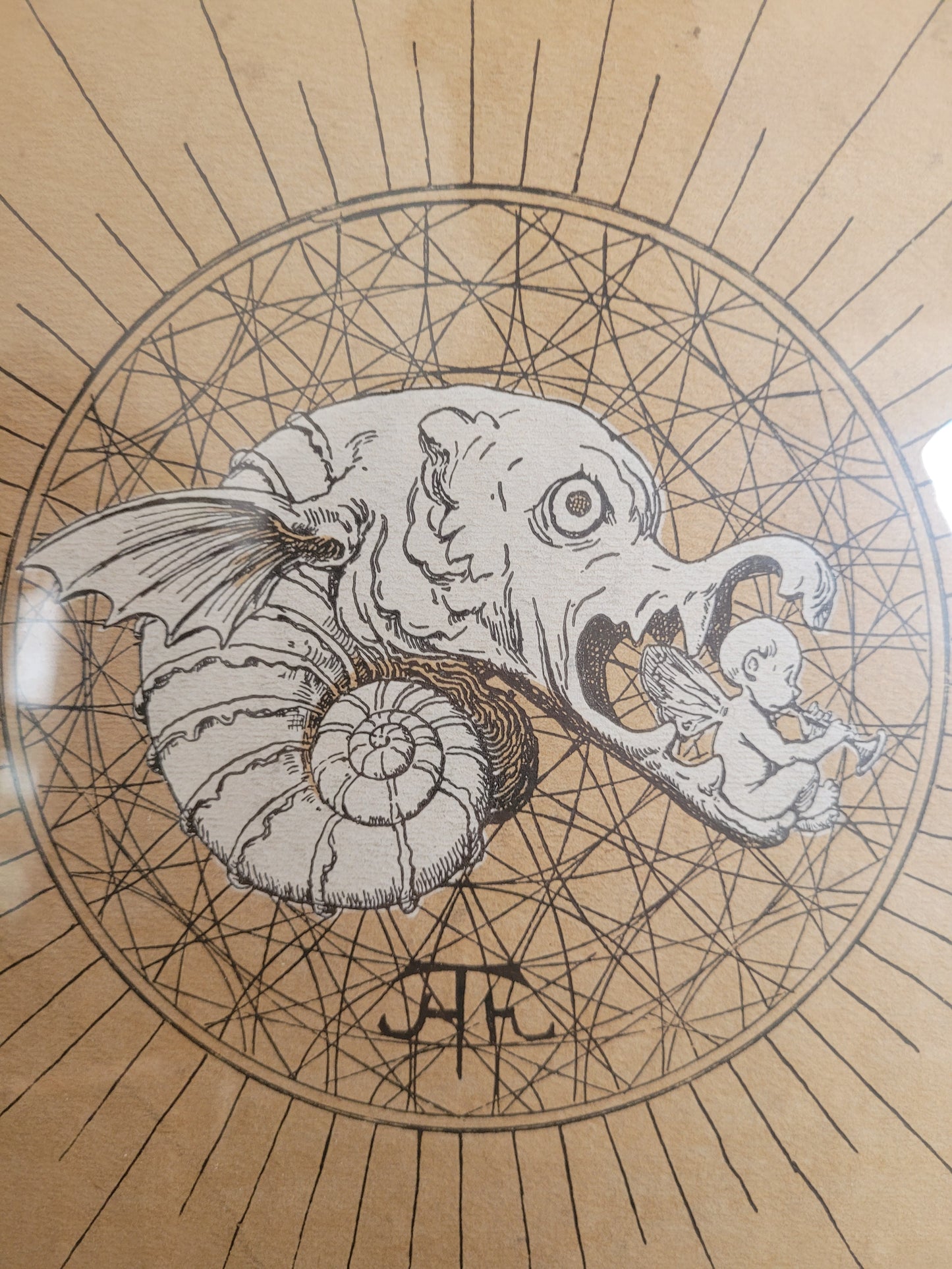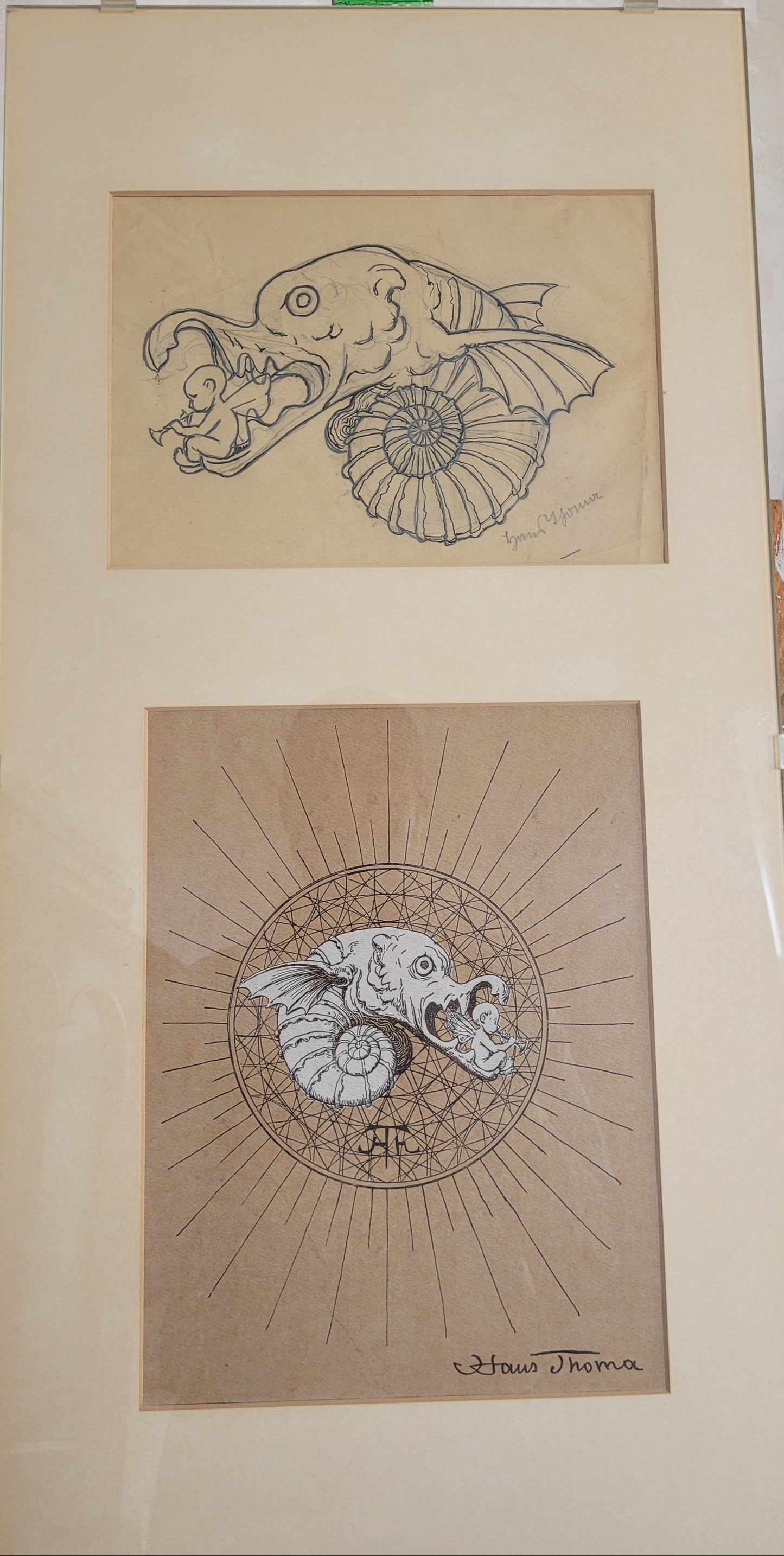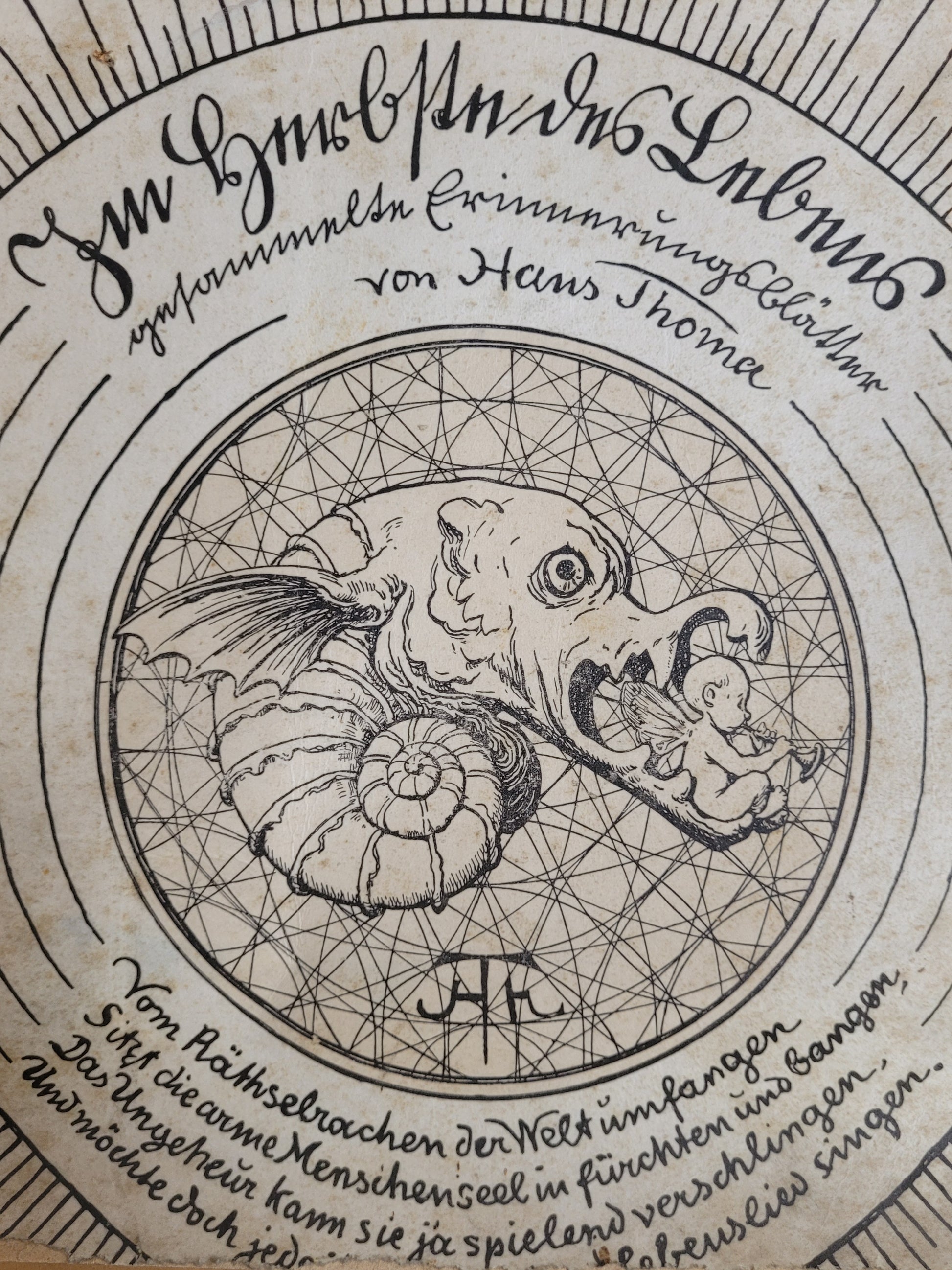 Tauchen Sie ein in die fantastische Bildwelt von Hans Thoma: Diese außergewöhnliche, handsignierte Radierung zeigt ein geflügeltes Schneckenfabelwesen in Begleitung eines Putto – eine märchenhafte Szene voller Anmut, Ironie und geheimnisvoller Symbolik.