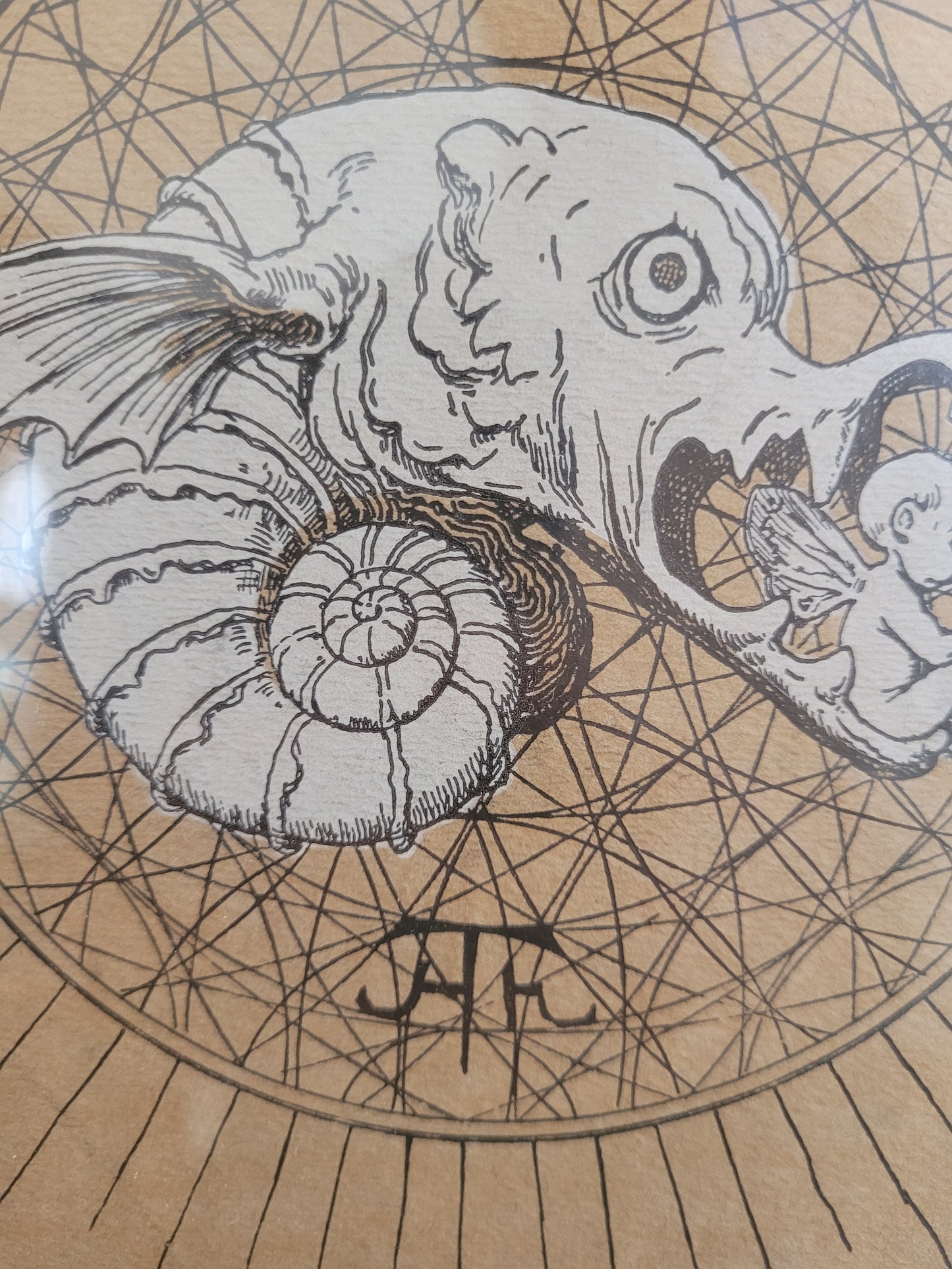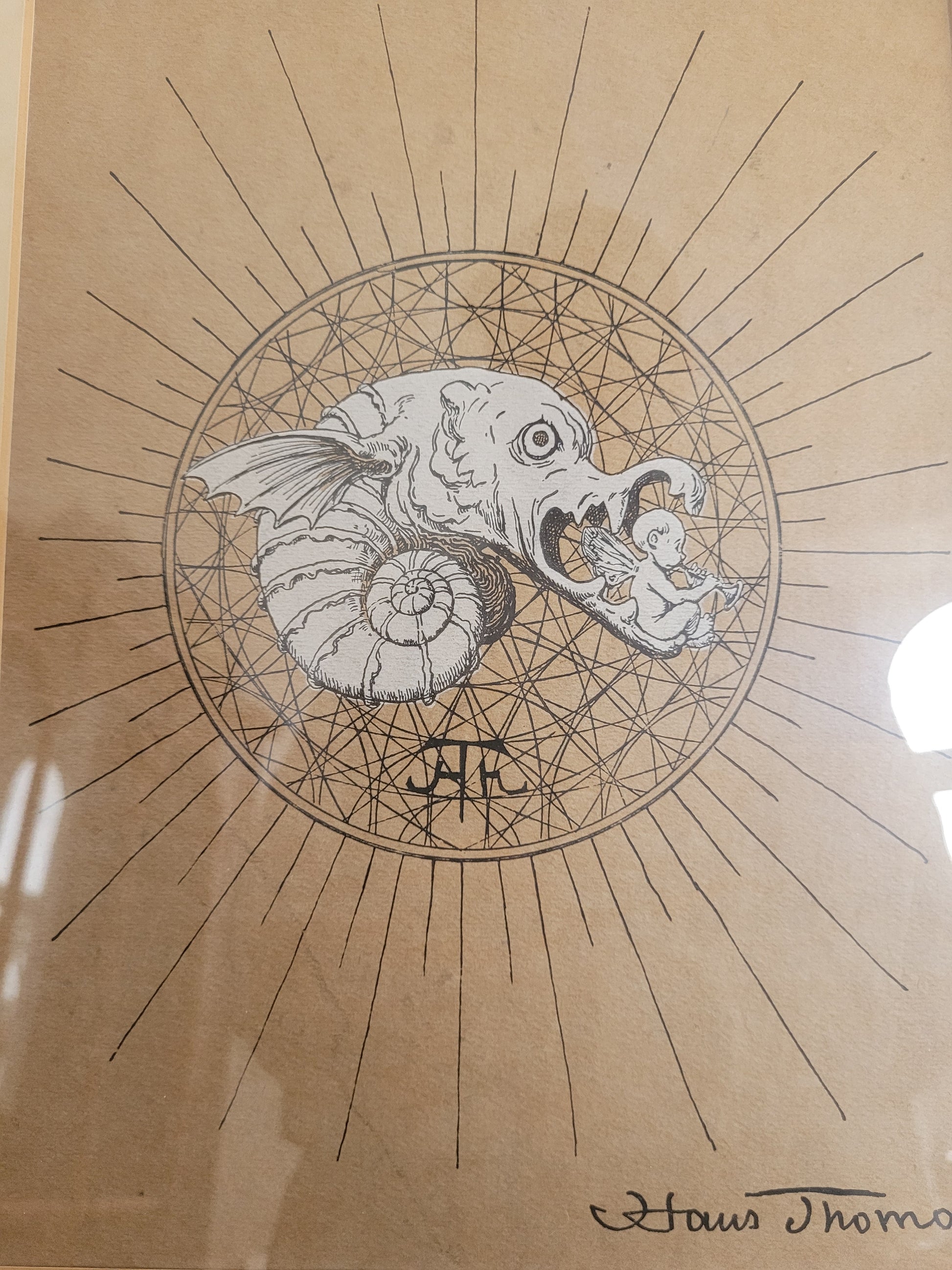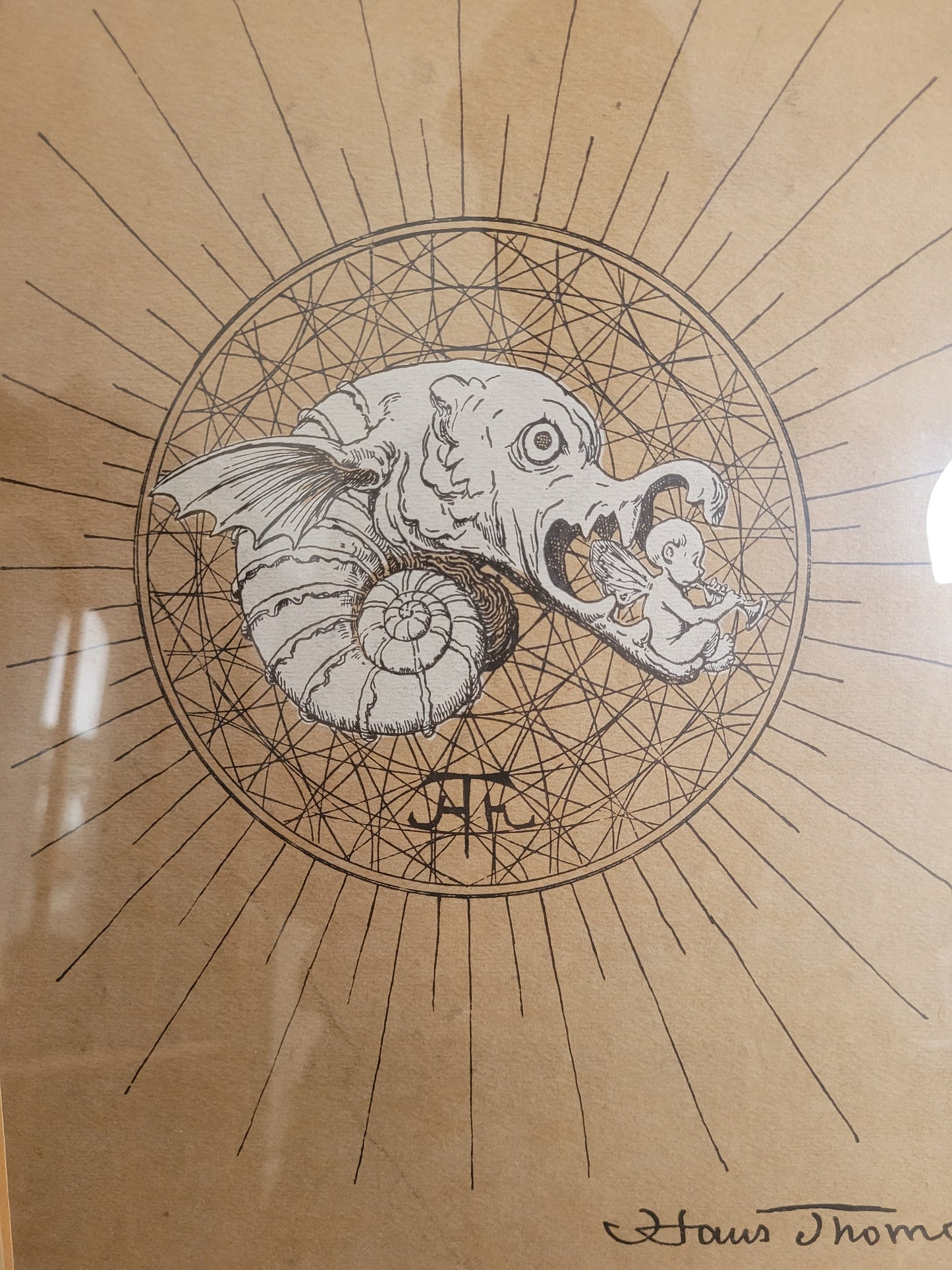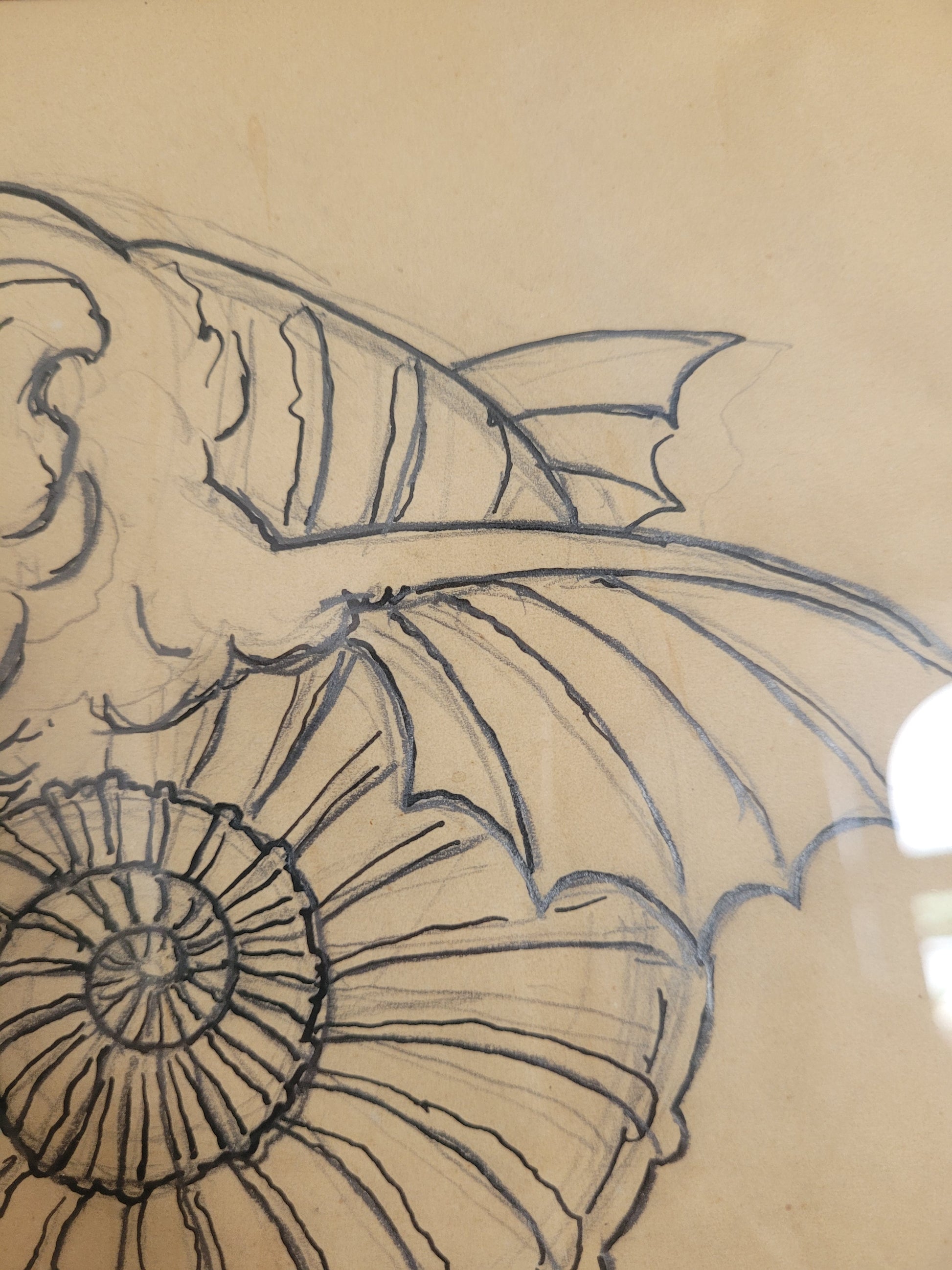 Tauchen Sie ein in die fantastische Bildwelt von Hans Thoma: Diese außergewöhnliche, handsignierte Radierung zeigt ein geflügeltes Schneckenfabelwesen in Begleitung eines Putto – eine märchenhafte Szene voller Anmut, Ironie und geheimnisvoller Symbolik.