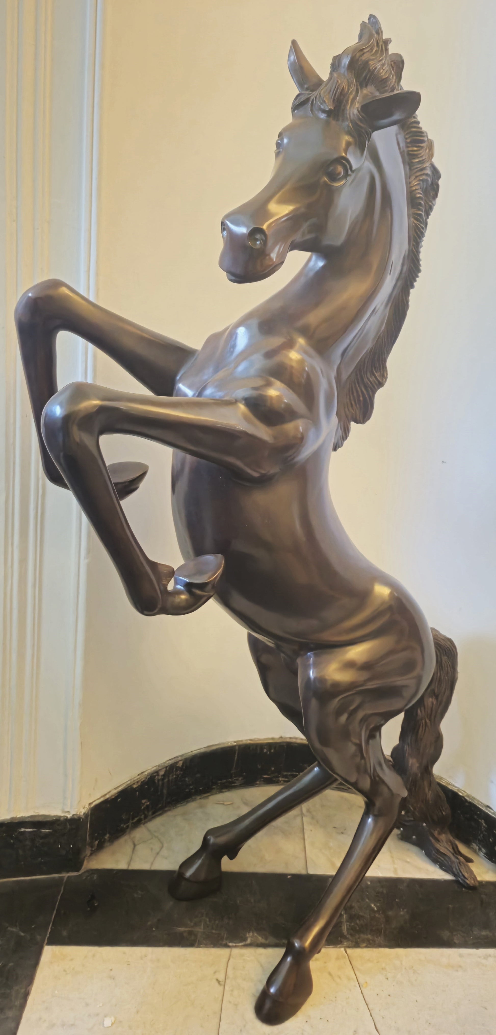 Diese eindrucksvolle Bronze-Skulptur eines aufbäumenden Vollblutpferdes verkörpert Kraft, Eleganz und Dynamik in vollendeter Form. Der majestätische Hengst wurde mit großer Liebe zum Detail gestaltet – von der angespannten Muskulatur über den stolzen Kopf bis hin zur wehenden Mähne. Die Pose des Pferdes verleiht der Skulptur eine lebendige Ausstrahlung und macht sie zu einem Blickfang in jedem Außen- oder Innenbereich.