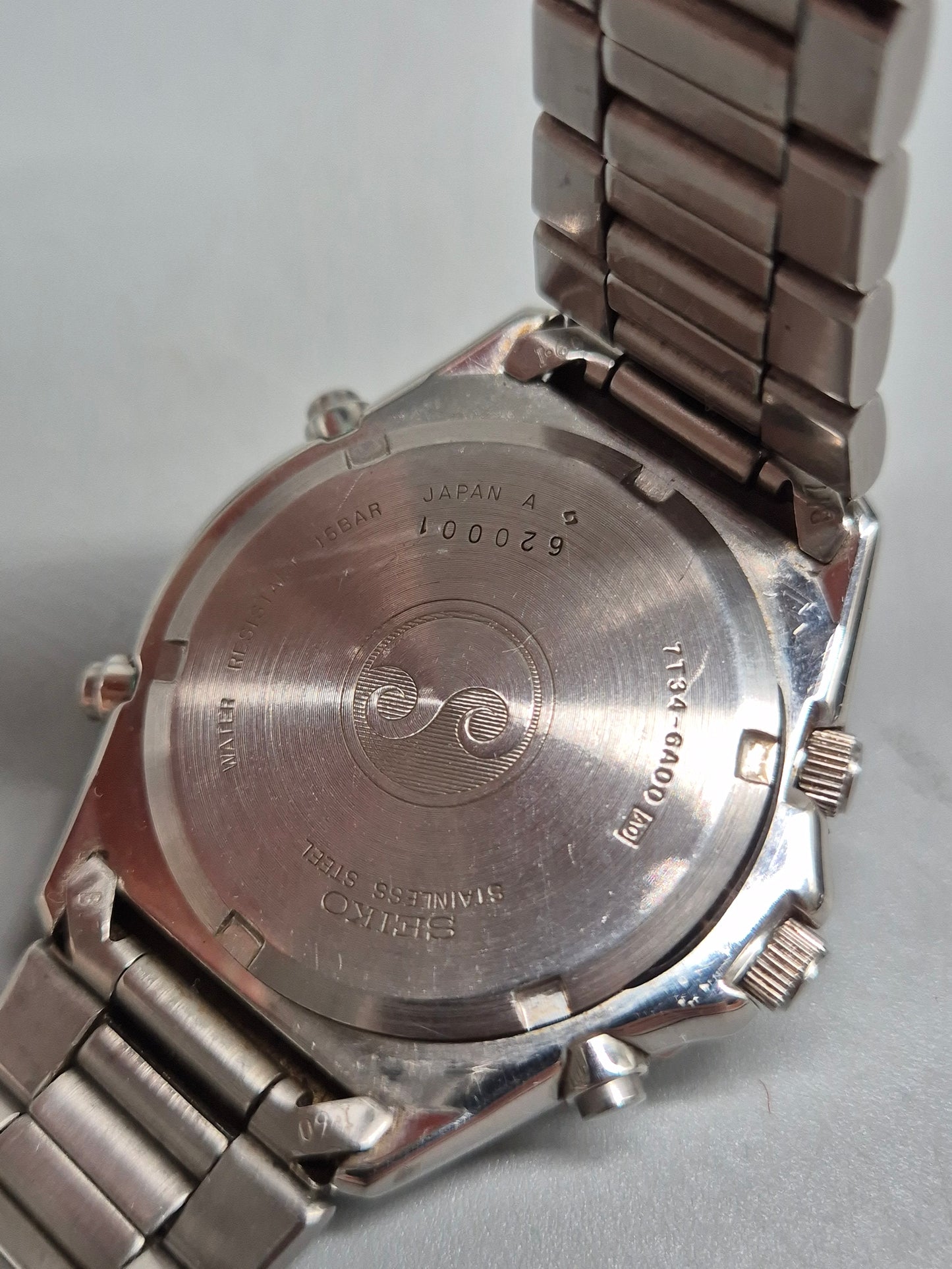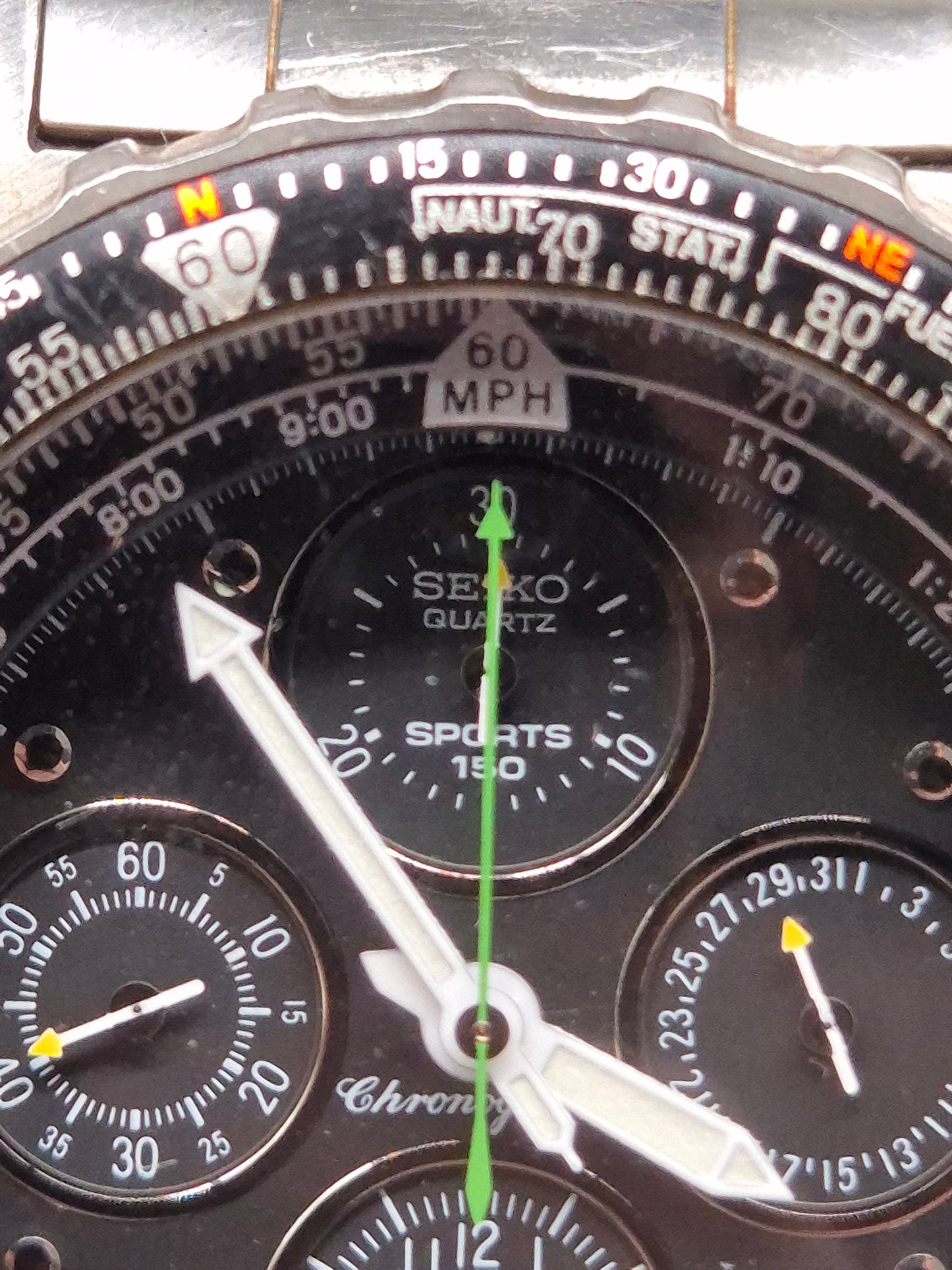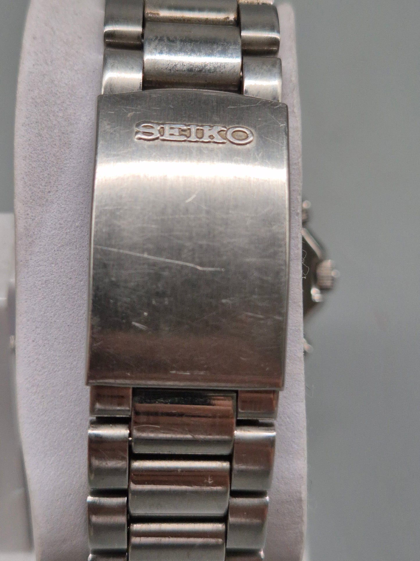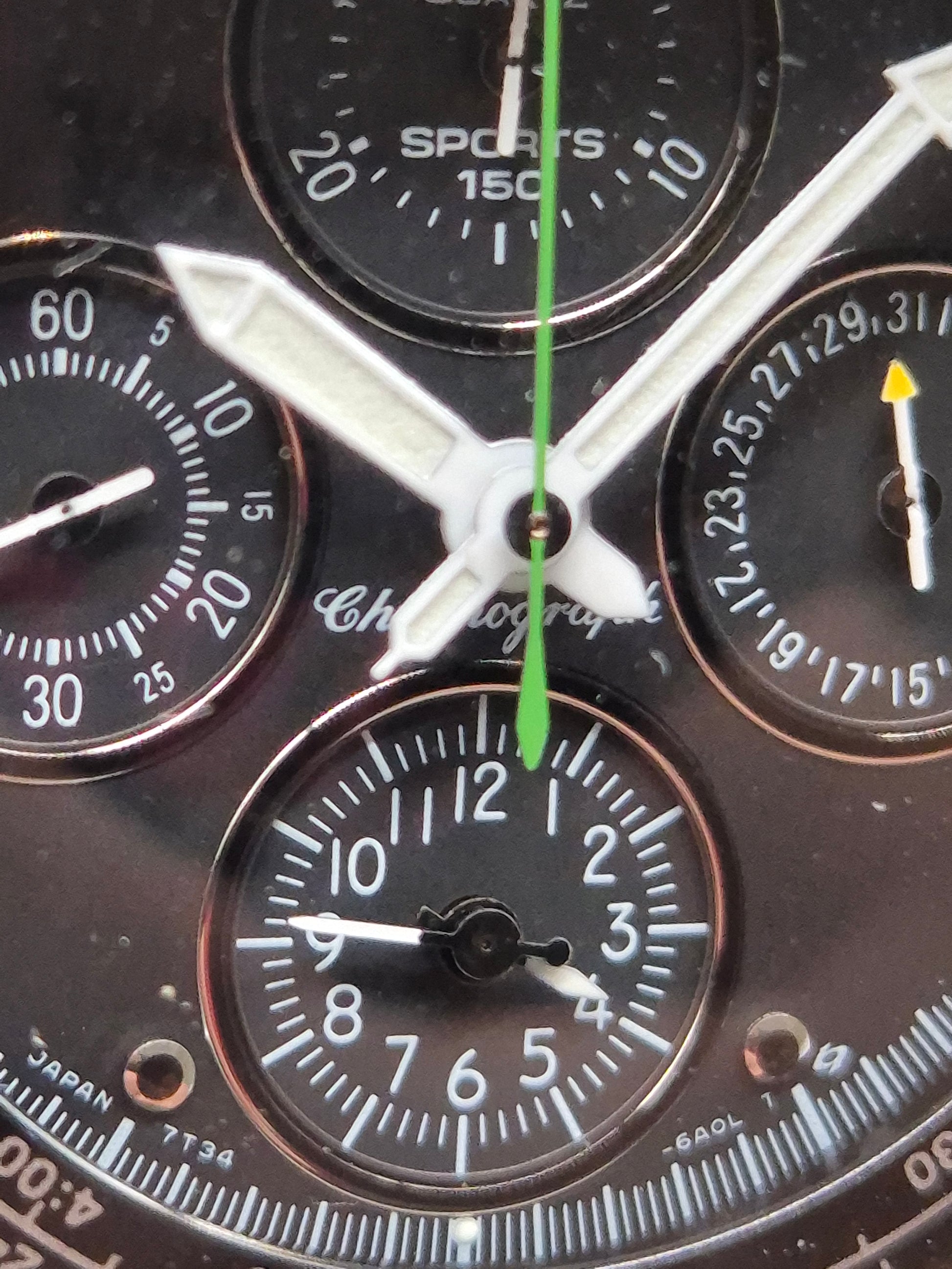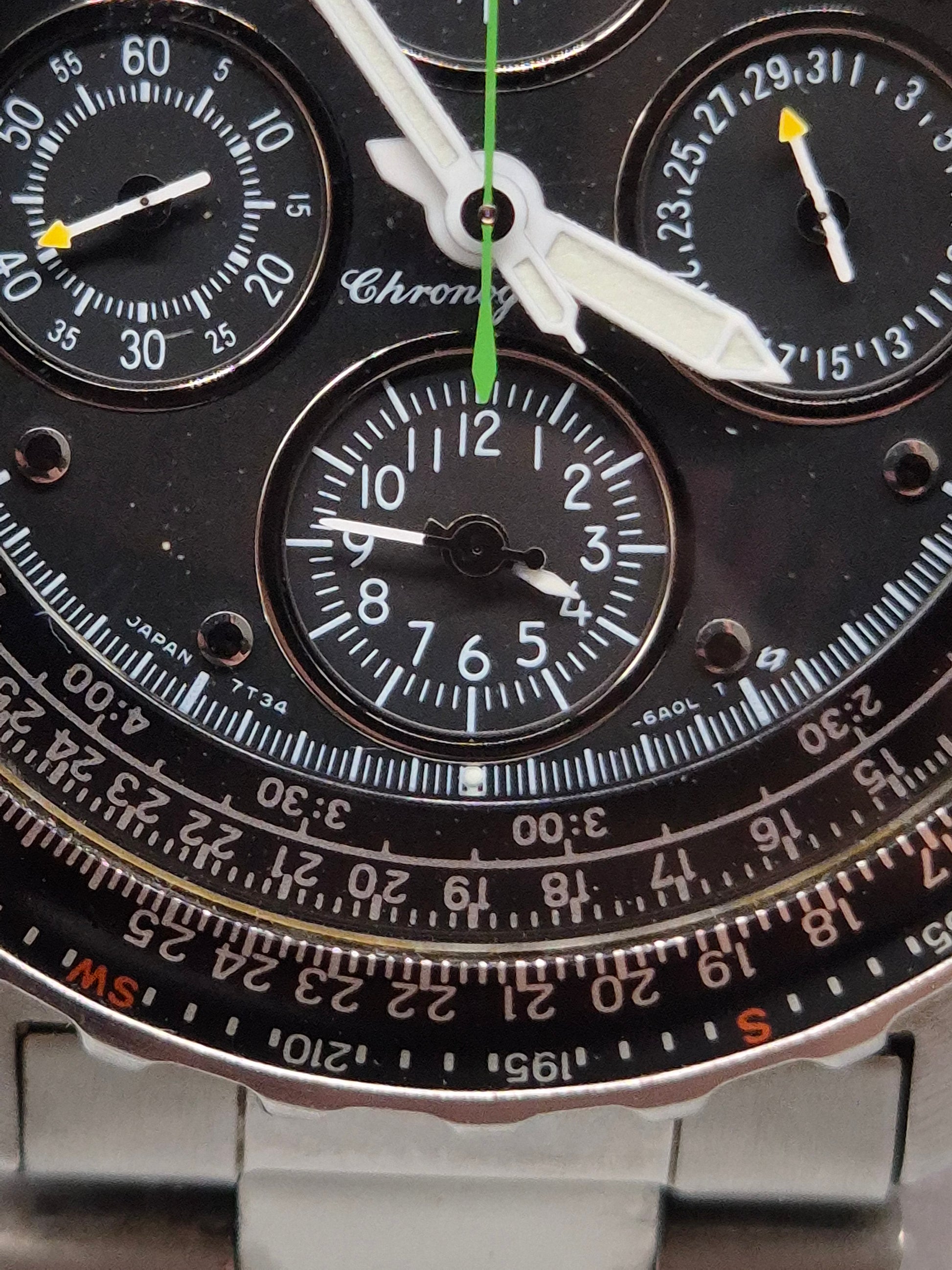 Diese Seiko Sports 150 Herren Uhr im Flightmaster‑Stil überzeugt durch ihr facettenreiches Design und vielzählige Funktionen. Die drehbare Lünette mit Rechenschieber-Skala, kombiniert mit kräftigen Leuchtzeigern und dem grünen Chrono-Sekundenzeiger, verleiht der Uhr ihren authentischen Pilot-Look. Neben der Stoppuhr (Sekunde, Minute, Stunde) bietet sie eine Datumsanzeige sowie eine zusätzliche 24‑Stunden-Skala. Das robuste Edelstahlgehäuse mit ca. 45 mm Durchmesser und dem originalen Gliederband vermittelt eine sportlich-maskuline Ausstrahlung. Auf der Rückseite ist das Kaliber 7T34‑6A00 markiert, bis 15 Bar (150 m) wasserdicht – technisch geprüft mit frisch gewechselter Batterie. Typische Gebrauchsspuren am Gehäuse und Band unterstreichen den Vintage-Charakter.