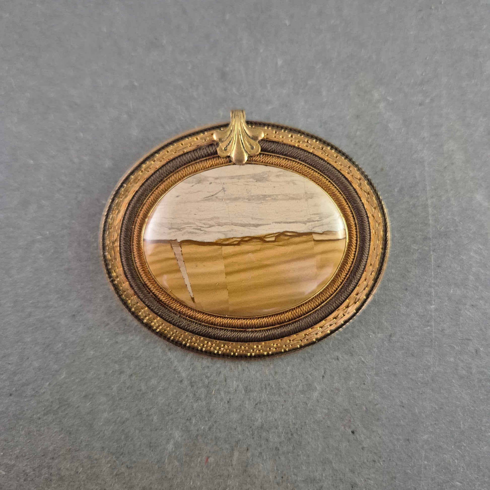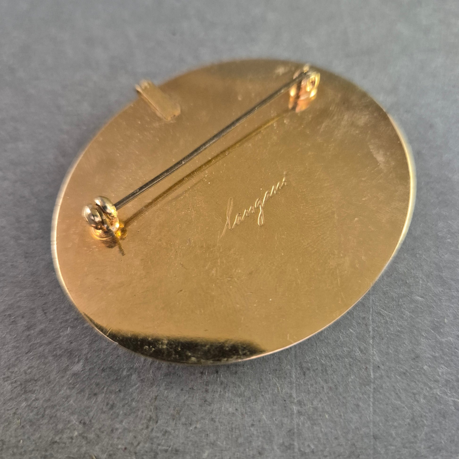 Diese seltene, signierte Vintage-Brosche der renommierten Schmuckmarke Langani vereint handwerkliche Qualität mit natürlicher Eleganz. Der ovale Naturstein zeigt eine einzigartige Maserung in warmen Beige- und Brauntönen, eingefasst in eine fein strukturierte, vergoldete Metallfassung. Typisch für Langani ist die Liebe zum Detail und die edle Materialkombination – ein stilvolles Sammlerstück mit geschichtlichem Flair.