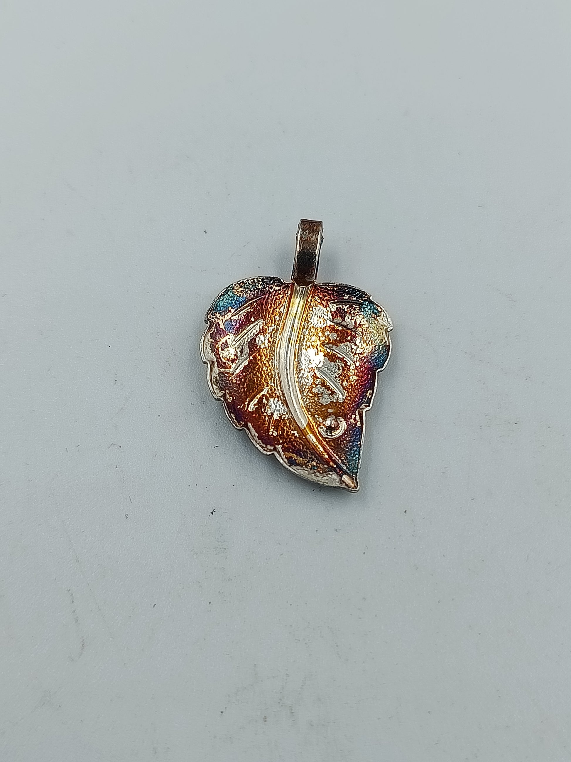 Wunderschöner Silberanhänger in eleganter Blattform mit feiner Struktur und einem edlen Farbverlauf in Gold-, Kupfer- und Blautönen. Der kleine dunkle Stein am unteren Ende verleiht dem Schmuckstück einen edlen Akzent. Ideal als Anhänger für eine feine Silberkette oder als besonderer Blickfang an einem Lederband.