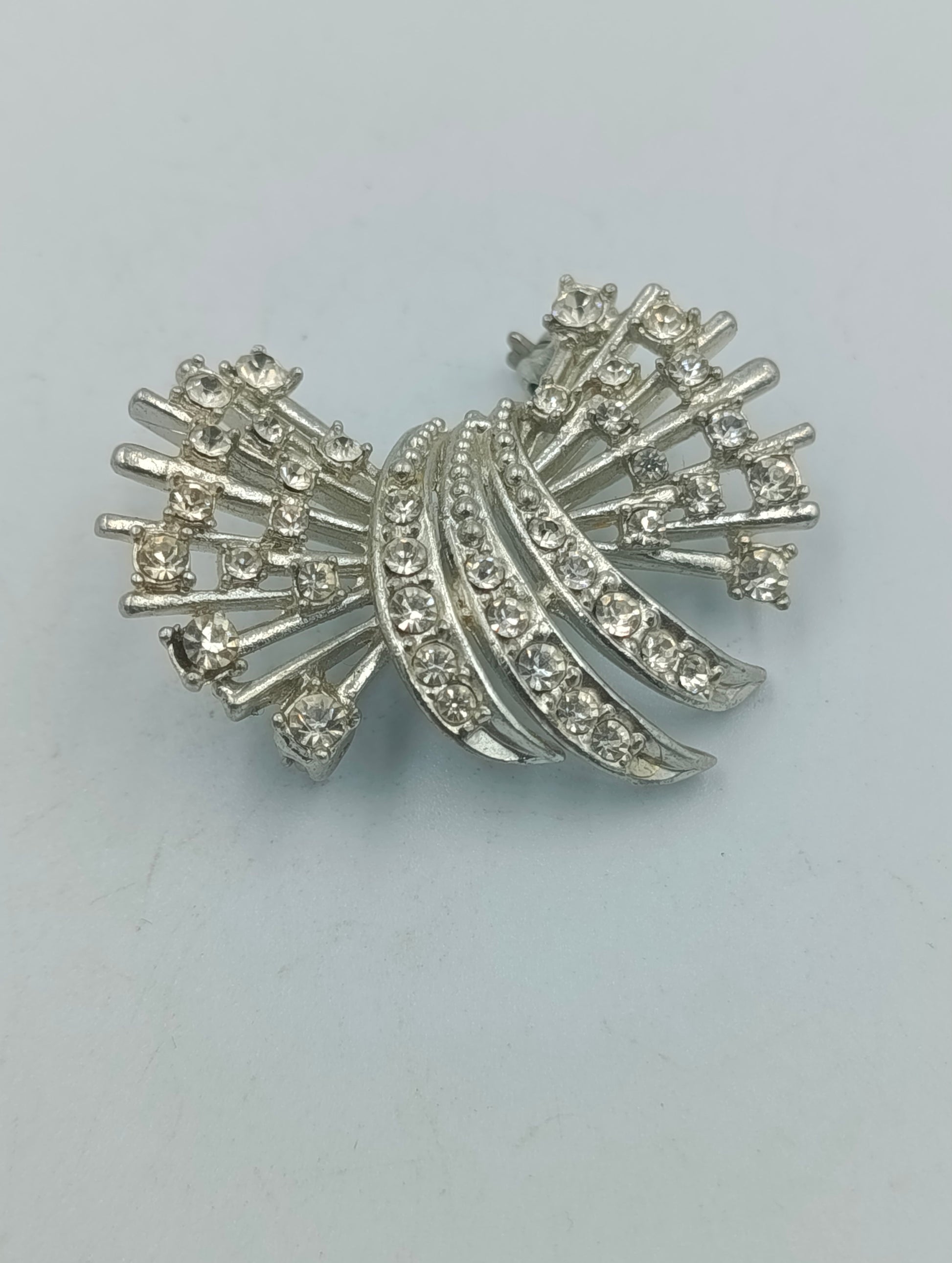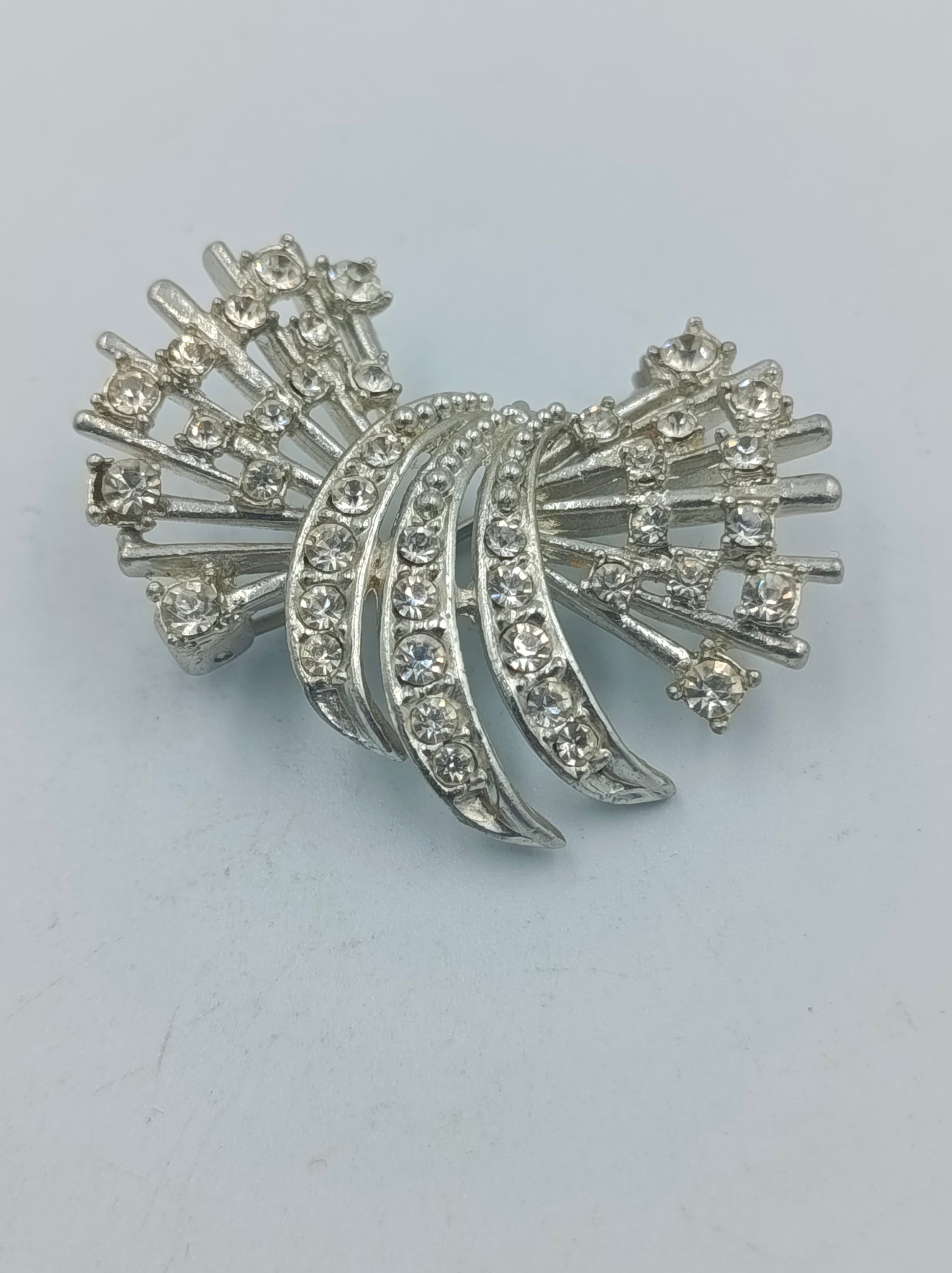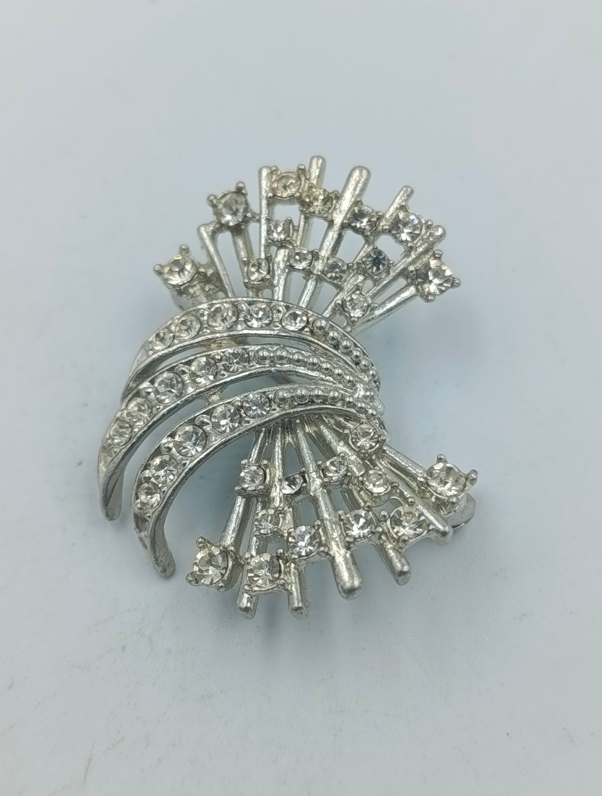 Elegante Vintage-Brosche in Silberoptik mit funkelnden klaren Strasssteinen. Das schwungvolle, fächerförmige Design verleiht der Brosche eine stilvolle Dynamik und sorgt für ein edles Funkeln bei jeder Bewegung. Ideal als elegantes Accessoire für Blazer, Schals oder festliche Kleidung.