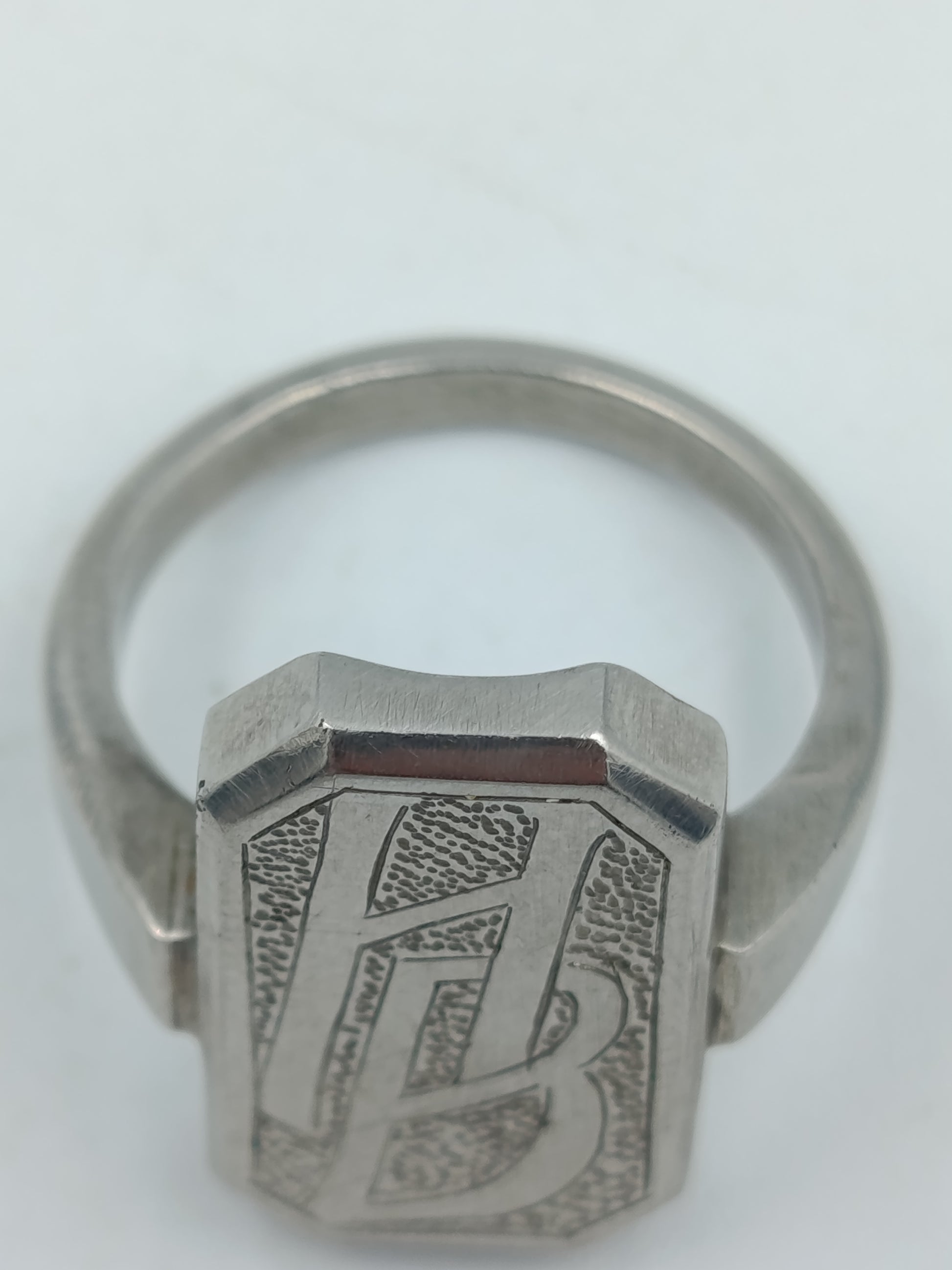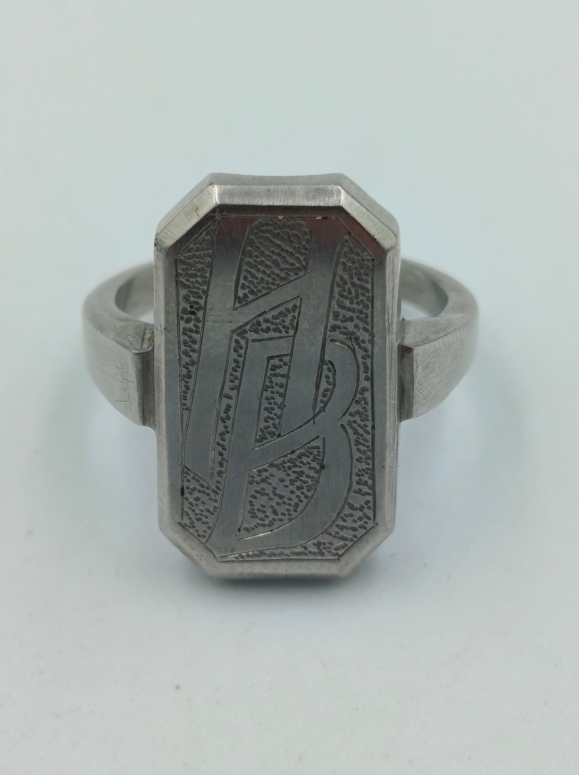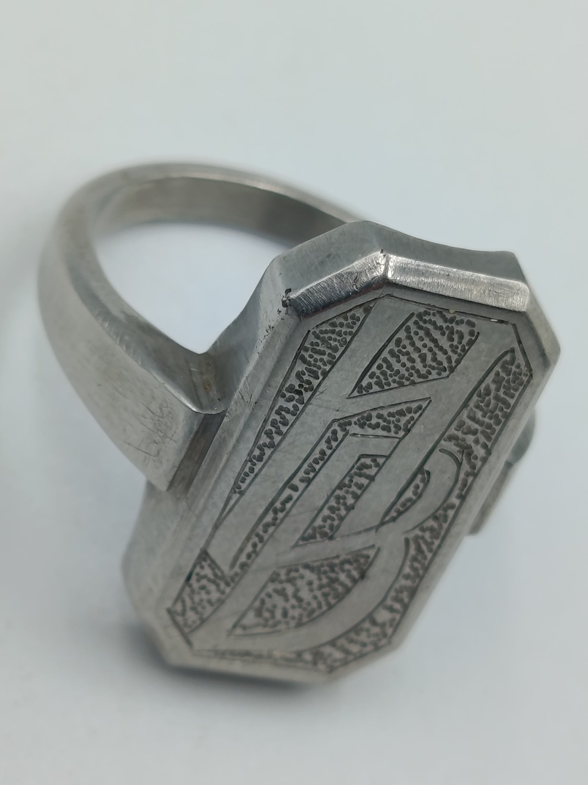 Markanter Siegelring in silberfarbener Optik mit rechteckiger, gravierter Platte. Das Reliefmuster verleiht dem Ring einen robusten und maskulinen Charakter – ideal als Statement-Schmuckstück.