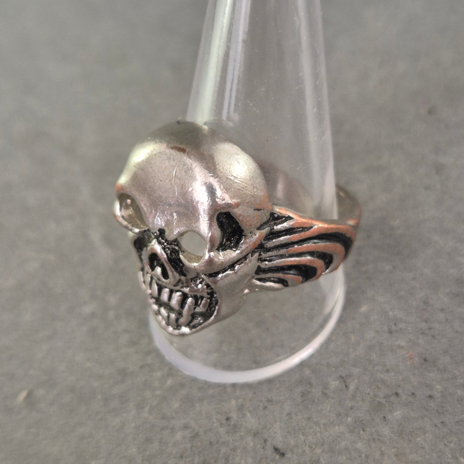 Dieser auffällige Totenkopf-Ring im Rocker-Stil ist ein echter Blickfang für Liebhaber markanter Accessoires. Gefertigt aus silberfarbenem Metall, kombiniert er einen detaillierten Schädel mit geschwungenen Linien an den Seiten, die dem Ring eine aggressive, rebellische Note verleihen. Ideal für Biker, Gothic-Fans oder als außergewöhnliches Statement-Piece im Alltag.