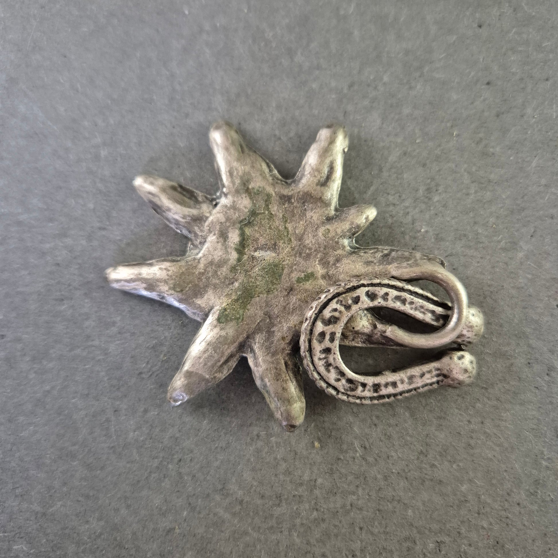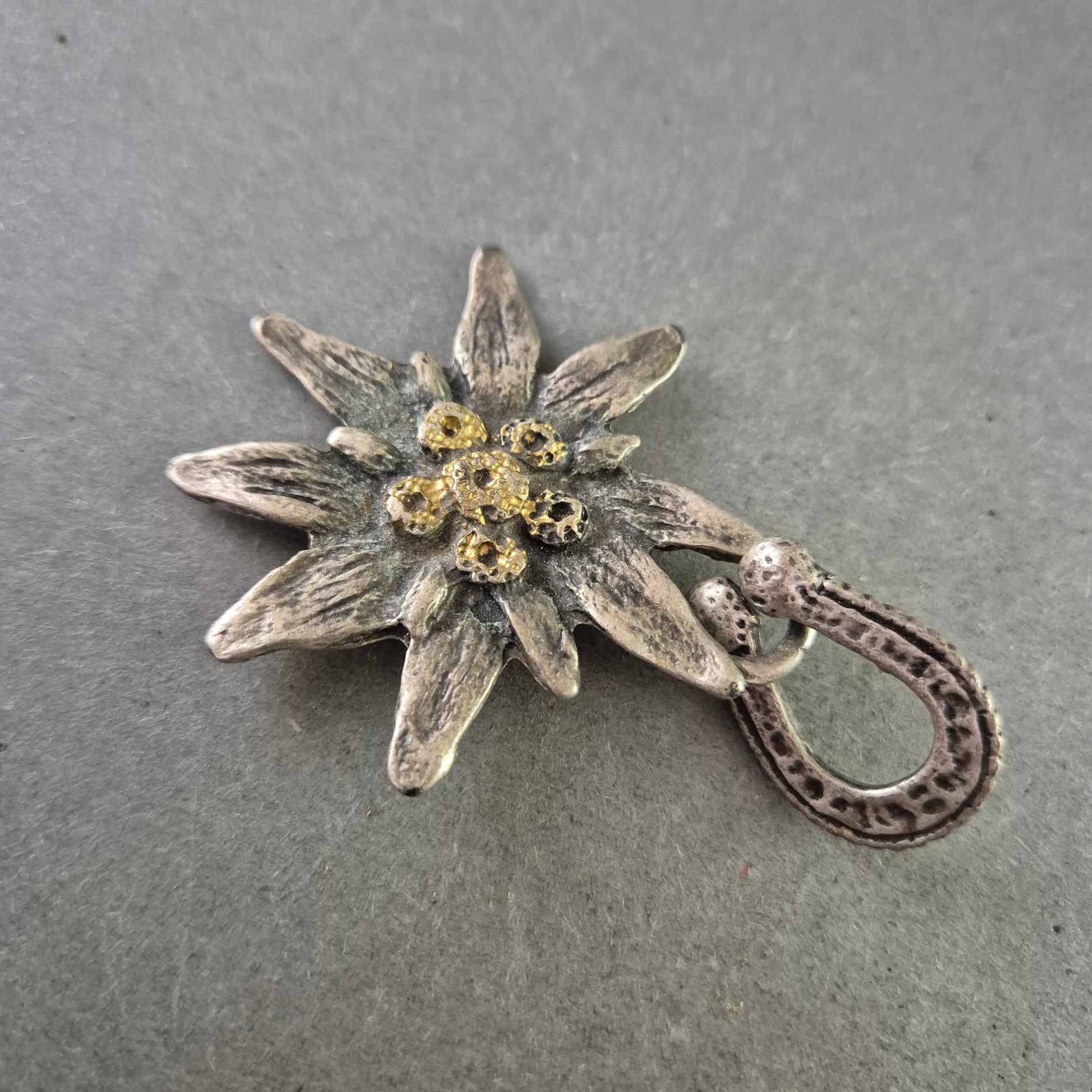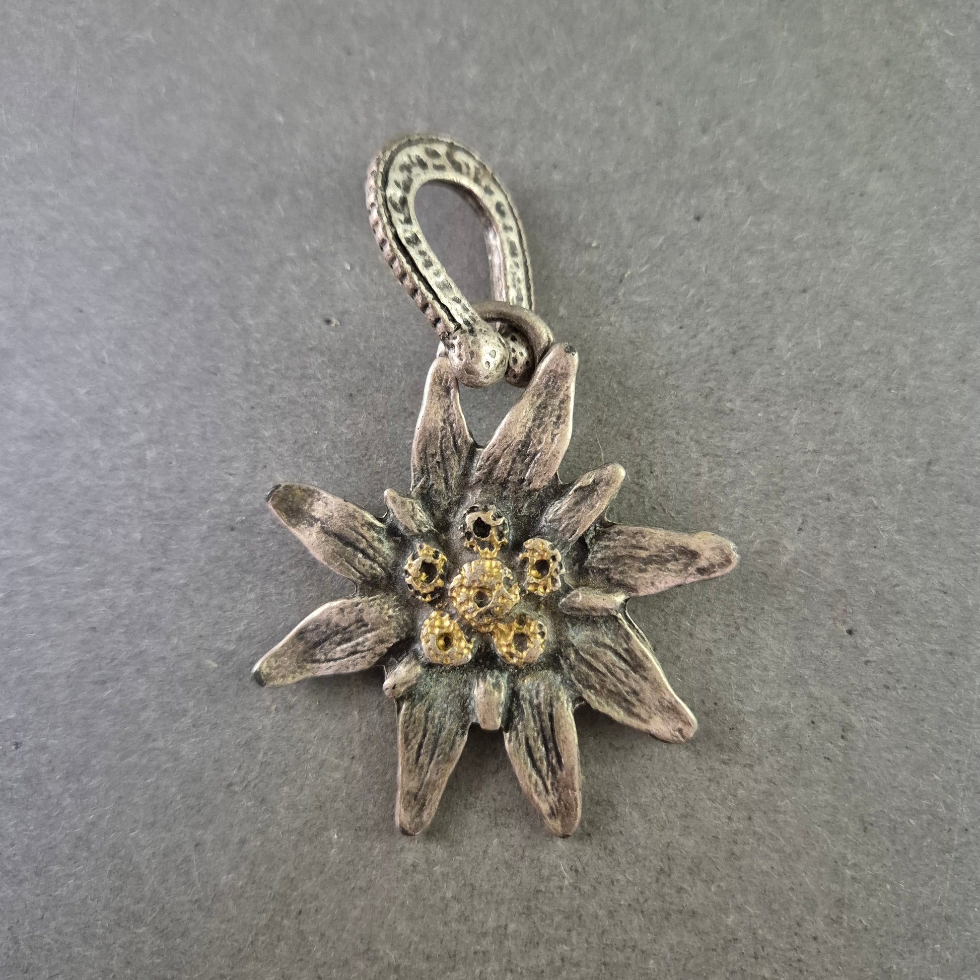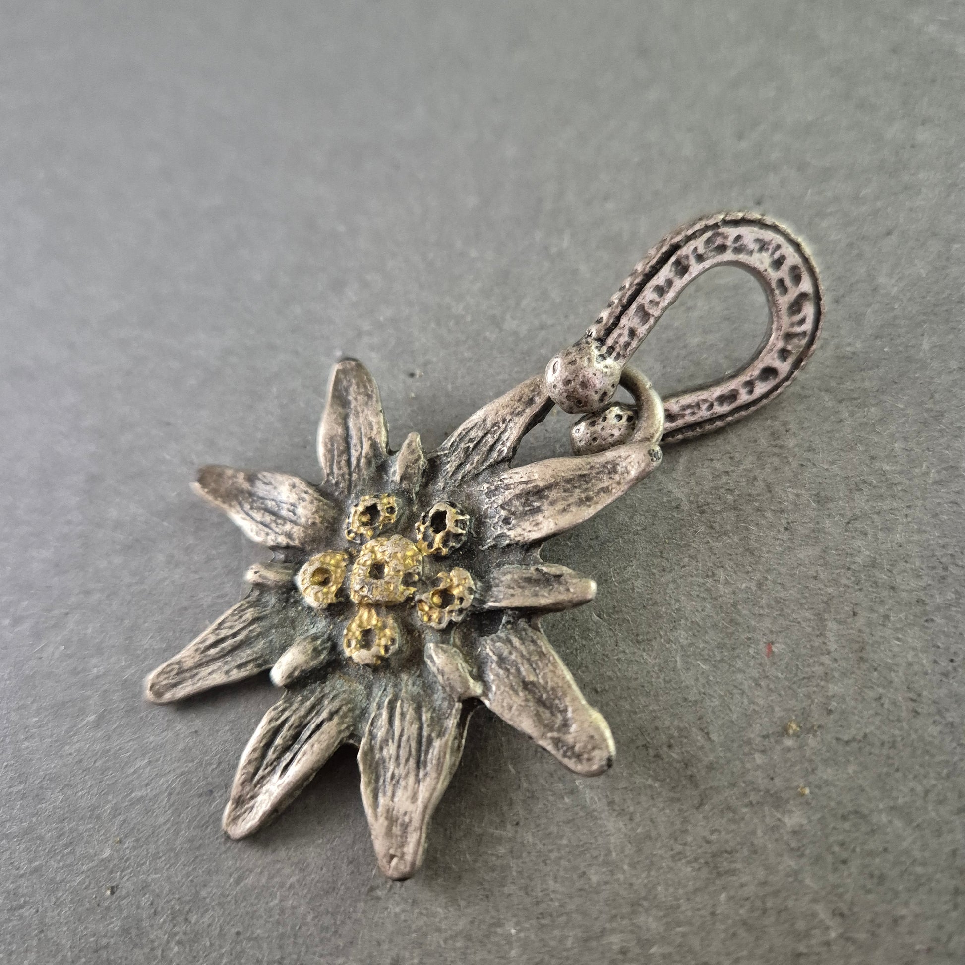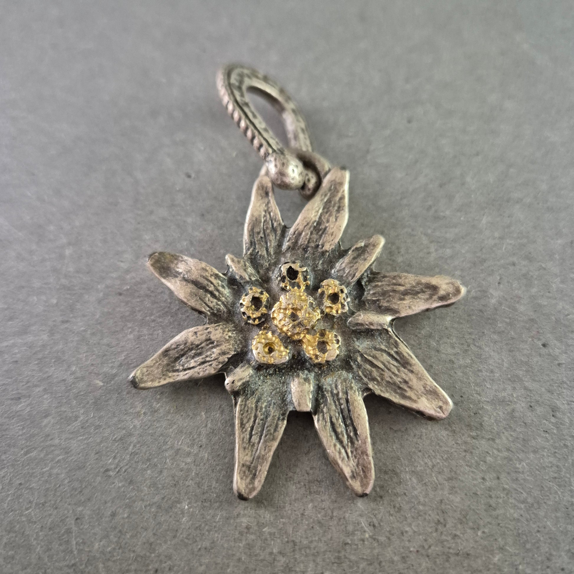Dieser charmante Edelweiß-Anhänger bringt die Magie der Alpenwelt in Ihr Schmuckkästchen. Gefertigt aus silberfarbenem Metall mit goldfarbenen Akzenten im Blütenzentrum, verkörpert dieses Accessoire alpine Tradition mit rustikalem Charakter. Die markanten Details und das leicht gealterte Finish machen den Anhänger zu einem echten Blickfang – ob am Lederband oder an einer feinen Kette getragen.