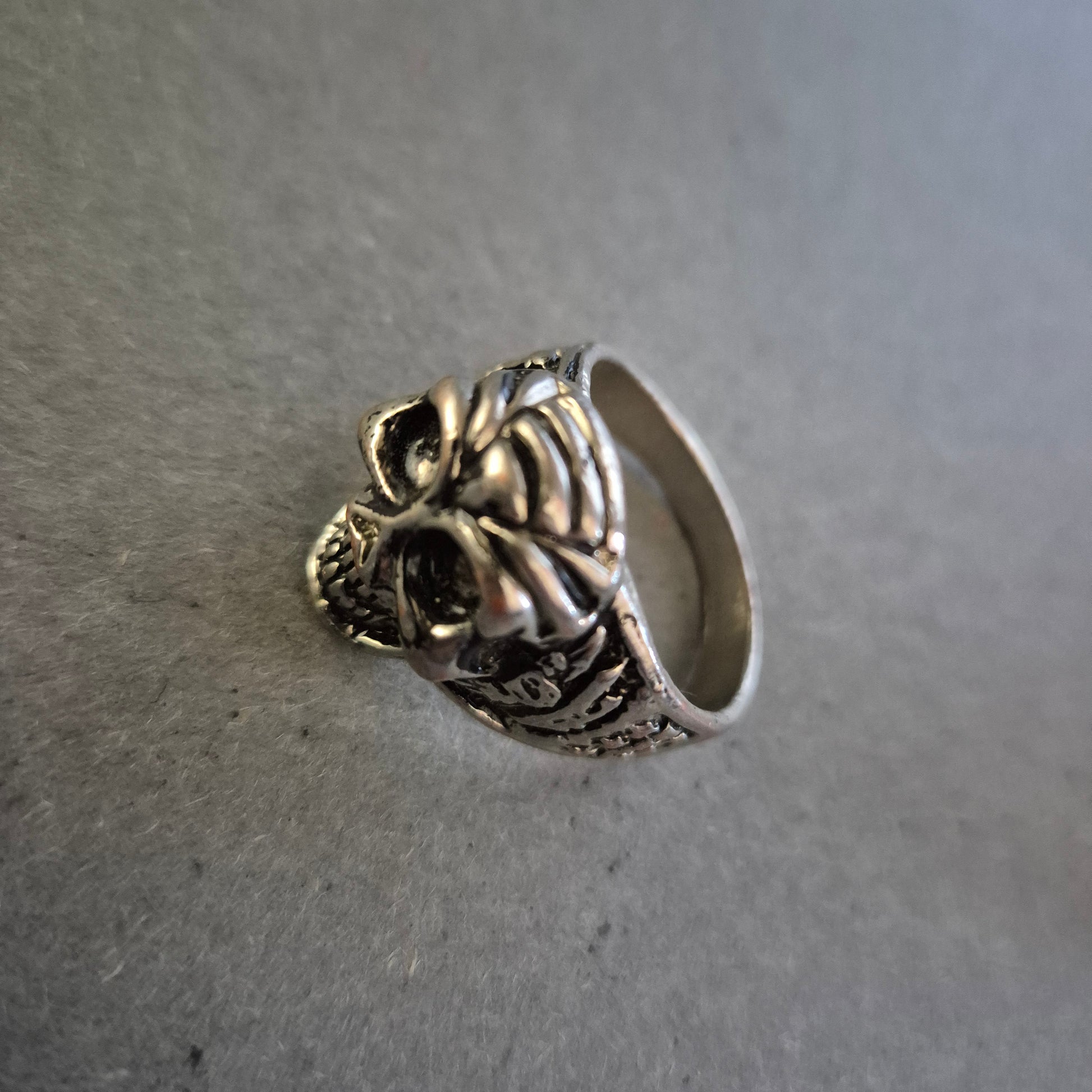 Dieser kraftvolle Totenkopf-Ring aus silberfarbenem Metall zieht mit seinem markanten Tribal-Design und dem furchteinflößenden Schädel garantiert alle Blicke auf sich. Die ausgeprägten Konturen, kombiniert mit dunklen Vertiefungen, erzeugen einen dramatischen Kontrast – ideal für Rocker, Biker und alle, die ihren rebellischen Stil unterstreichen möchten.