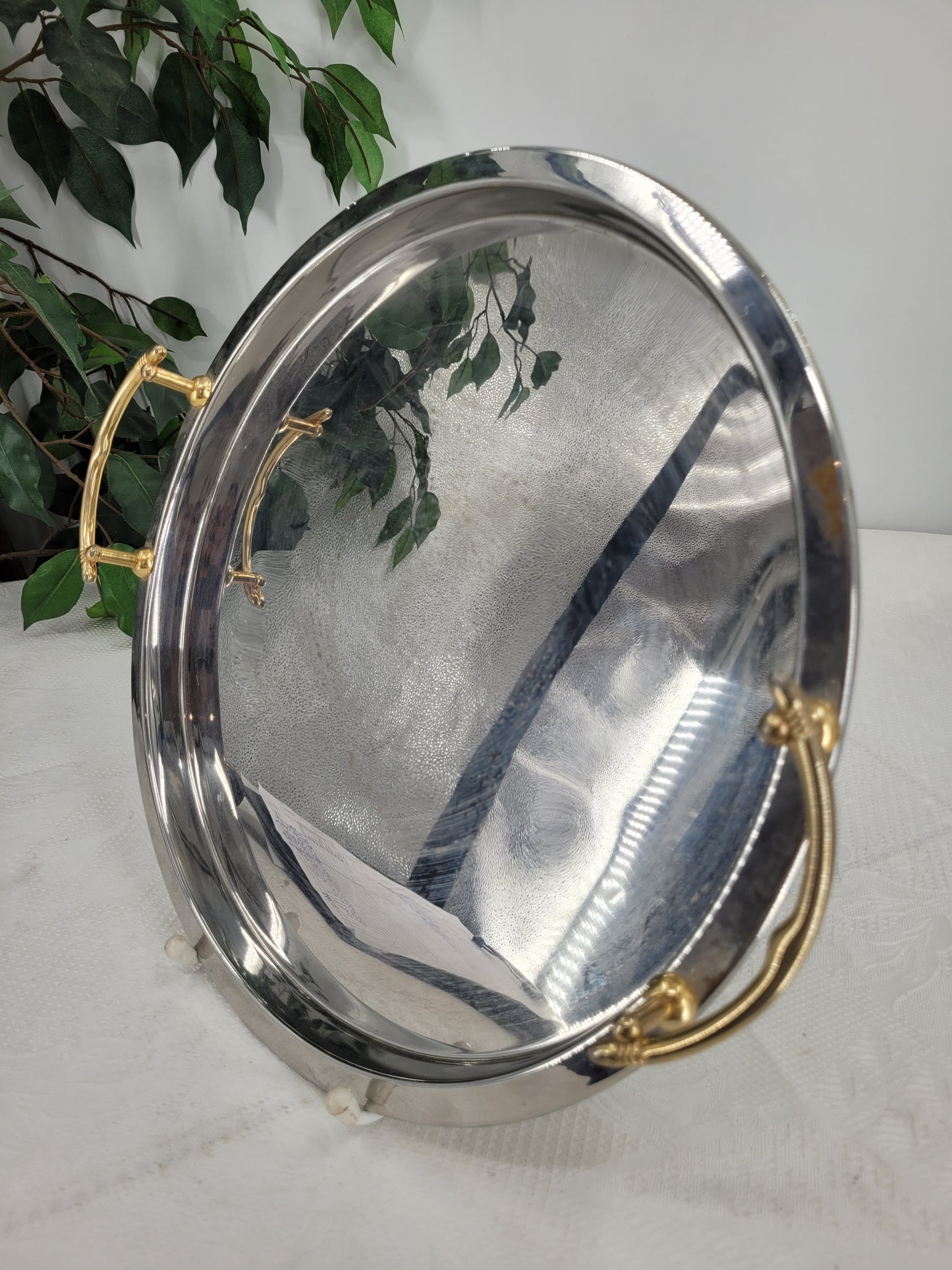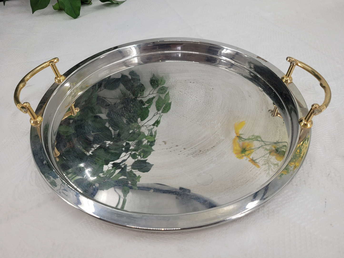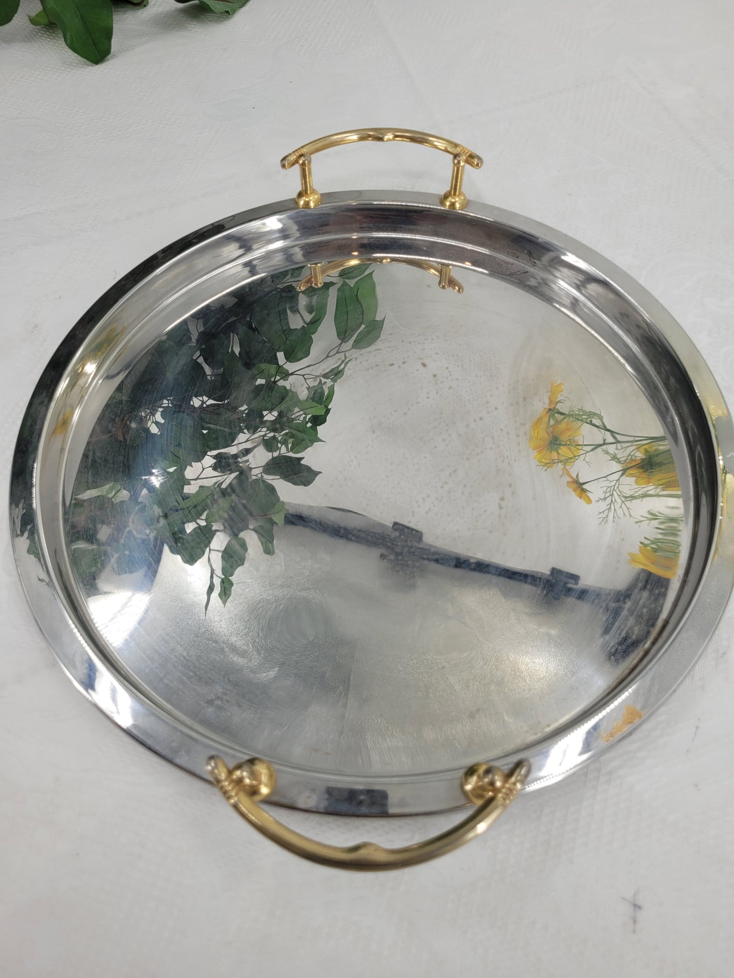 Dieses Silberfarbende Tablett mit goldenen Henkeln ist nicht nur ein praktisches Servierstück, sondern ein Kunstwerk, das die Blicke auf sich zieht. Mit seiner großzügigen Größe und seinem glänzenden Finish wird es zum Mittelpunkt jeder Tafel und zieht bewundernde Blicke auf sich.