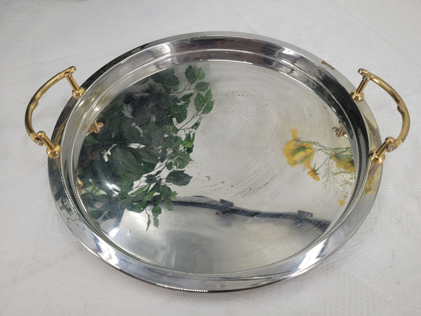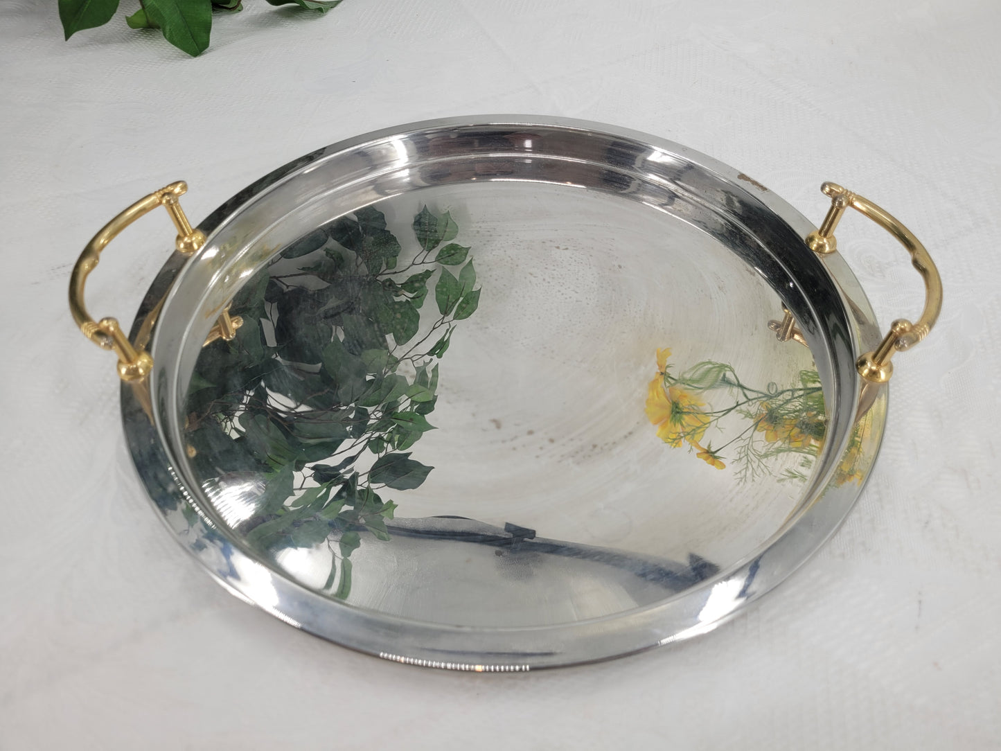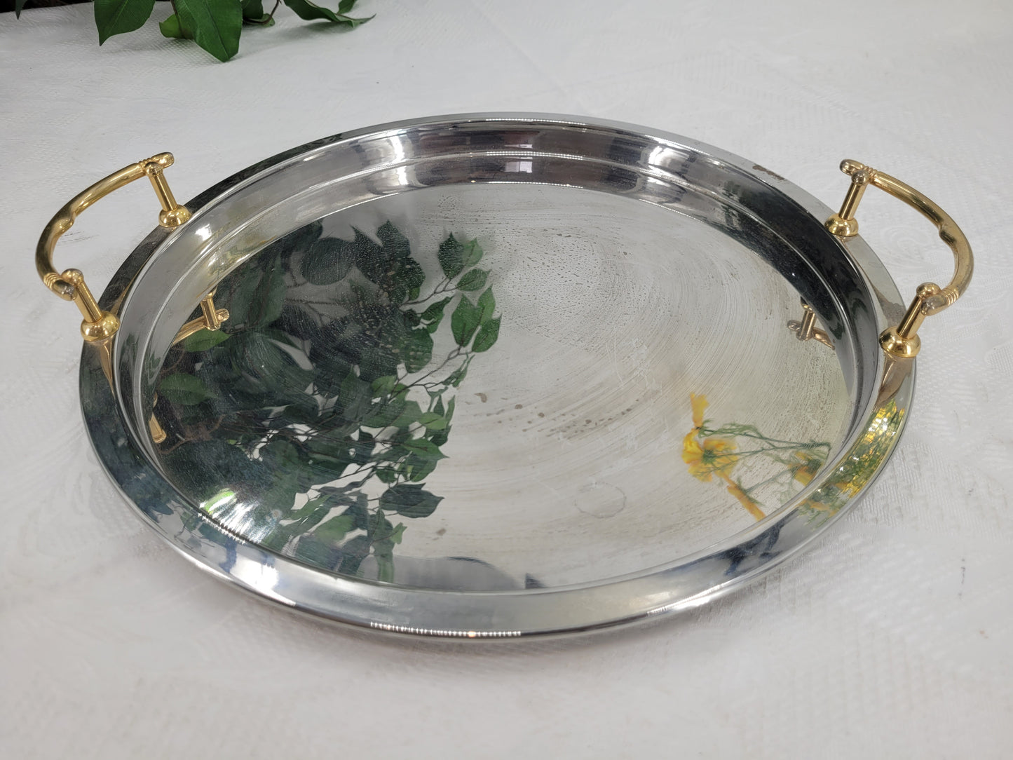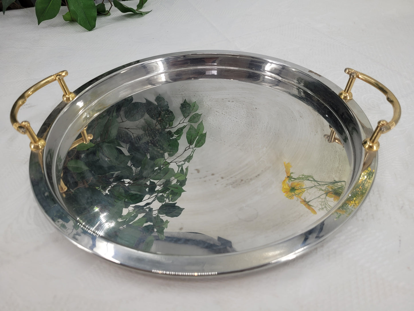 Dieses Silberfarbende Tablett mit goldenen Henkeln ist nicht nur ein praktisches Servierstück, sondern ein Kunstwerk, das die Blicke auf sich zieht. Mit seiner großzügigen Größe und seinem glänzenden Finish wird es zum Mittelpunkt jeder Tafel und zieht bewundernde Blicke auf sich.