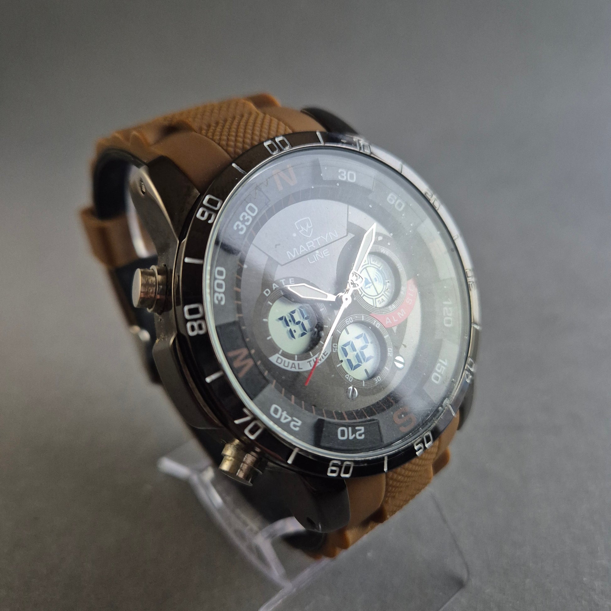 Diese Martyn Line Herrenarmbanduhr vereint markantes Design mit hoher Funktionalität. Das schwarze Zifferblatt mit Kompass-Markierungen bietet eine analoge sowie digitale Anzeige. Das widerstandsfähige Silikonarmband in Braun verleiht der Uhr einen sportlichen Charakter. Mit Chronograph, Dual-Time-Anzeige und Alarm ist diese Uhr der ideale Begleiter für aktive Männer.