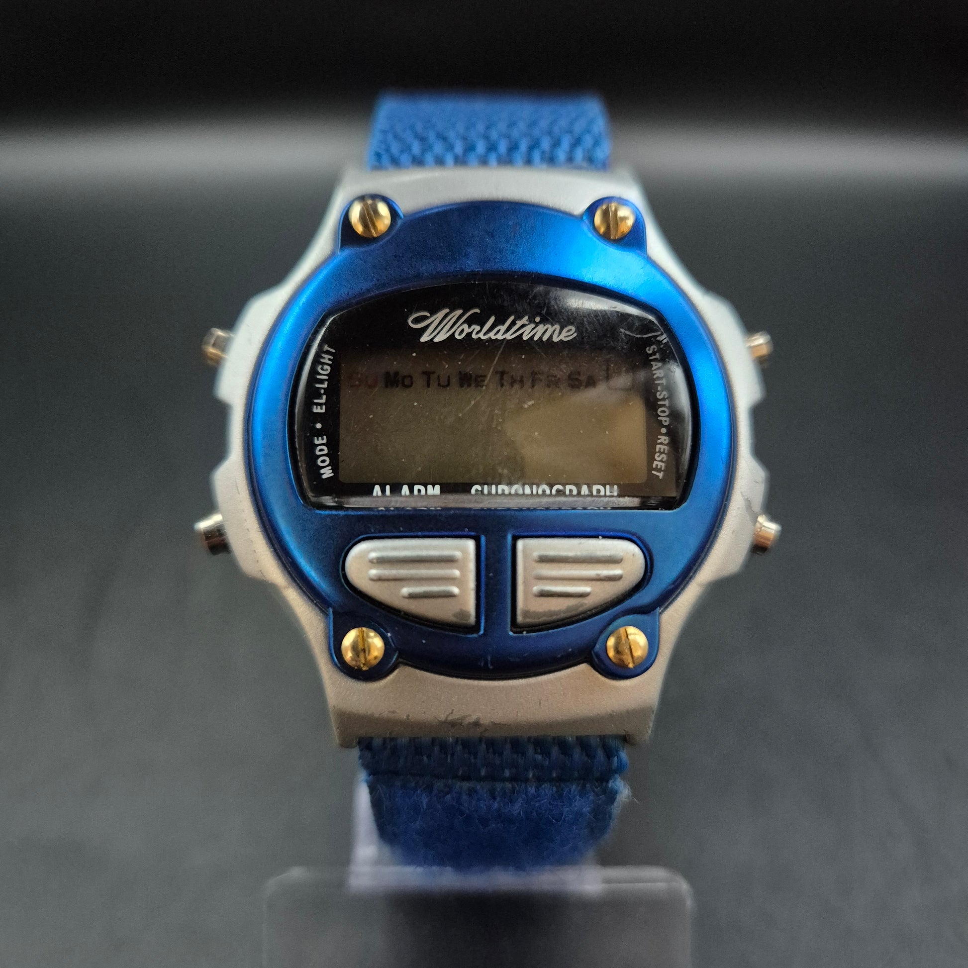 Diese digitale Herren Uhr der Marke Worldtime überzeugt mit einem robusten Gehäuse und einem auffälligen blauen Design. Das breite Stoffarmband bietet angenehmen Tragekomfort und festen Halt. Die Uhr verfügt über klassische Digitalfunktionen wie Alarm, Chronograph, Wochentagsanzeige und Hintergrundbeleuchtung. Ideal für sportliche Aktivitäten oder als Retro-Accessoire im Alltag.