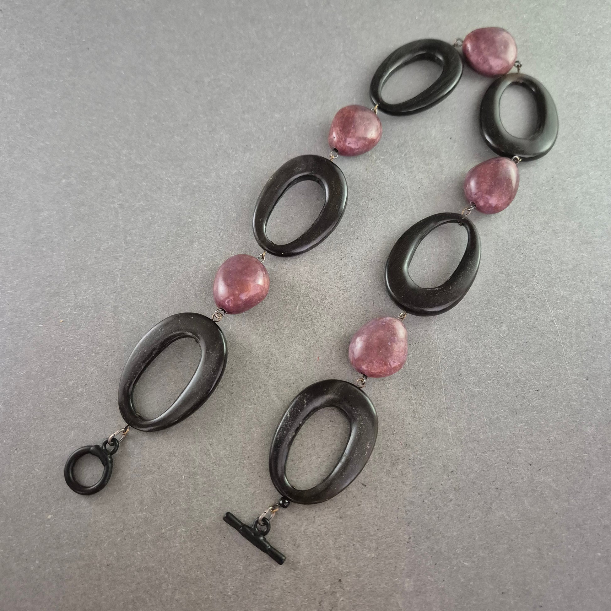 Diese auffällige Statement-Kette kombiniert große ovale Glieder in mattem Schwarz mit tropfenförmigen violetten Elementen in Steinoptik. Der stabile Knebelverschluss sorgt für einfaches Anlegen und sicheren Halt. Ein markantes Accessoire, das schlichte Outfits sofort aufwertet.