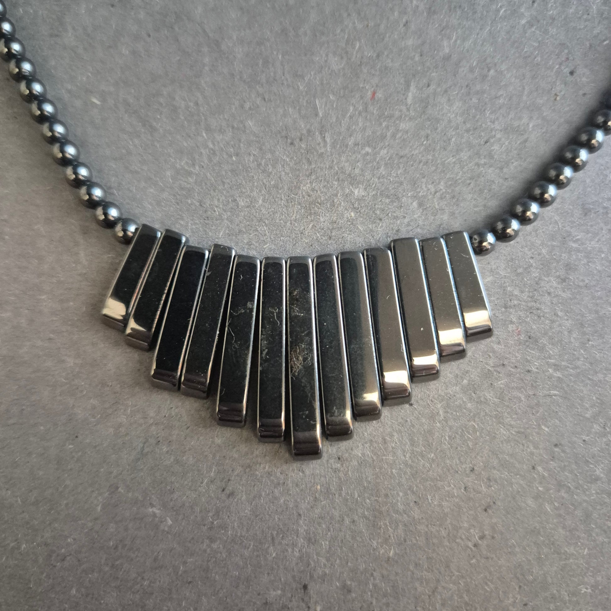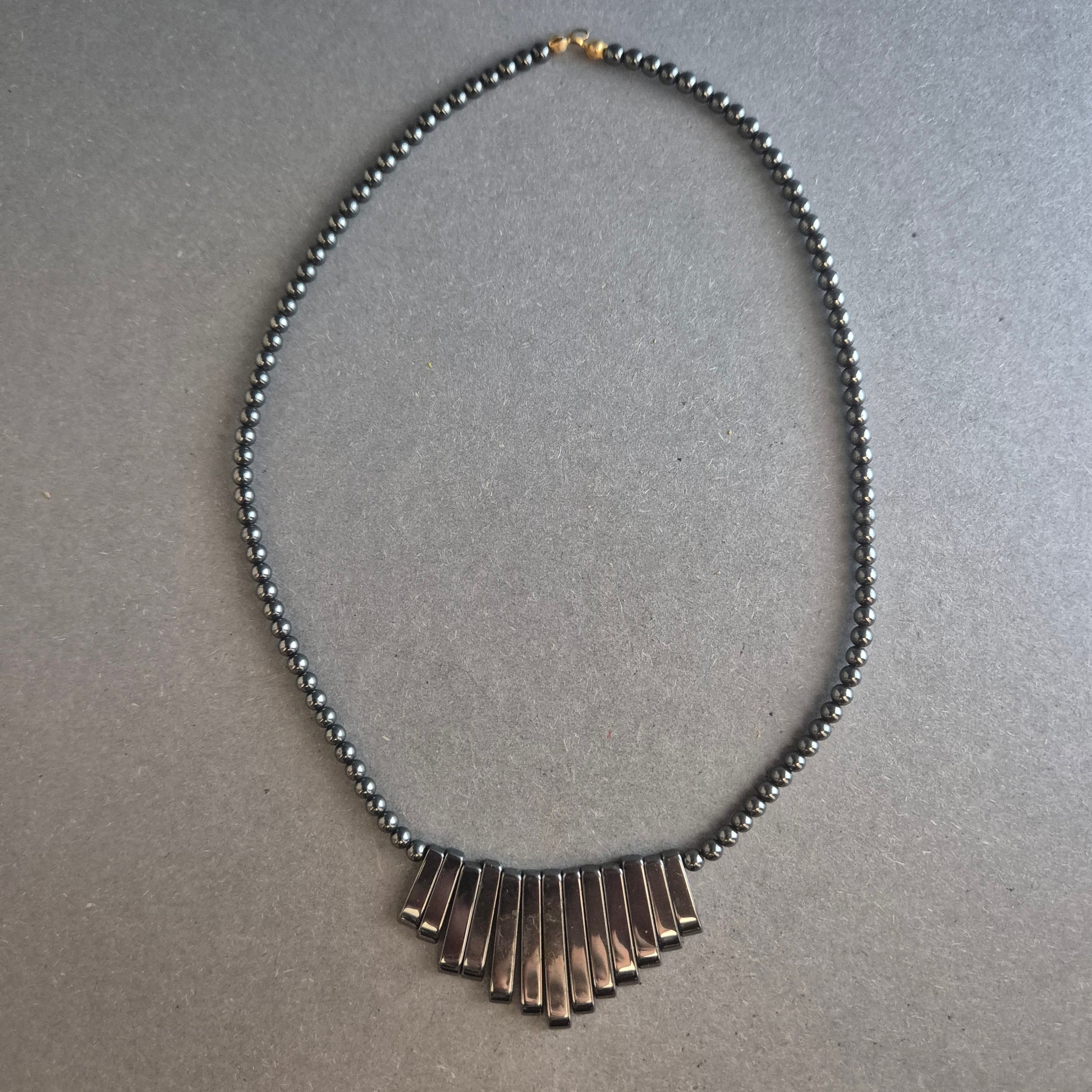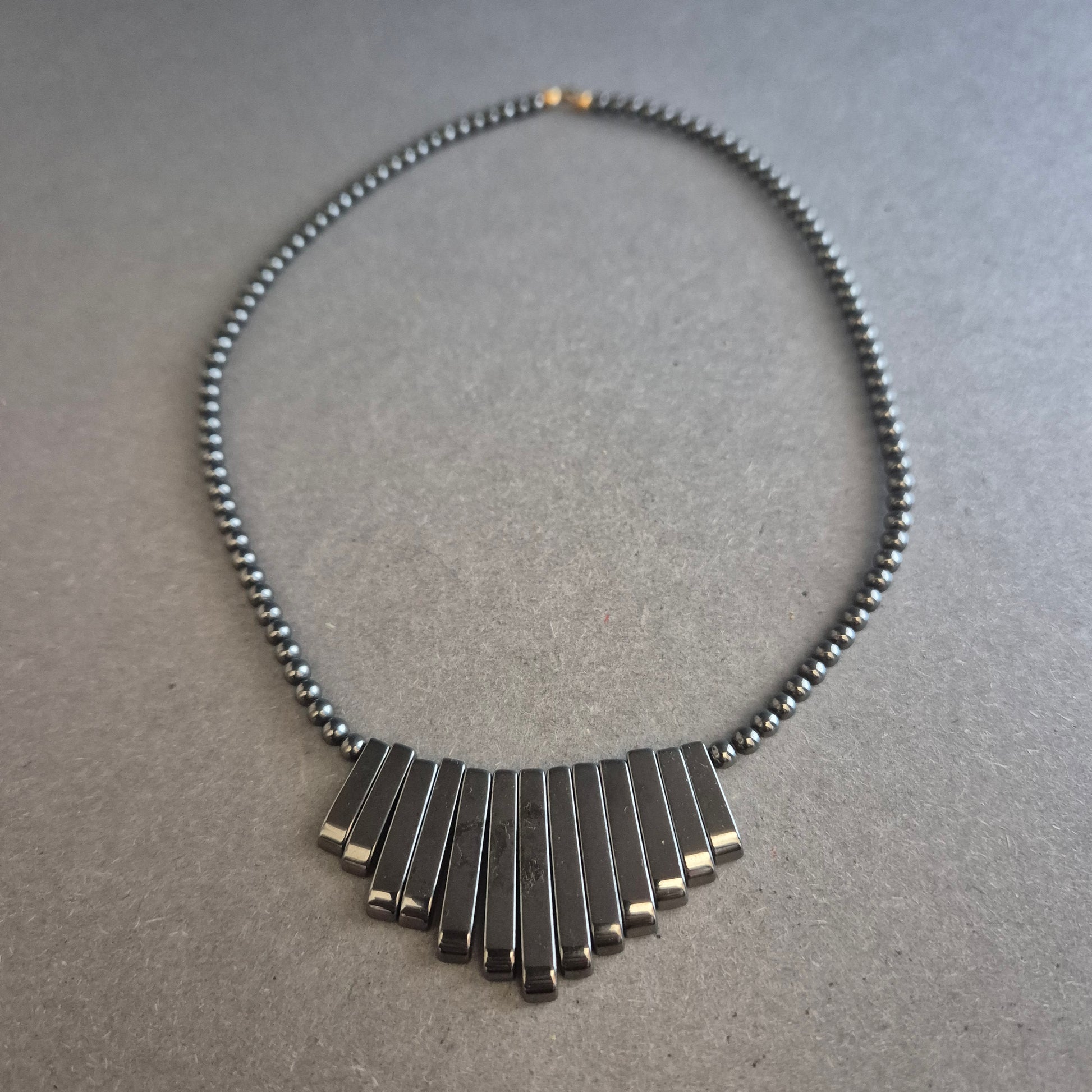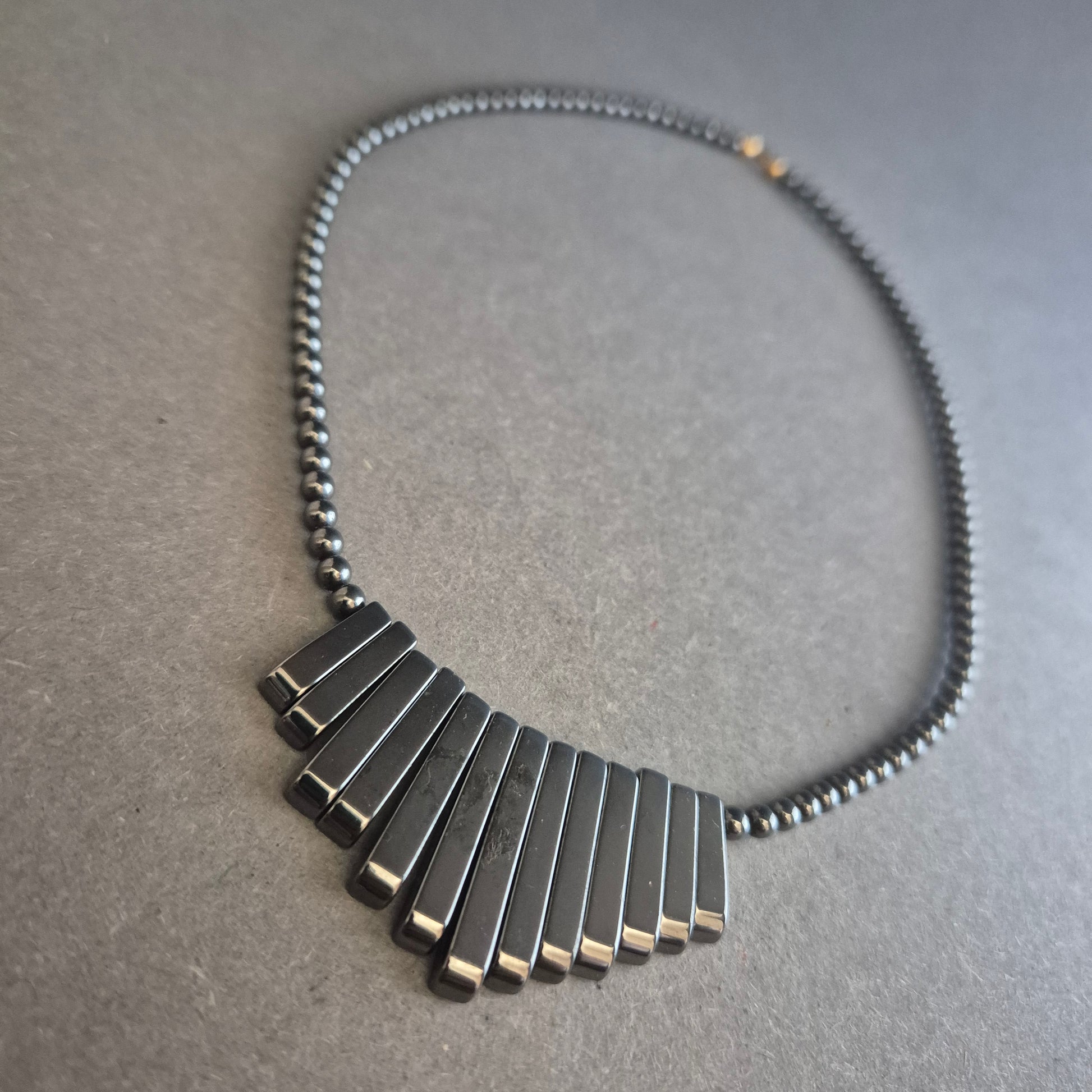 Diese markante Statement-Kette besticht durch ihr modernes, geometrisches Design. Die polierten, dunkel schimmernden Elemente im Hämatit-Look sind fächerförmig angeordnet und bilden das zentrale Highlight der Kette. Der restliche Teil ist mit runden, glänzenden Perlen in passender Farbe besetzt. Ideal für alle, die auffälligen, klar strukturierten Schmuck im Industrial- oder Avantgarde-Stil schätzen.