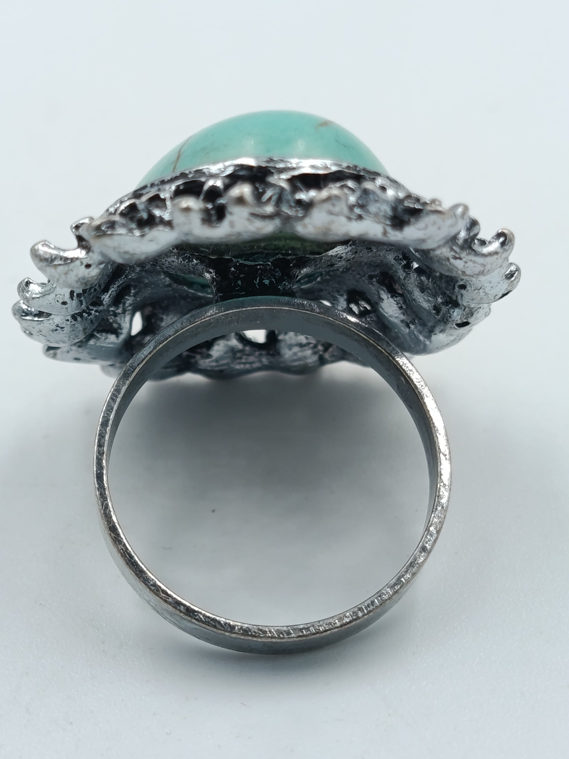 Ein auffälliger Vintage-Ring mit großem, ovalem Türkis-Cabochon in kräftigem Blaugrün. Die detailreich verzierte, silberfarbene Fassung in floralem Stil unterstreicht die natürliche Maserung des Steins. Ein markantes Schmuckstück für Liebhaber von ausdrucksstarken Accessoires.