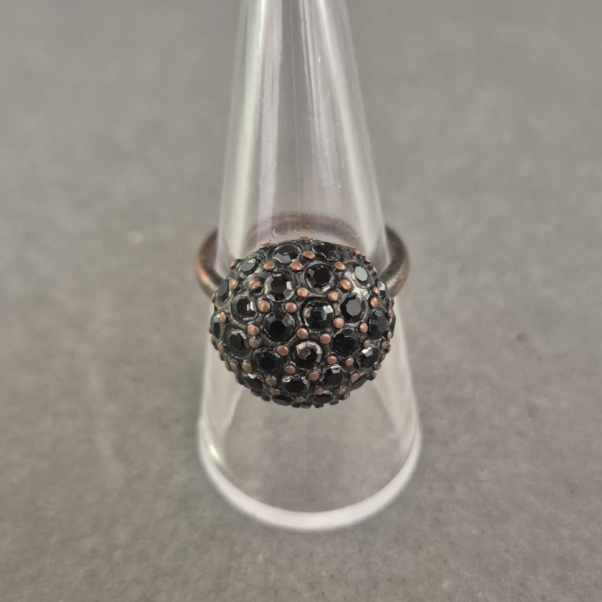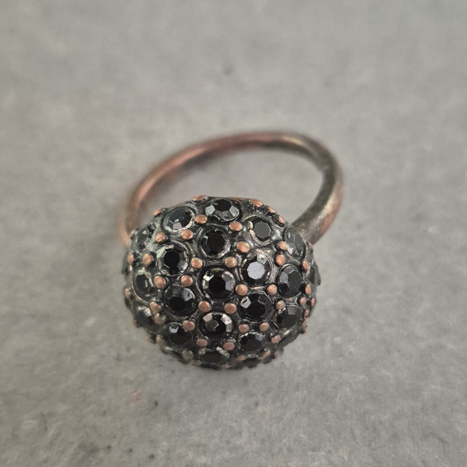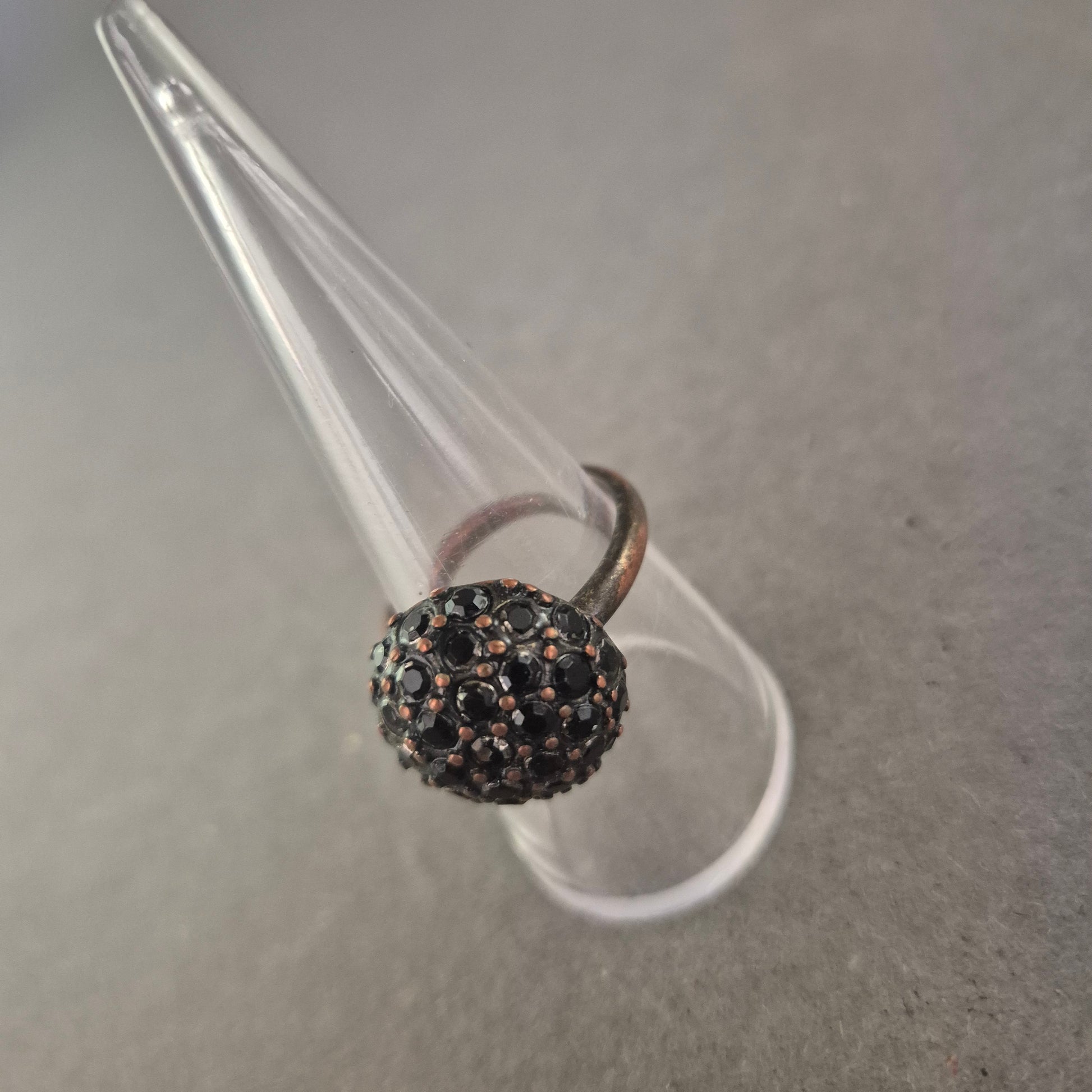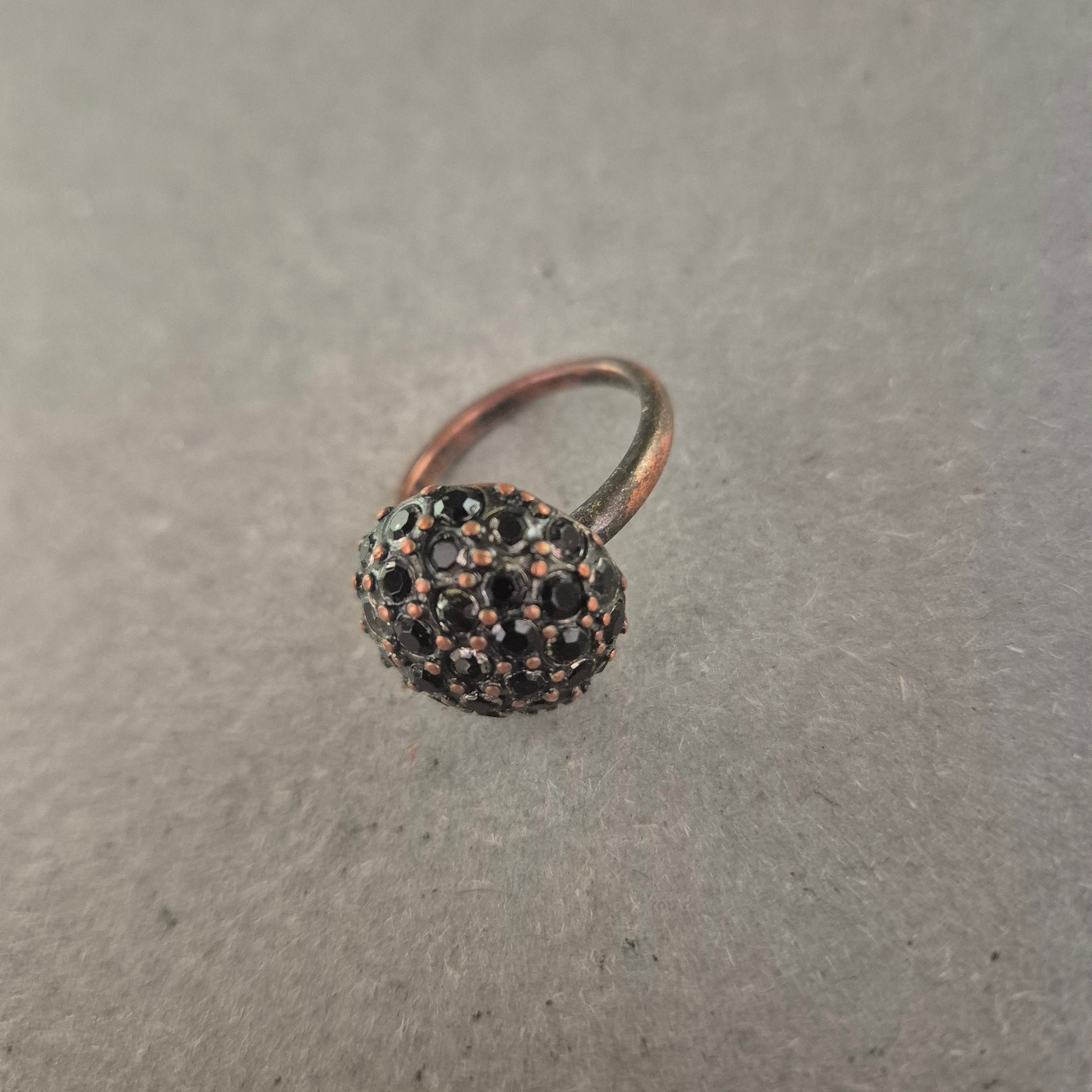 Dieser auffällige Vintage-Ring zieht alle Blicke auf sich. Die kugelförmige Ringkrone ist mit zahlreichen schwarzen, facettierten Strasssteinen besetzt, die ein edles Funkeln erzeugen. Der antik-braune Metallton des Rings sorgt für einen eleganten Kontrast und unterstreicht den Retro-Charakter. Ein perfektes Accessoire für besondere Anlässe oder als glamouröser Akzent im Alltag.
