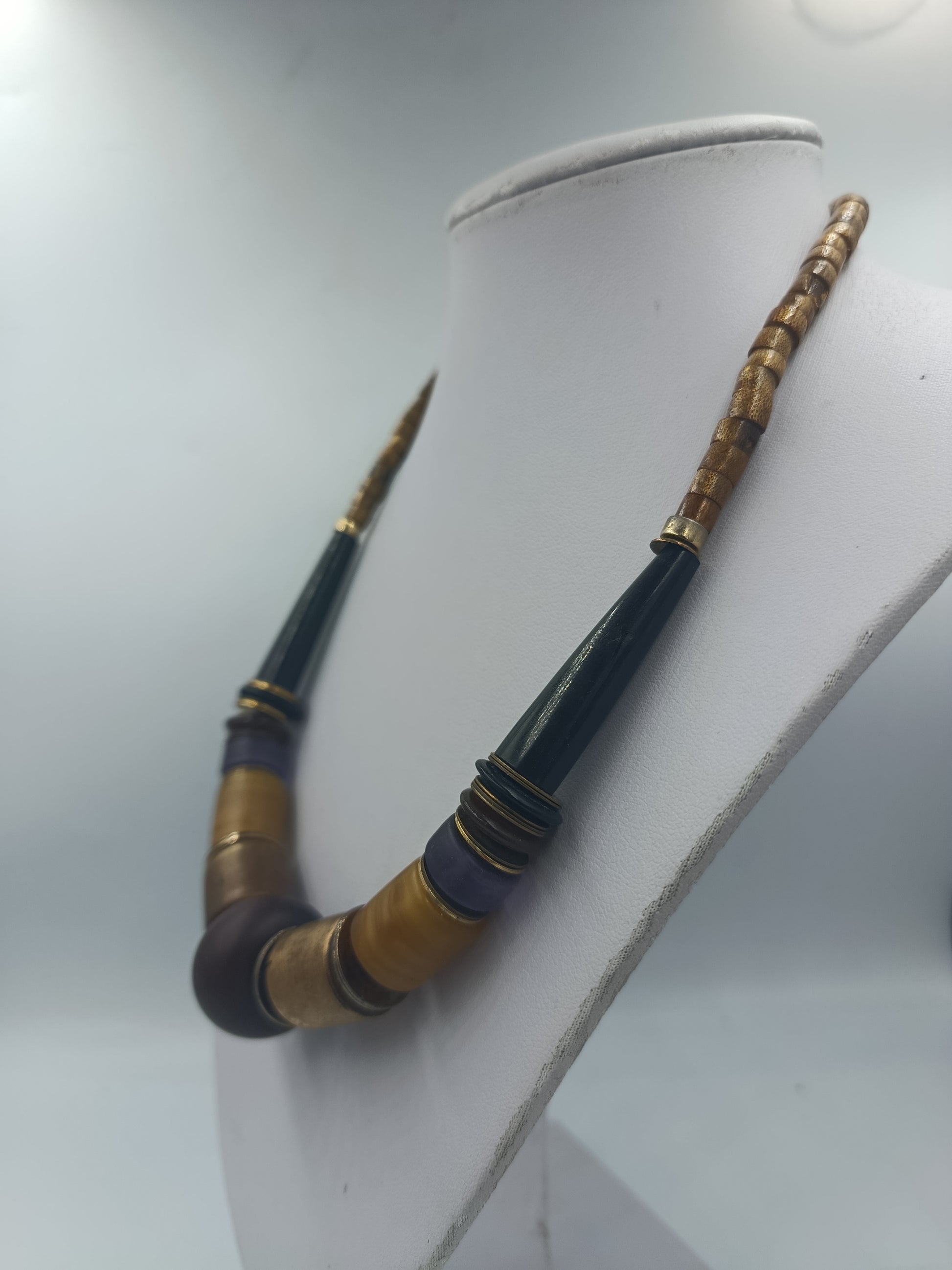 Auffällige Statementkette mit großen Perlen und Zylinderelementen in Braun, Gold und Dunkelblau. Die Kombination aus glänzenden und matten Oberflächen verleiht der Kette einen rustikalen, zugleich modernen Look. Ein ausdrucksstarkes Accessoire, das perfekt zu schlichten Outfits passt.
