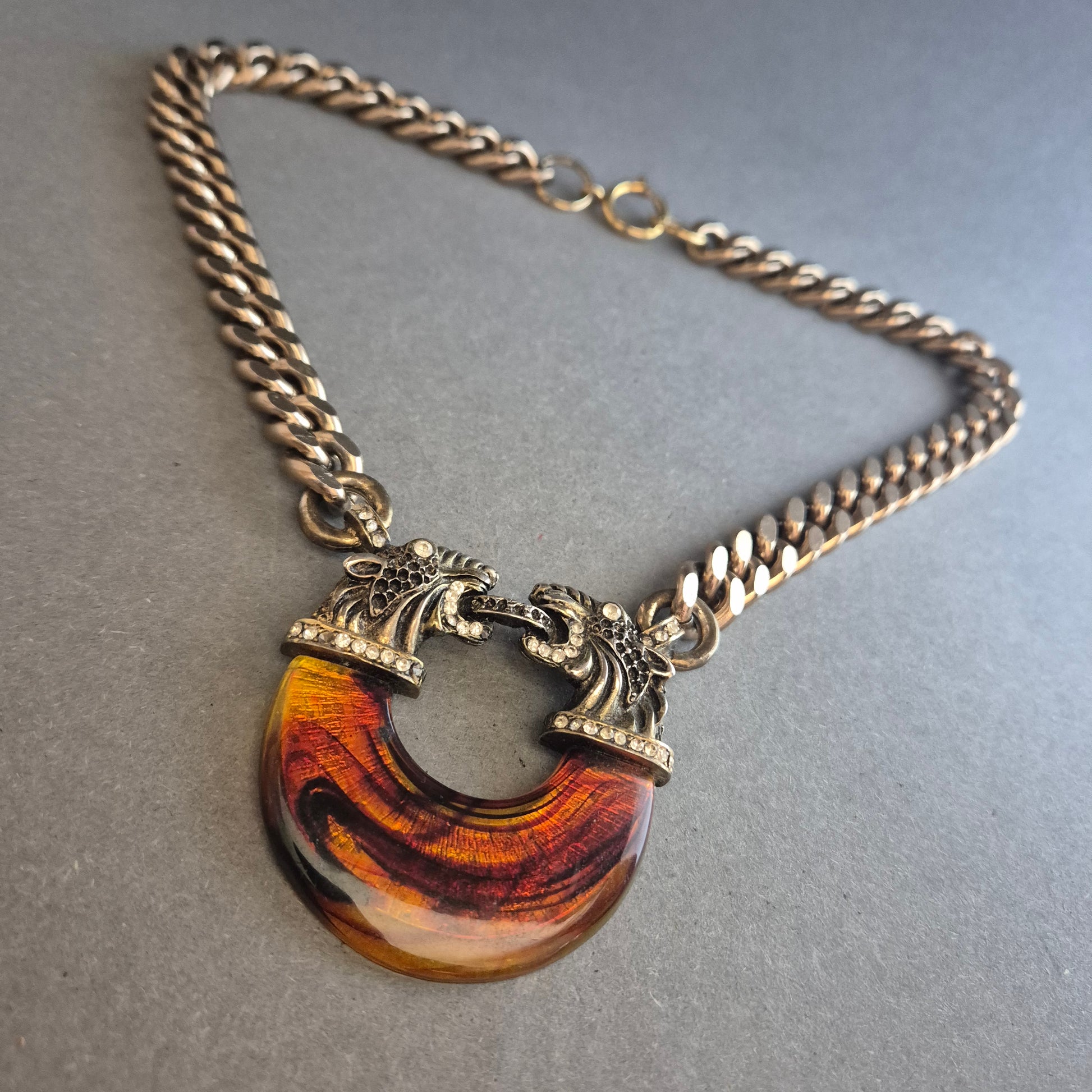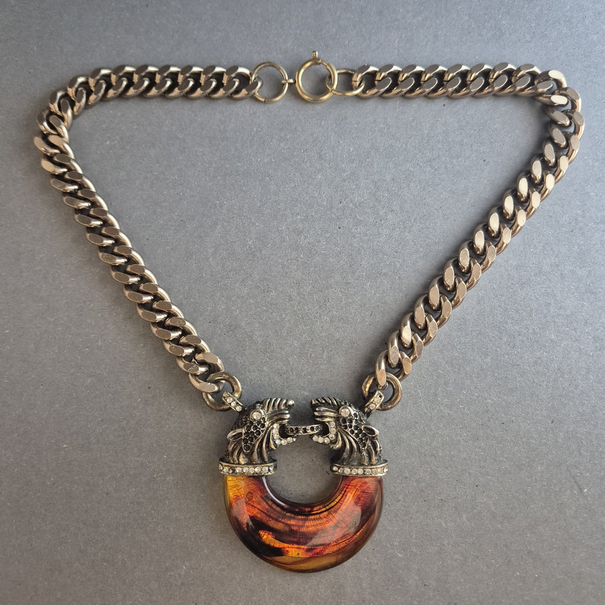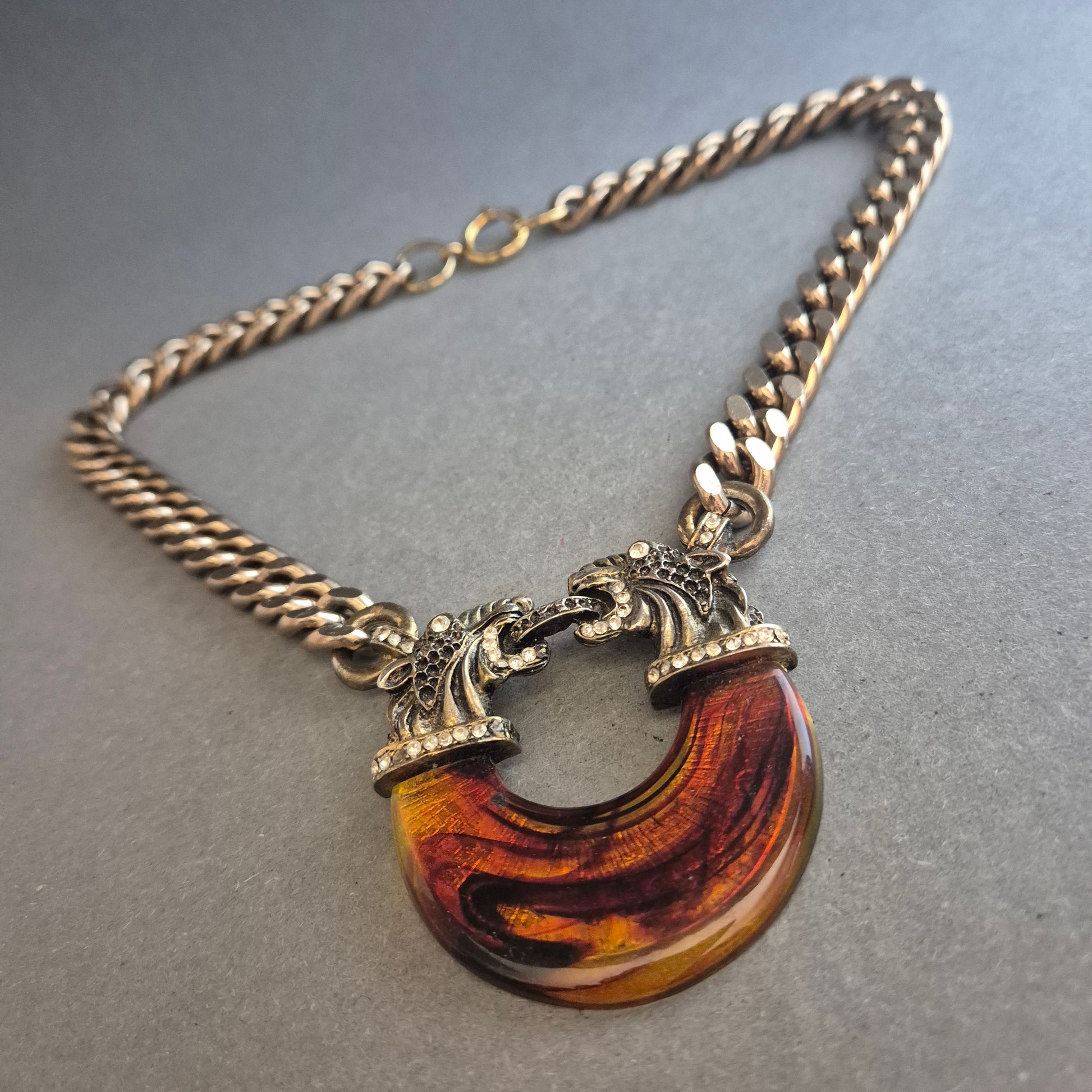 Diese auffällige Statementkette vereint antike Eleganz mit opulentem Design. Der massive Anhänger in Bernsteinoptik wird von zwei detailliert gearbeiteten Löwenköpfen gehalten, die mit kleinen Strasssteinen verziert sind. Die schwere Gliederkette unterstreicht den kraftvollen Charakter des Schmuckstücks und macht es zu einem echten Hingucker – perfekt für ausdrucksstarke Looks mit individuellem Stil.