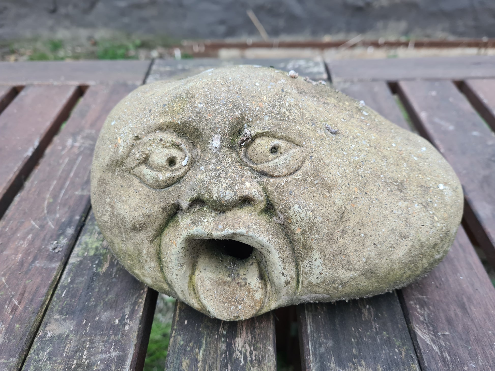 angeboten wird eine antike Gartenfigur „Steingesicht“ aus englischem Steinguss, ideal als Brunnenverzierung oder dekoratives Element.