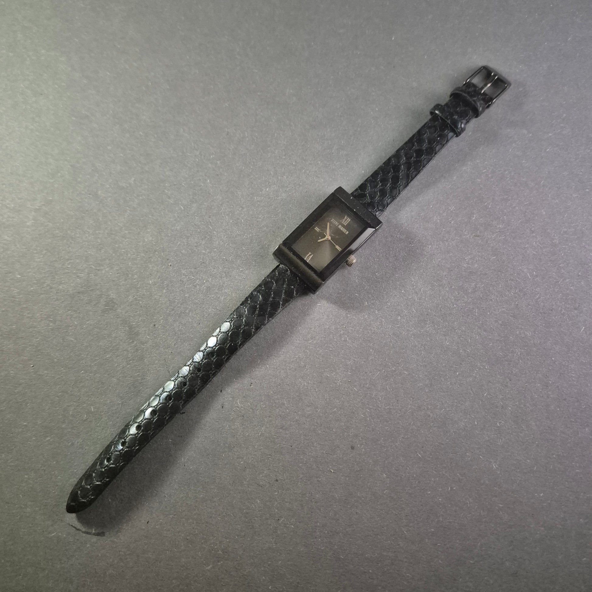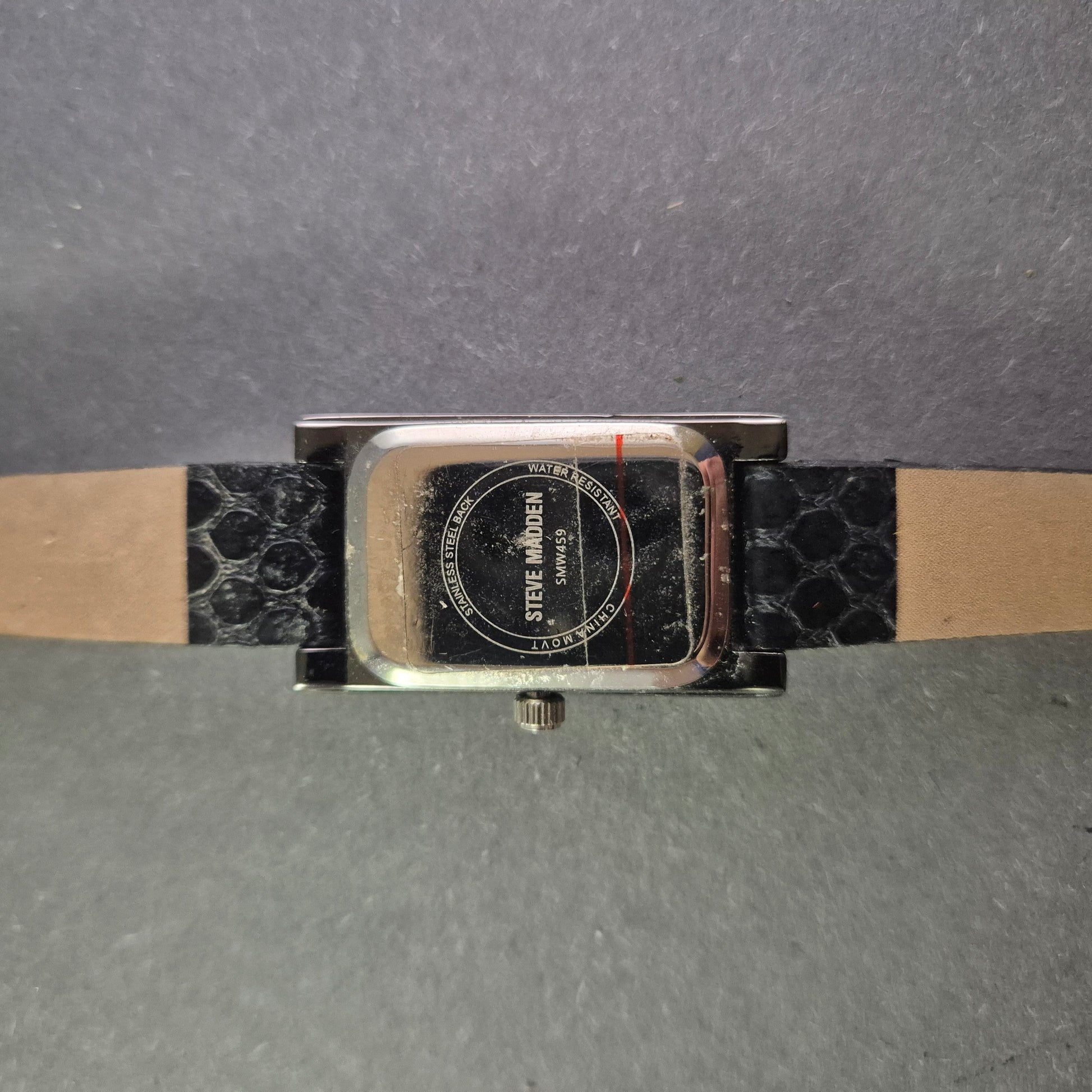 Diese elegante Armbanduhr von Steve Madden vereint modernes Design mit einer hochwertigen Verarbeitung. Das rechteckige Gehäuse in glänzendem Schwarz und das schlichte Zifferblatt mit römischen Ziffern bieten einen zeitlosen Look. Das schwarze Armband mit Schlangenleder-Optik verleiht der Uhr zusätzlichen Stil. Perfekt für Frauen, die ein modisches und einzigartiges Accessoire suchen.