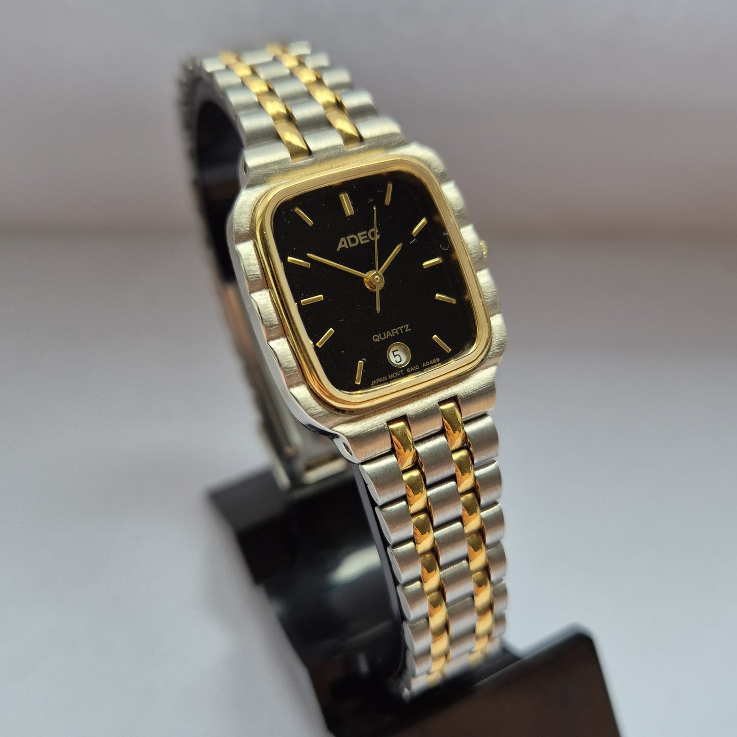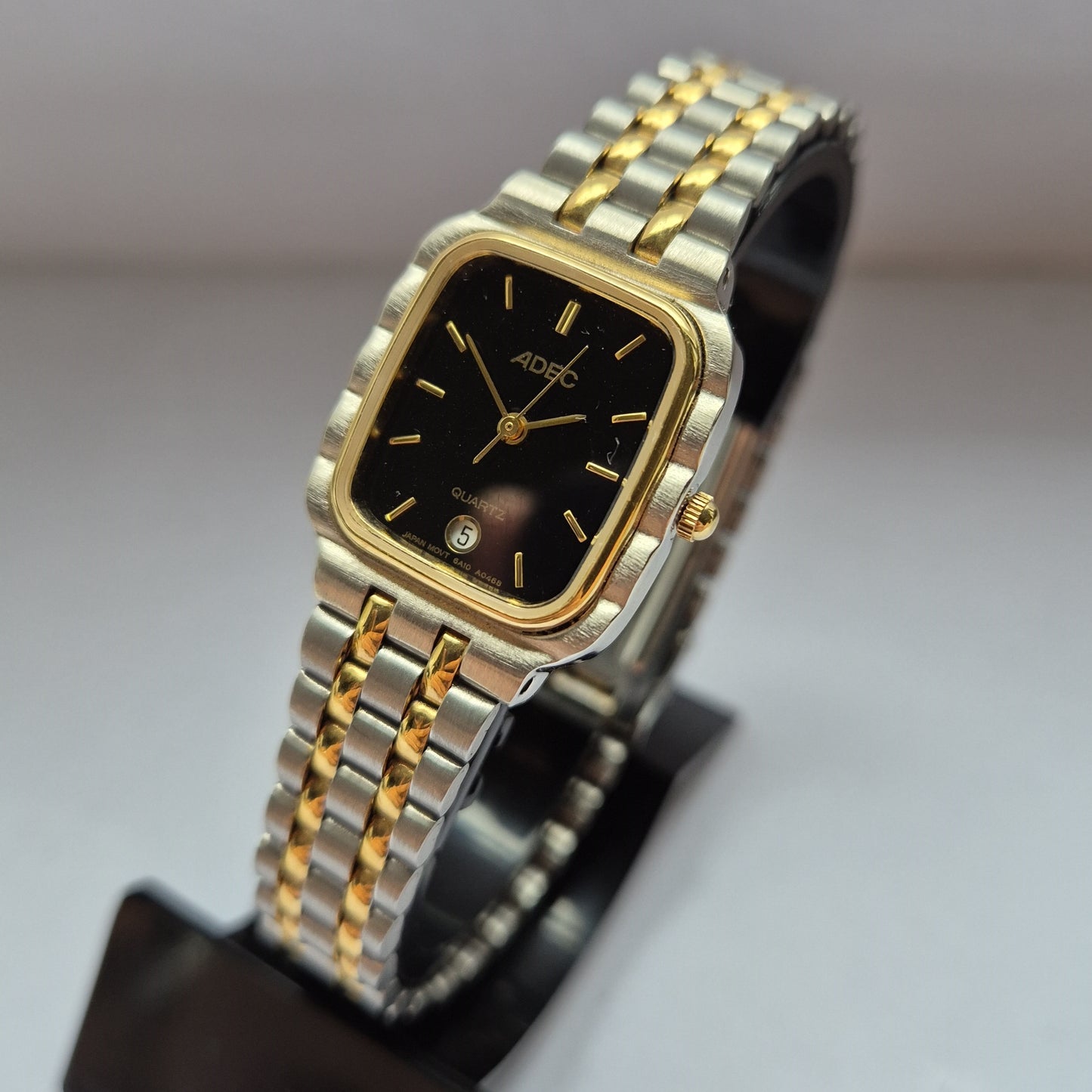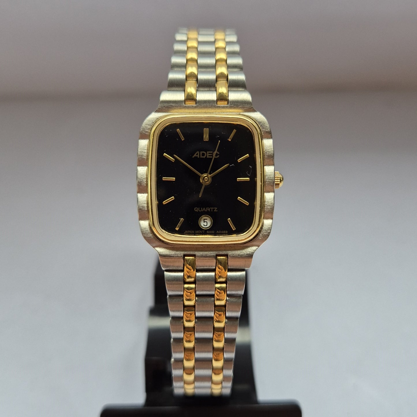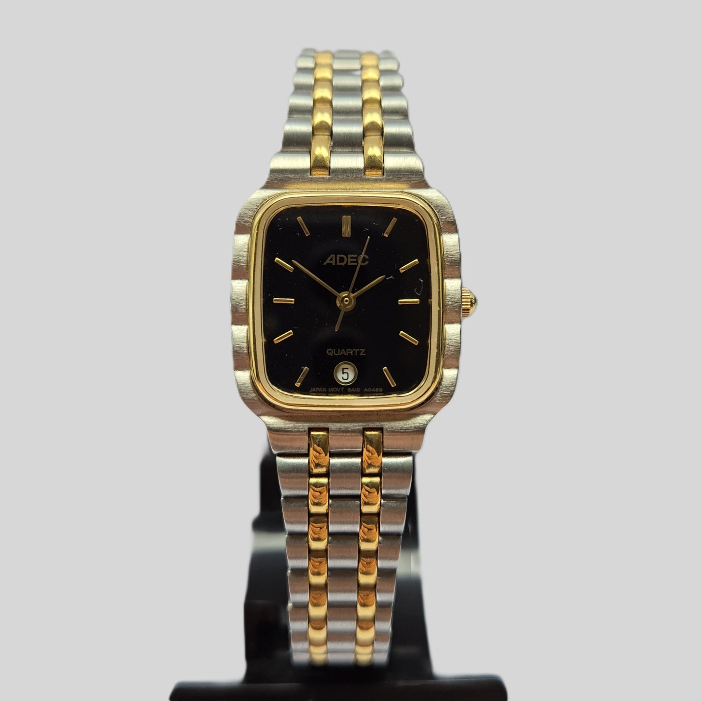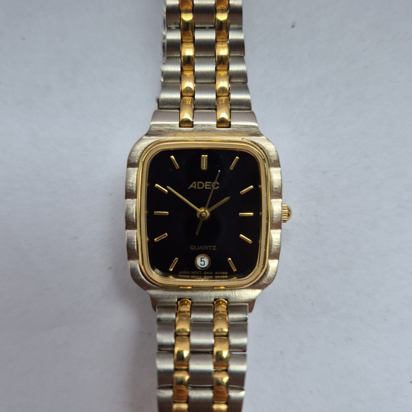 Diese elegante Herrenarmbanduhr von ADEC kombiniert ein modernes schwarz-goldenes Zifferblatt mit einem hochwertigen Edelstahlgehäuse. Das integrierte zweifarbige Edelstahlarmband verleiht der Uhr einen edlen Look und sorgt für einen angenehmen Tragekomfort. Mit der Datumsanzeige bei 6 Uhr und einem robusten Quarzwerk ist diese Uhr nicht nur ein stilvolles Accessoire, sondern auch ein zuverlässiger Begleiter im Alltag.