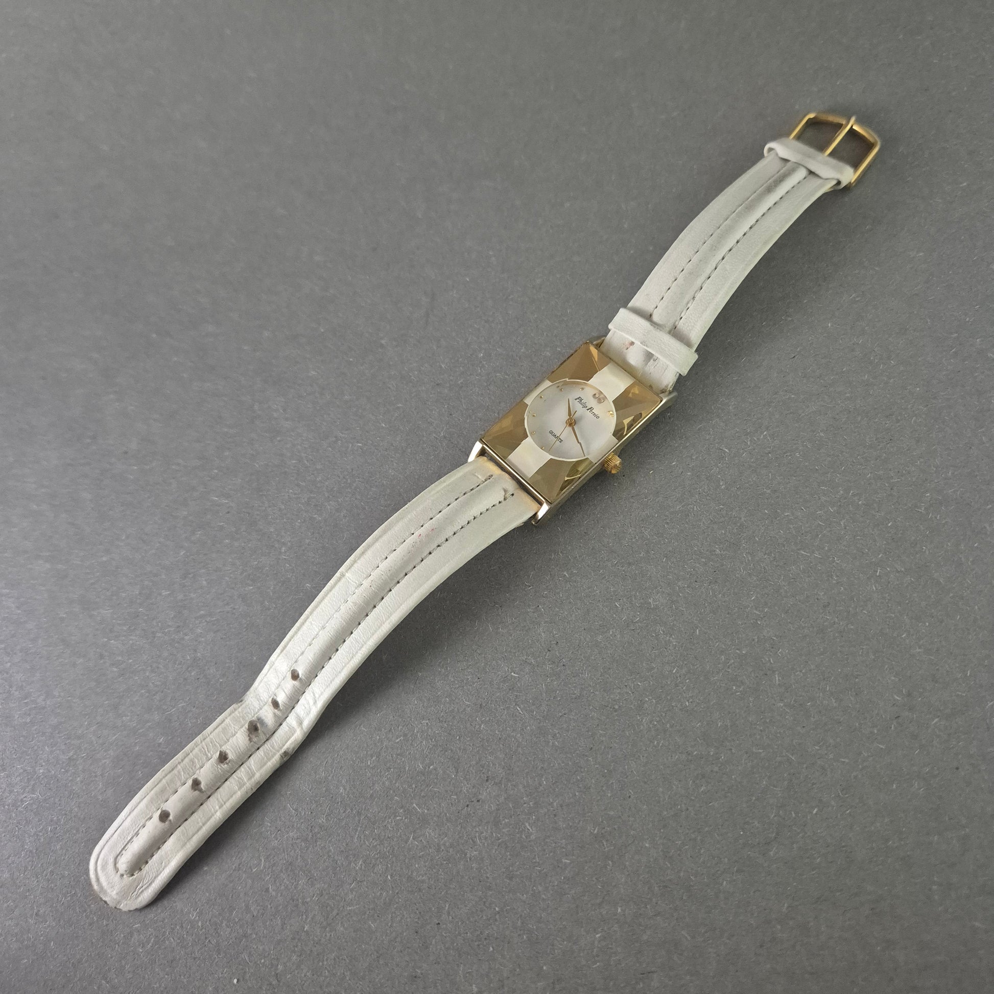 Diese elegante Philip Persio Damenarmbanduhr besticht durch ihr raffiniertes Design mit rechteckigem Gehäuse und einem klaren, goldfarbenen Akzent auf dem Zifferblatt. Die feinen goldenen Punktindizes und Zeiger verleihen der Uhr eine edle Optik. Das weiße Armband aus Kunstleder rundet das stilvolle Erscheinungsbild ab. Dank des zuverlässigen Quarzwerks garantiert diese Uhr eine präzise Zeitmessung und ist ein perfektes Accessoire für elegante Anlässe oder den Alltag.