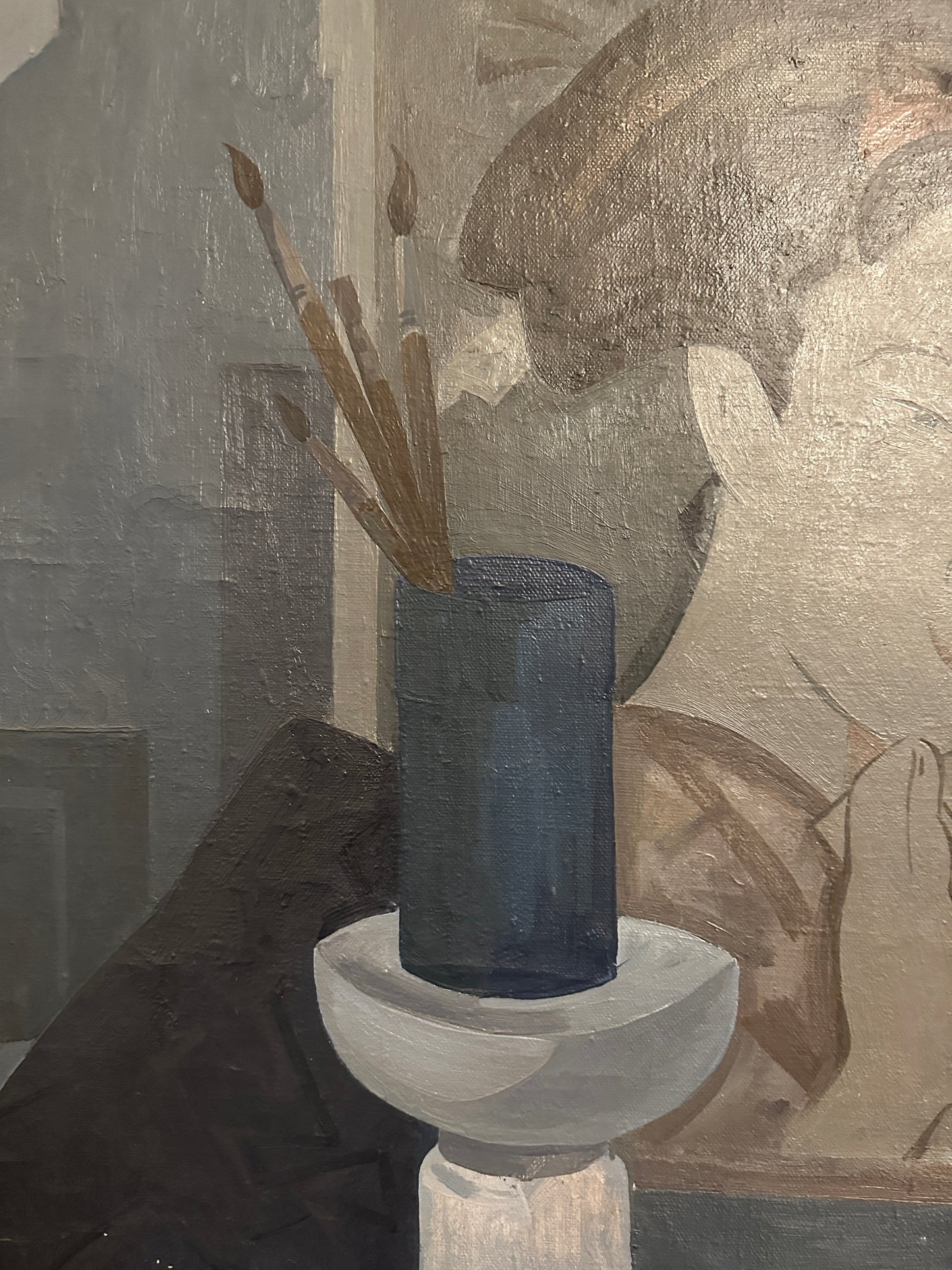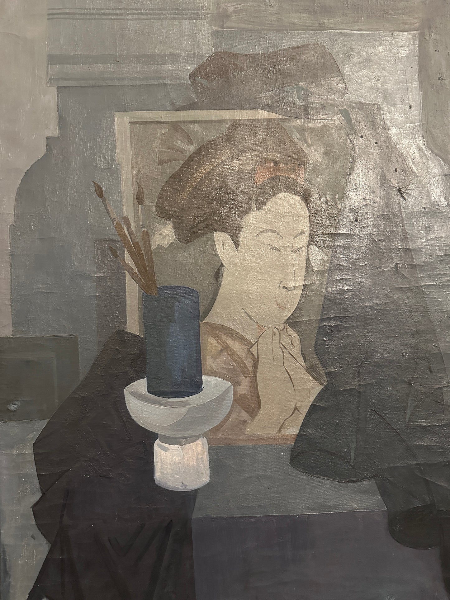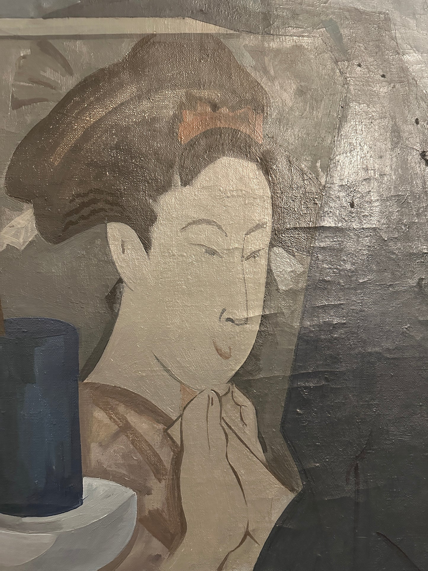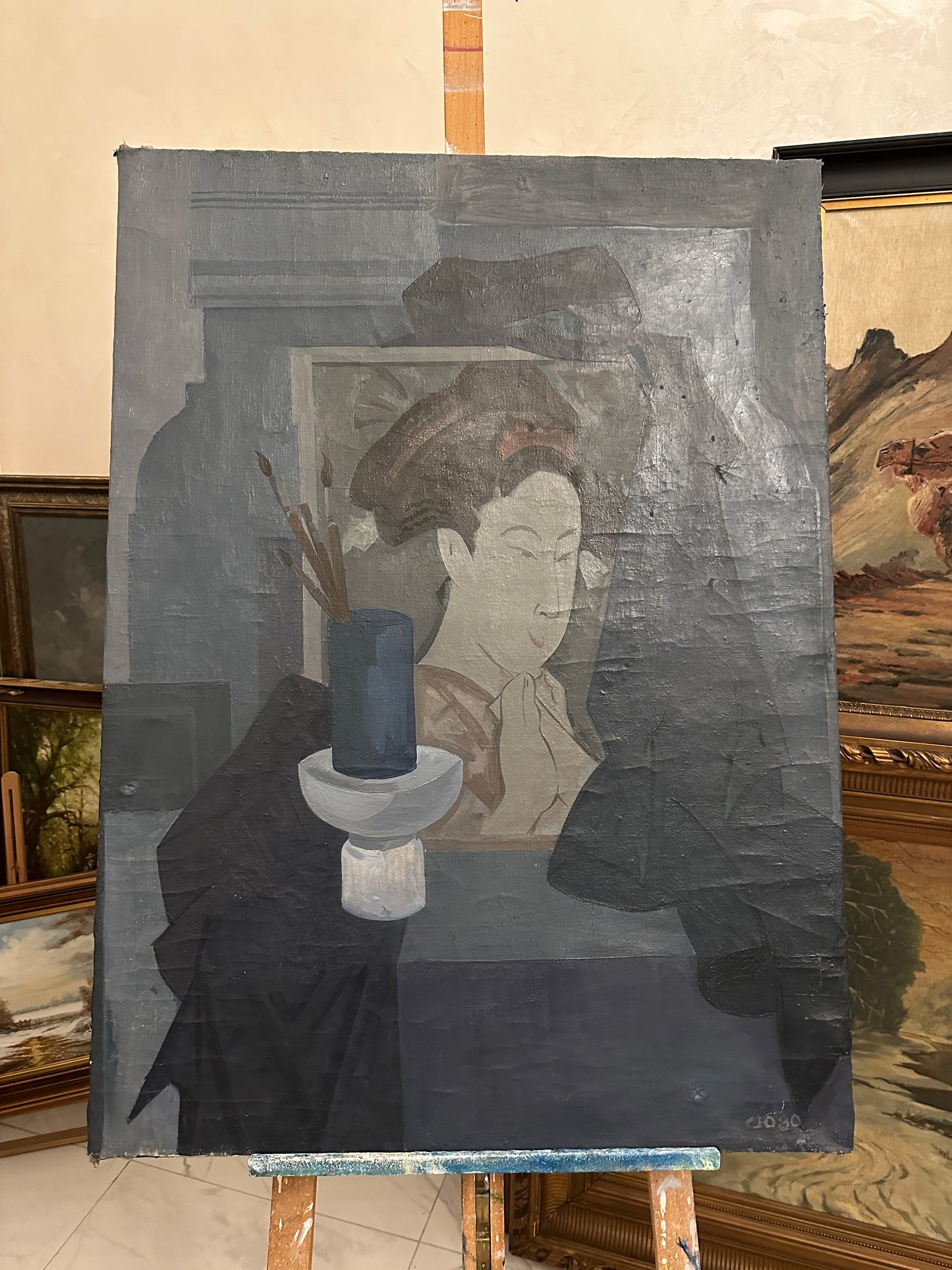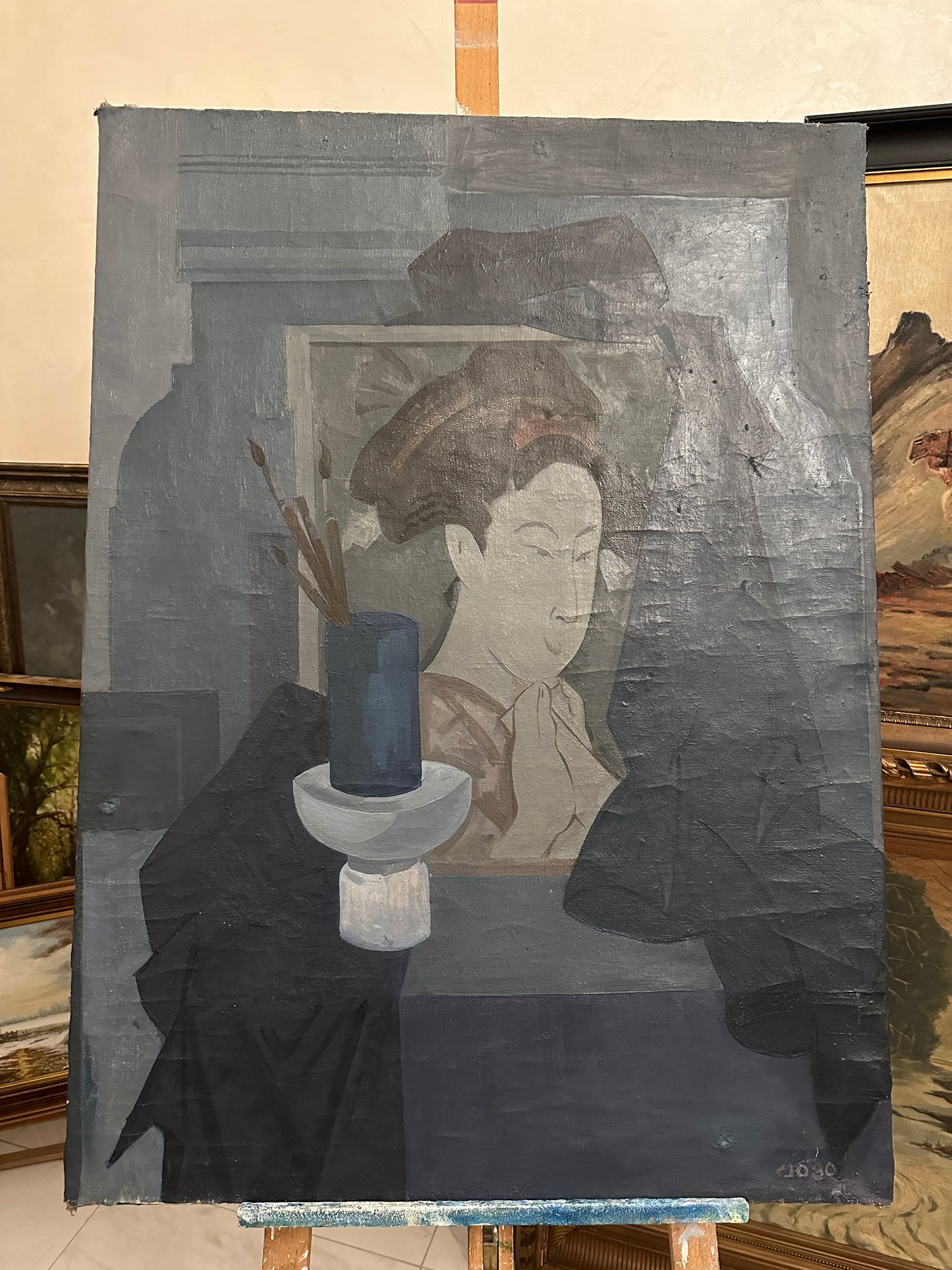 Beschreibung: Erleben Sie die faszinierende Welt zeitgenössischer Malerei mit diesem beeindruckenden Ölgemälde von Suchorukow (XX). Das Kunstwerk zeigt eine asiatische Frau in ihrem Atelier, komplett in verschiedenen Blau- und Grautönen gemalt. Das Gemälde befindet sich in einem sehr guten Zustand, wie auf den beigefügten Fotos dokumentiert.