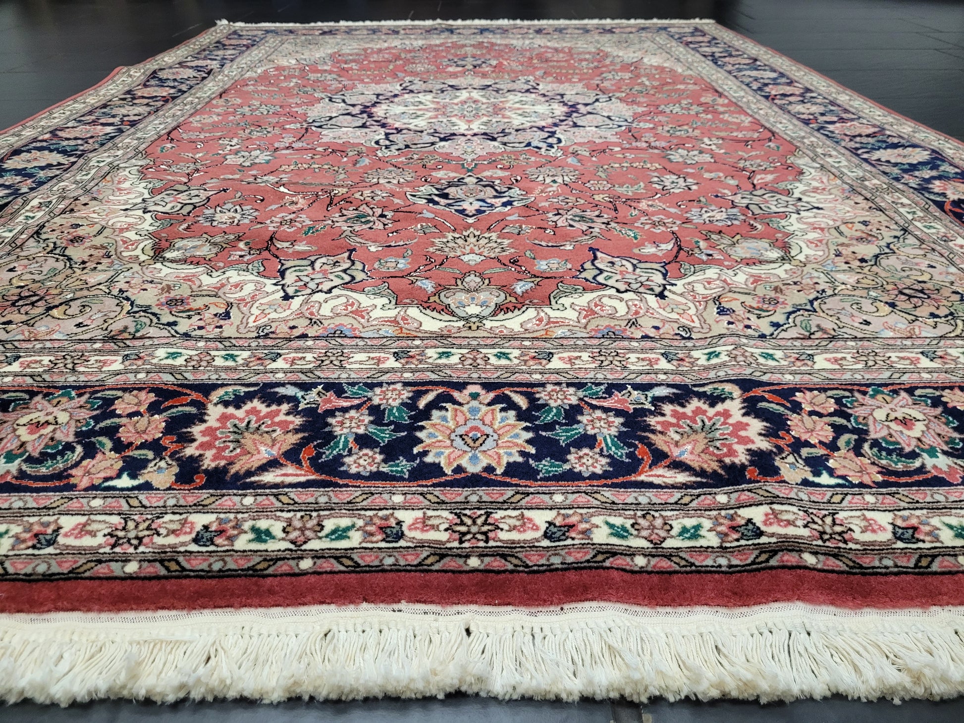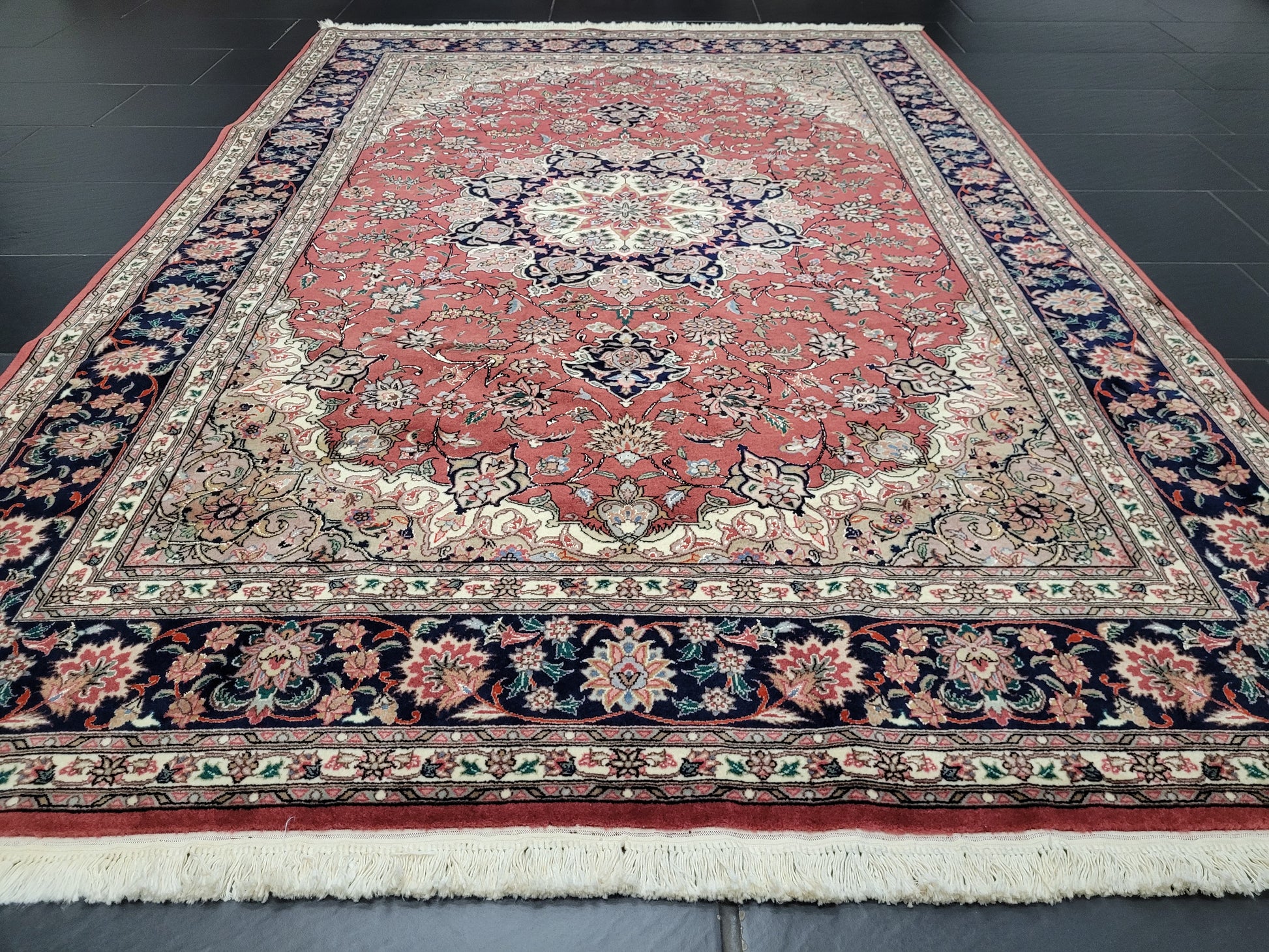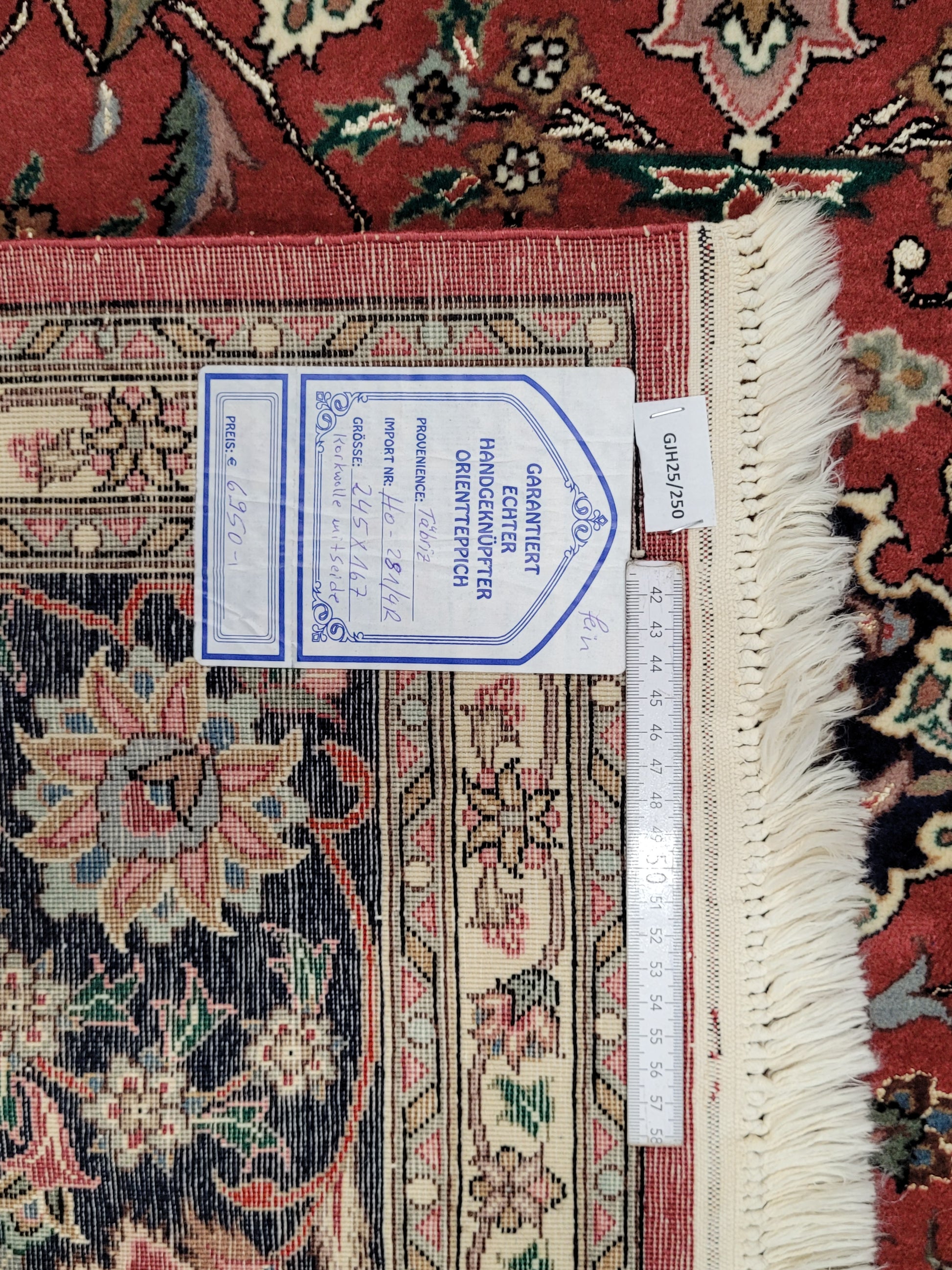 angeboten wird ein exquisiter handgeknüpfter Täbriz Teppich aus feiner Korkwolle mit edlen Seidenakzenten. Das klassische Medaillonmuster ist kunstvoll auf einem warmen rötlichen Fond ausgeführt und von filigranen Blütenranken und Arabesken durchzogen. Die detailreiche Bordüre in Dunkelblau rundet das harmonische Gesamtbild perfekt ab.