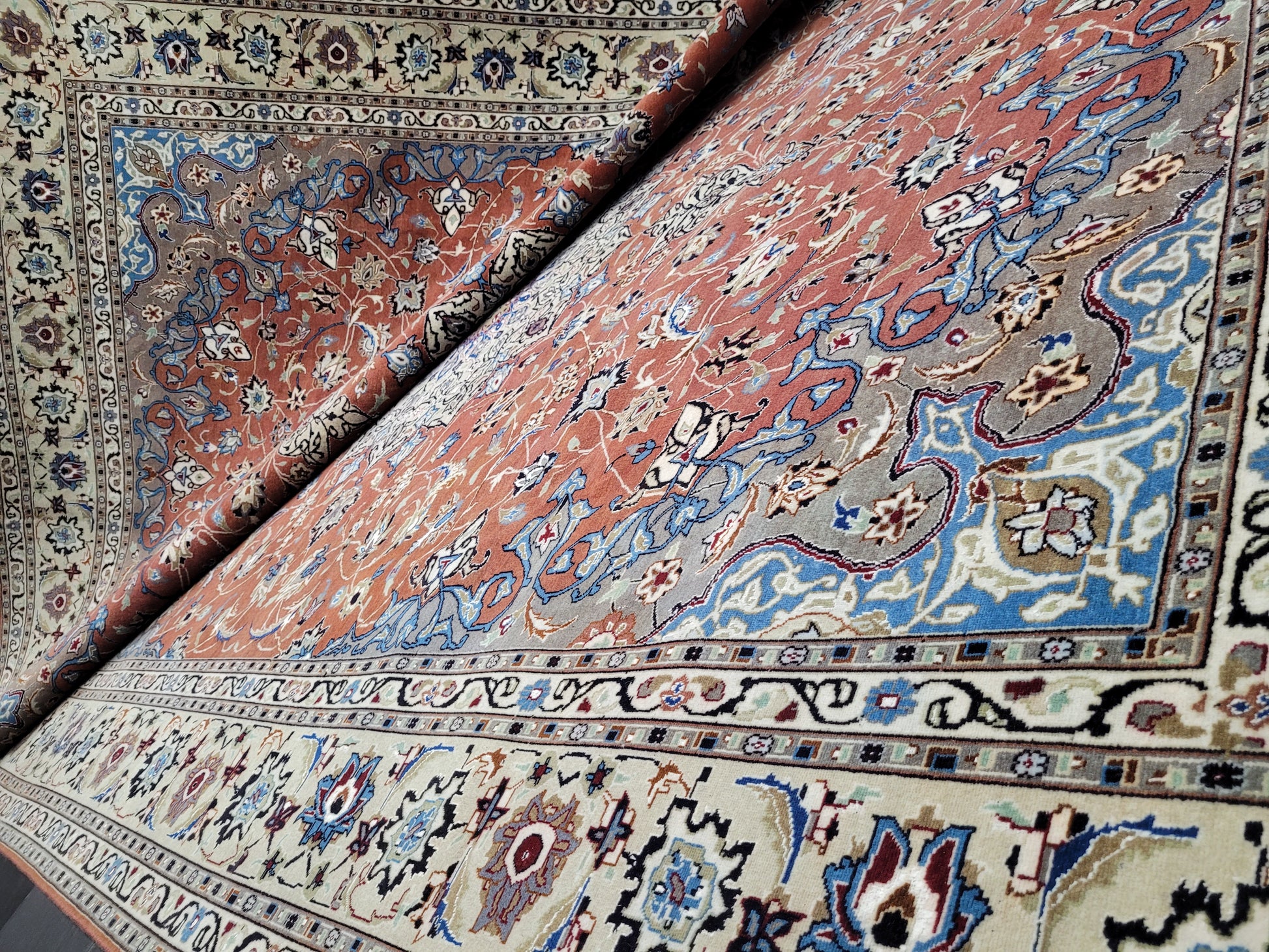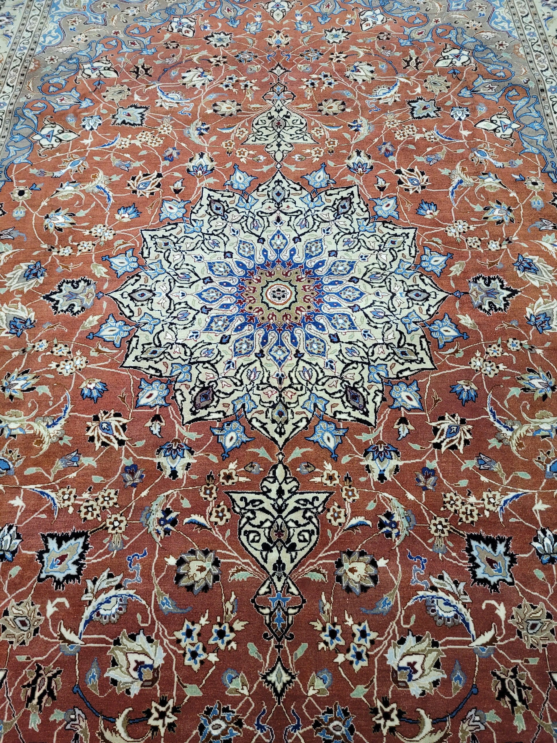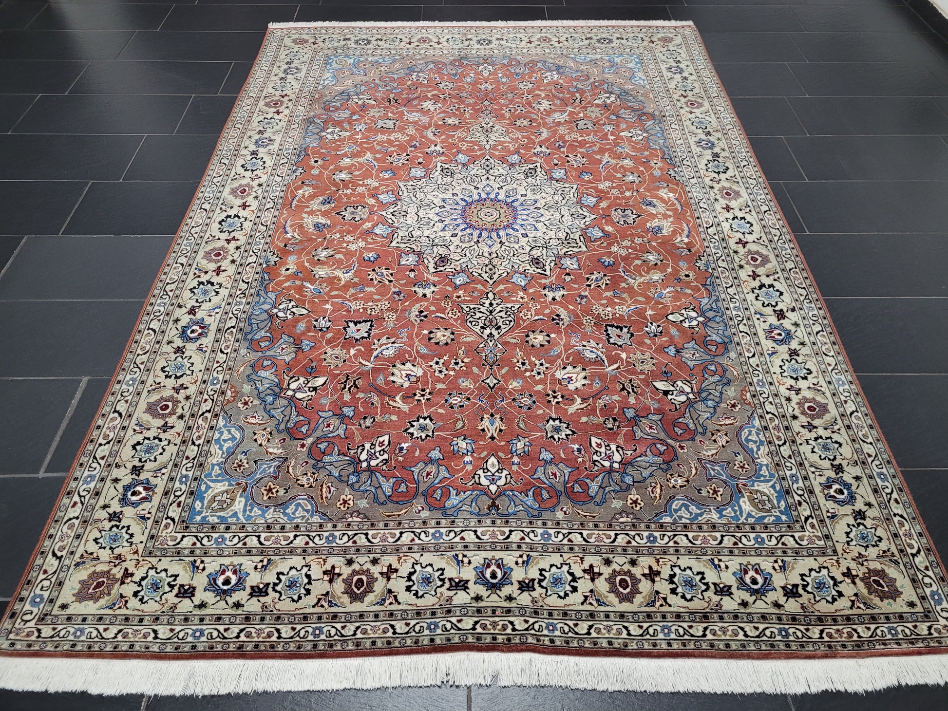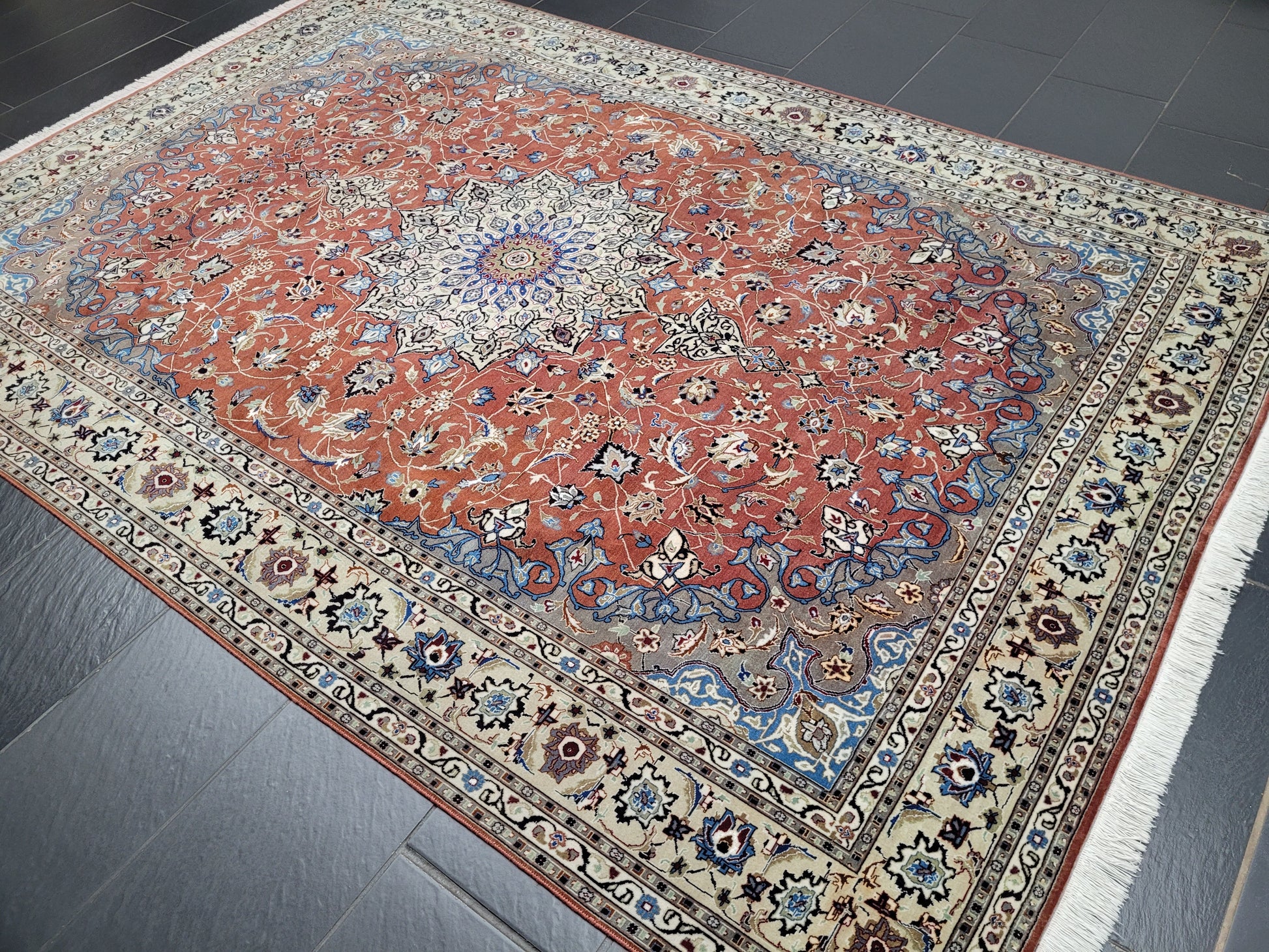 angeboten wird ein prachtvoller Täbriz Teppich aus feinster Korkwolle mit Seidenanteil, handgeknüpft in meisterlicher Qualität. Das elegante Medaillon-Design mit filigranen Blütenranken auf warmem Terrakotta-Grund strahlt zeitlose Eleganz aus. Die fein abgestimmten Farben in Creme, Hellblau und Gold unterstreichen die exquisite Handwerkskunst dieses klassischen Meisterstücks.