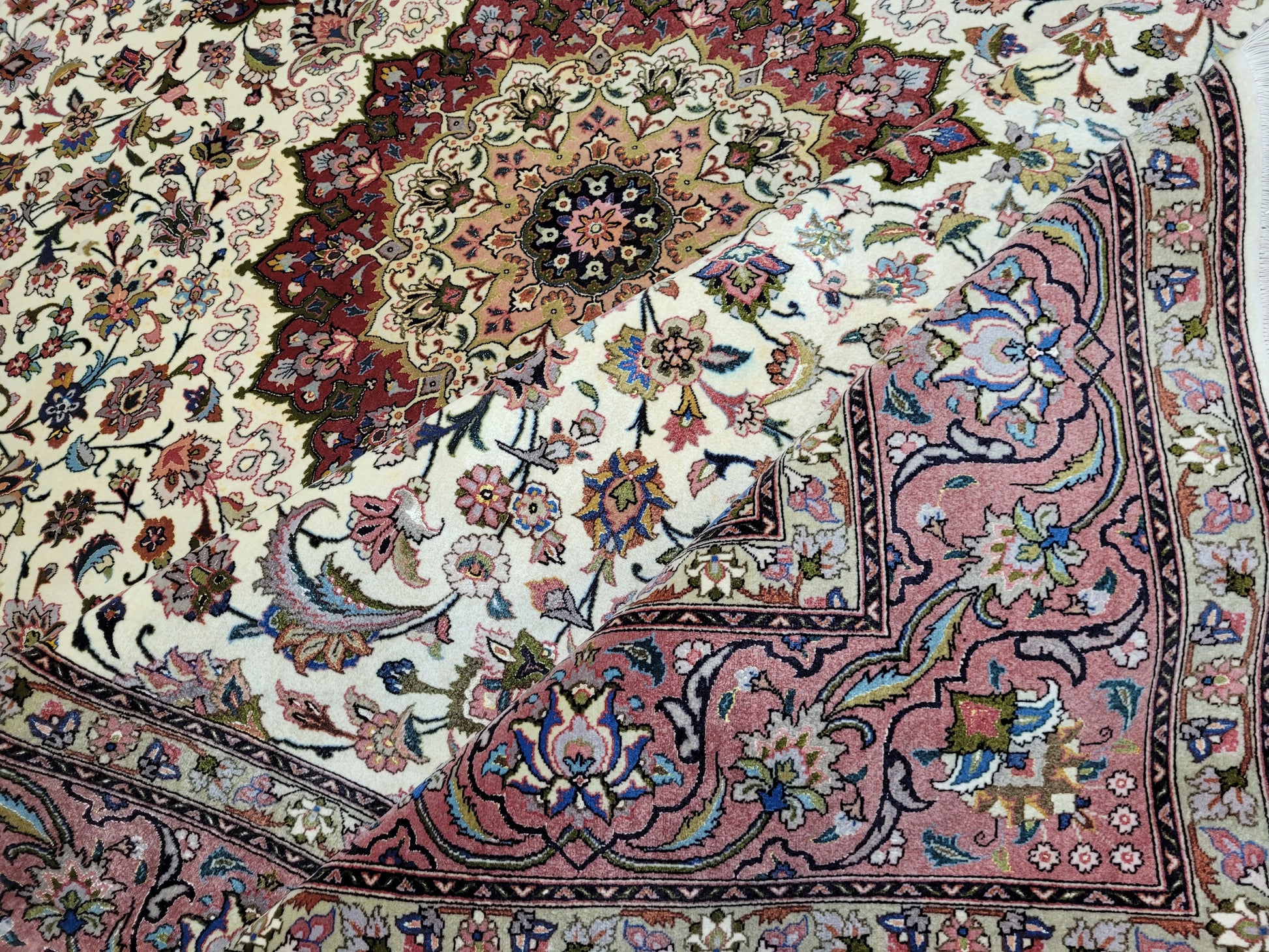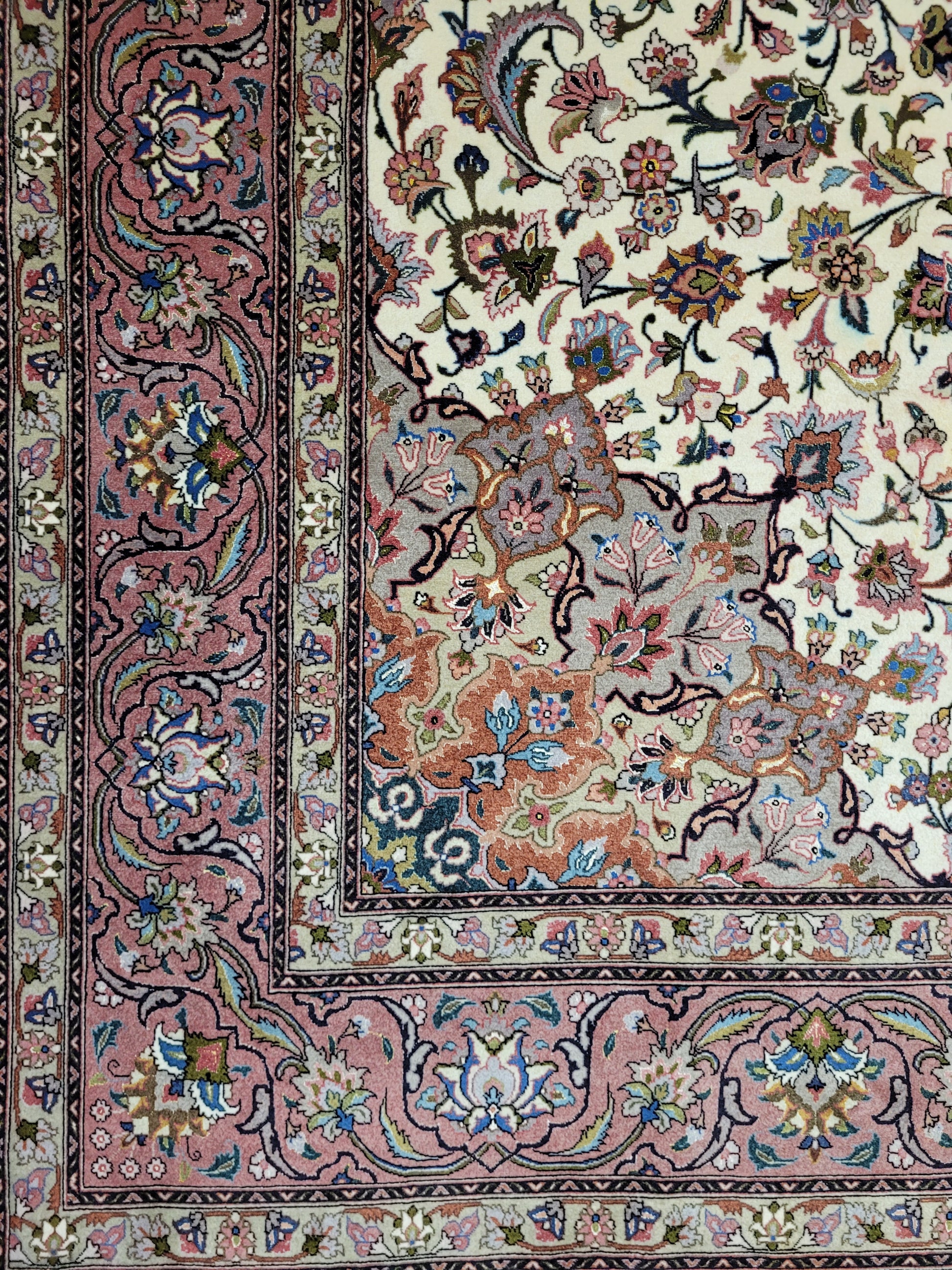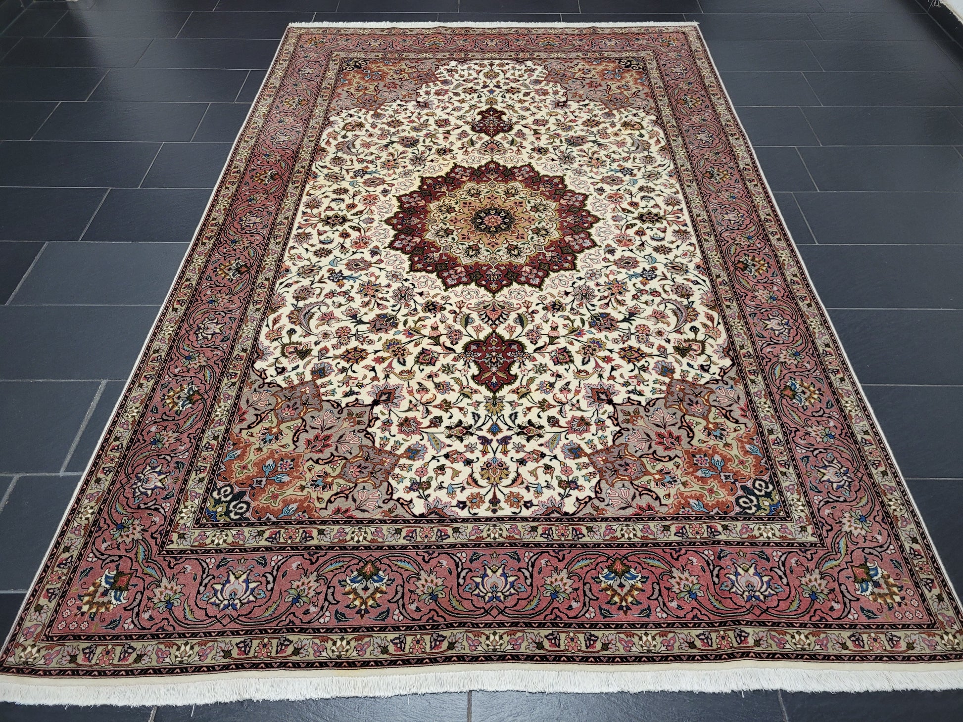 angeboten wird ein äußerst feiner Täbriz Teppich aus der berühmten Manufakturregion Tabriz (Persien), handgeknüpft aus edler Korkwolle mit Seidenanteil. Das prachtvolle Stück zeigt ein klassisches Medaillon-Muster mit reicher floraler Ornamentik und fein abgestimmten Farben. Die Kombination aus warmem Rosé, Creme und Weinrot wird durch zarte Seidenglanz-Akzente in Blau und Gold elegant hervorgehoben.