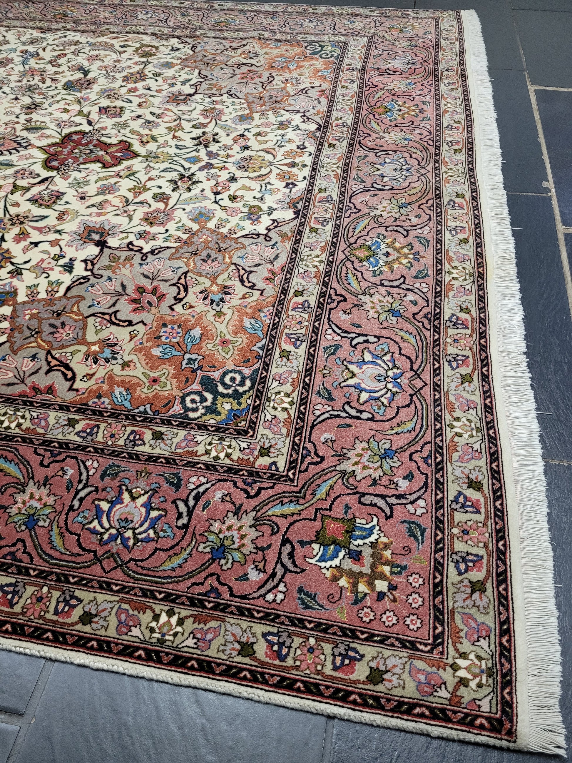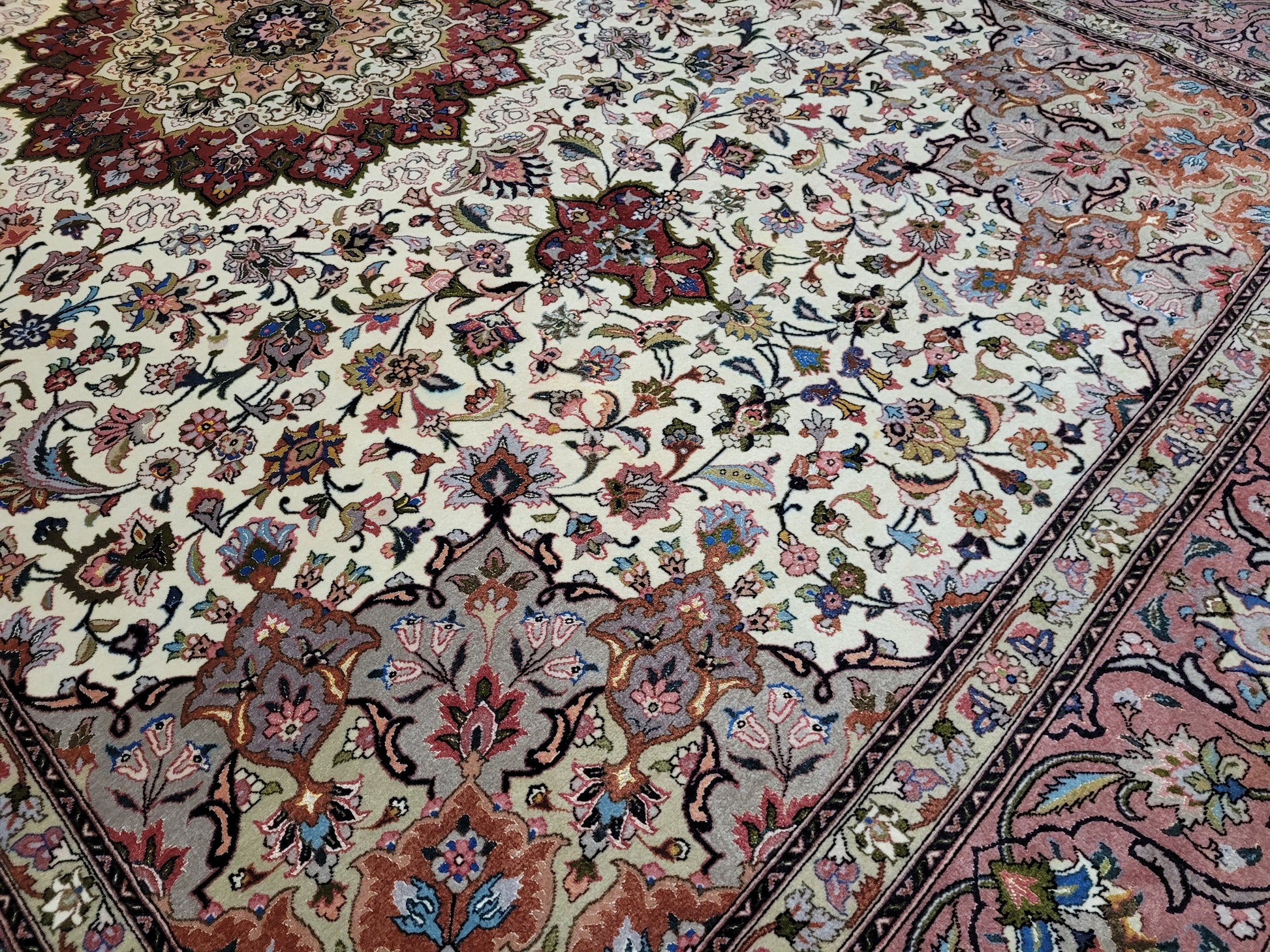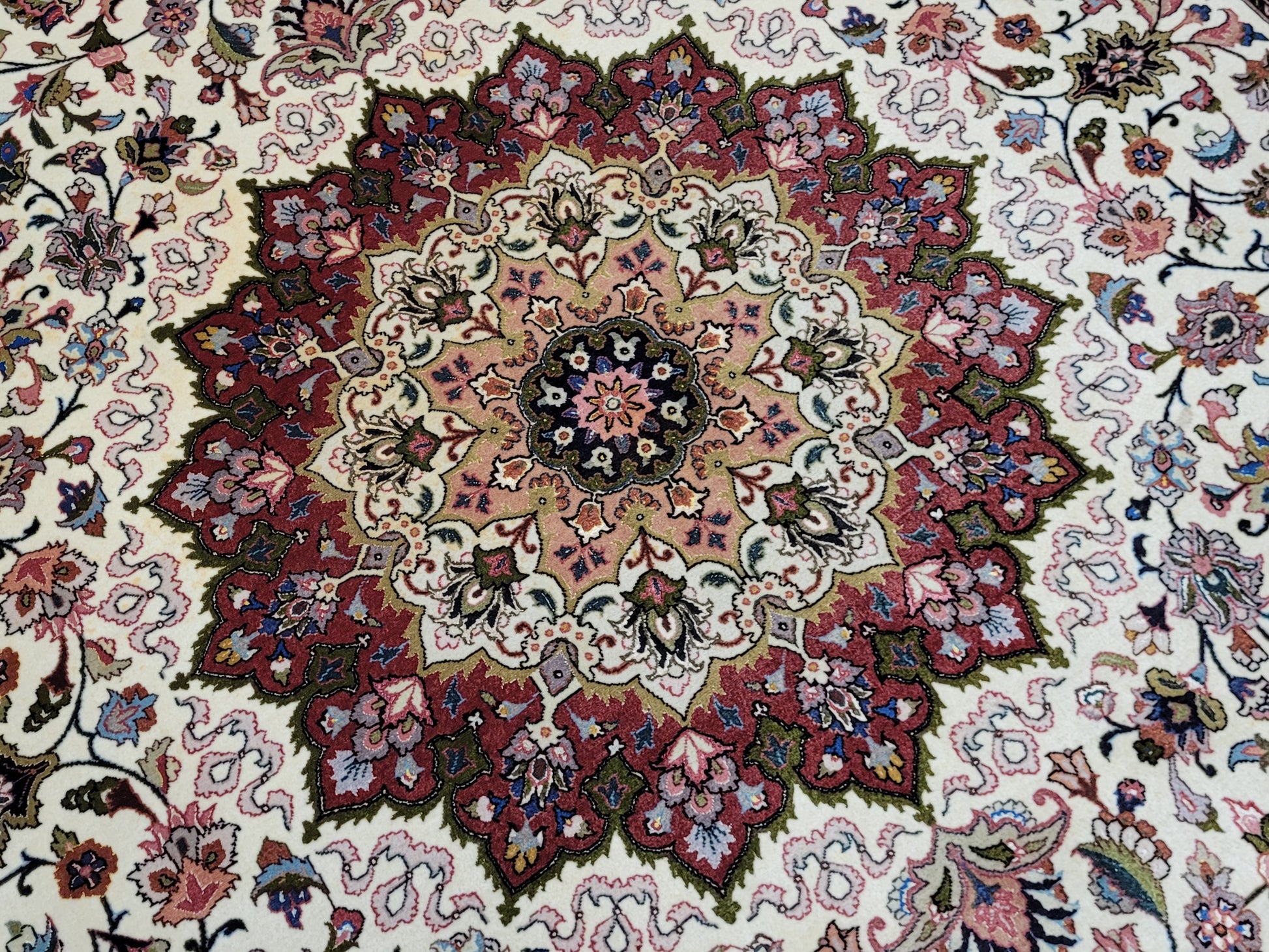 angeboten wird ein äußerst feiner Täbriz Teppich aus der berühmten Manufakturregion Tabriz (Persien), handgeknüpft aus edler Korkwolle mit Seidenanteil. Das prachtvolle Stück zeigt ein klassisches Medaillon-Muster mit reicher floraler Ornamentik und fein abgestimmten Farben. Die Kombination aus warmem Rosé, Creme und Weinrot wird durch zarte Seidenglanz-Akzente in Blau und Gold elegant hervorgehoben.