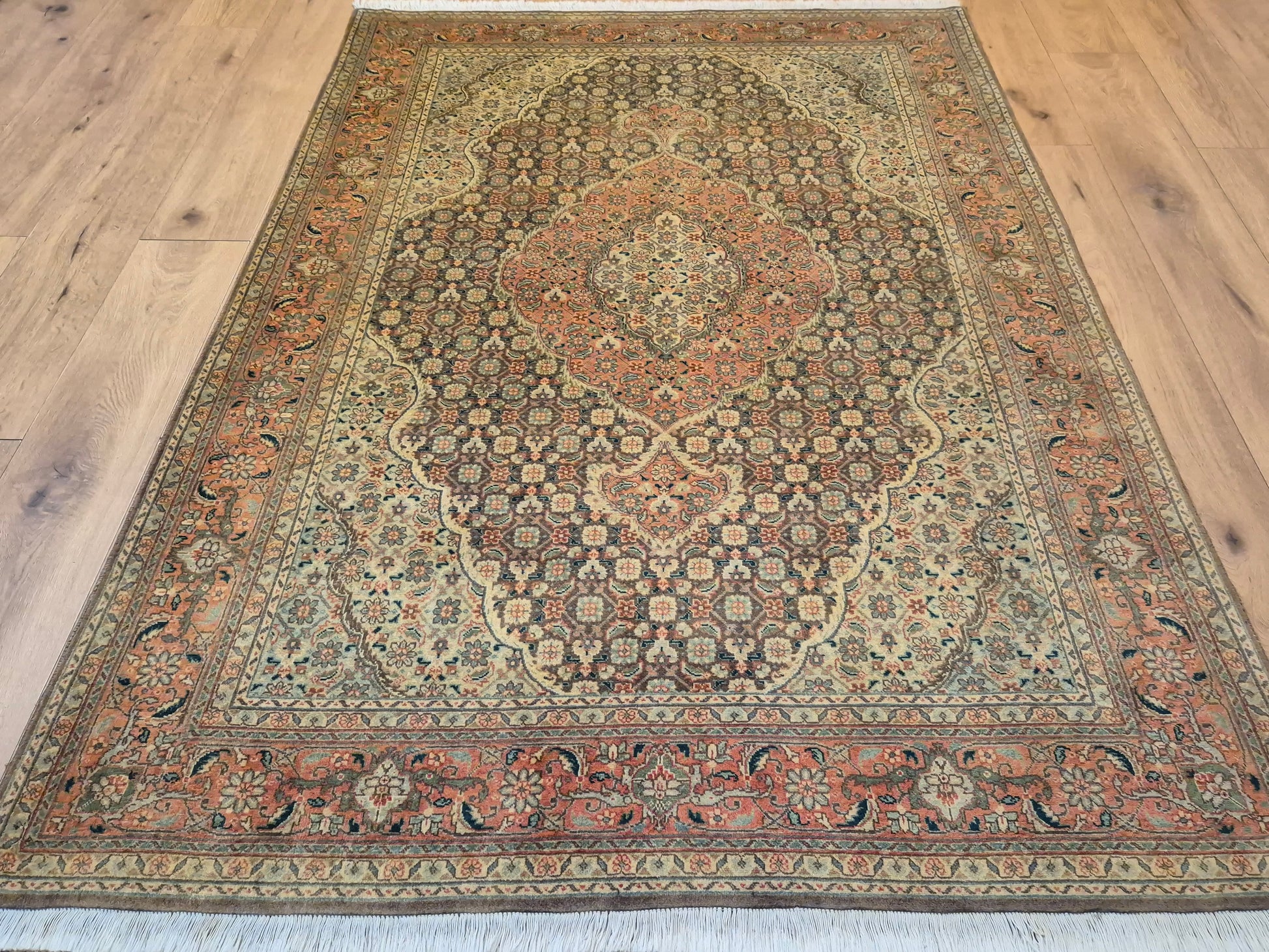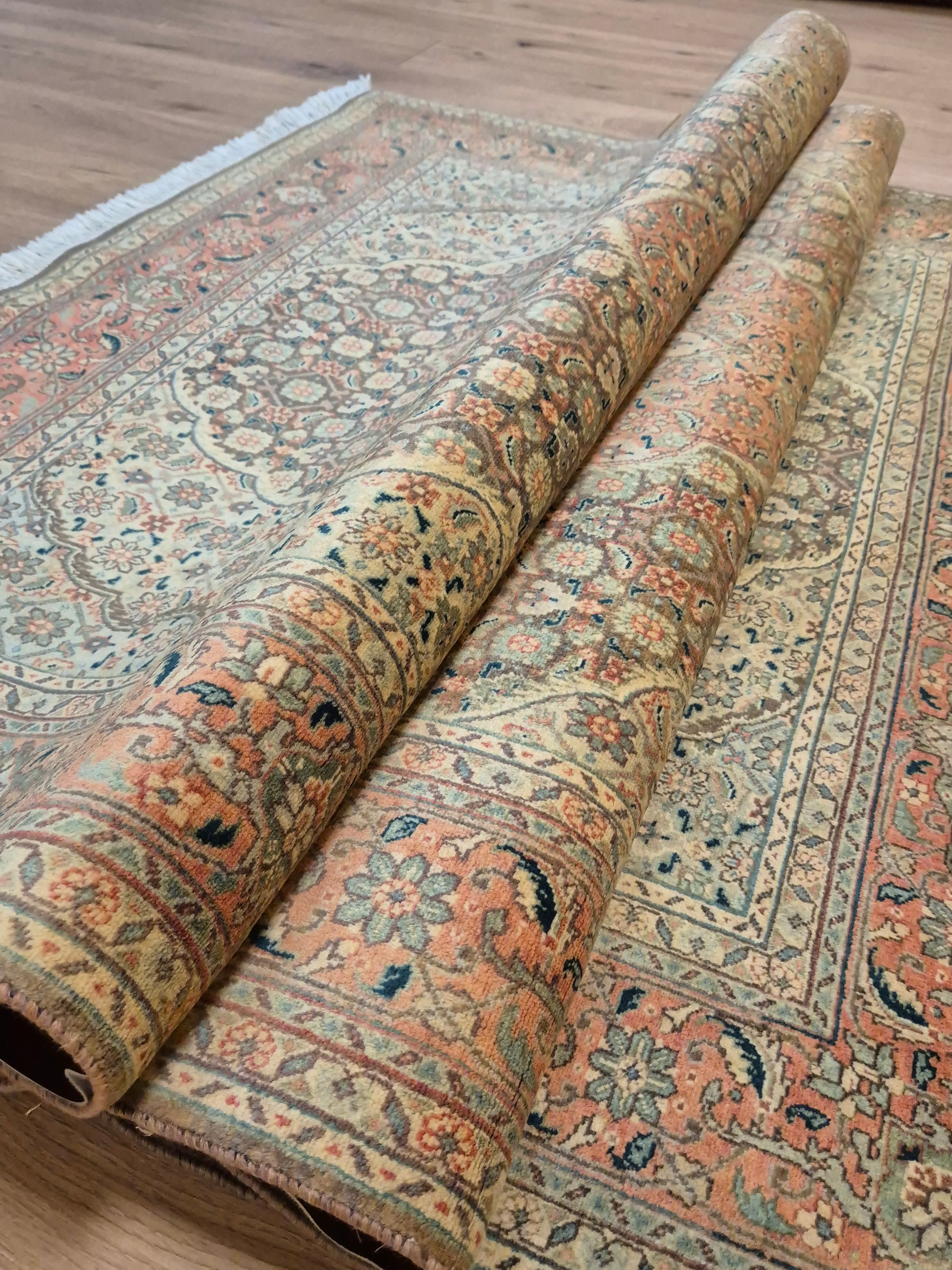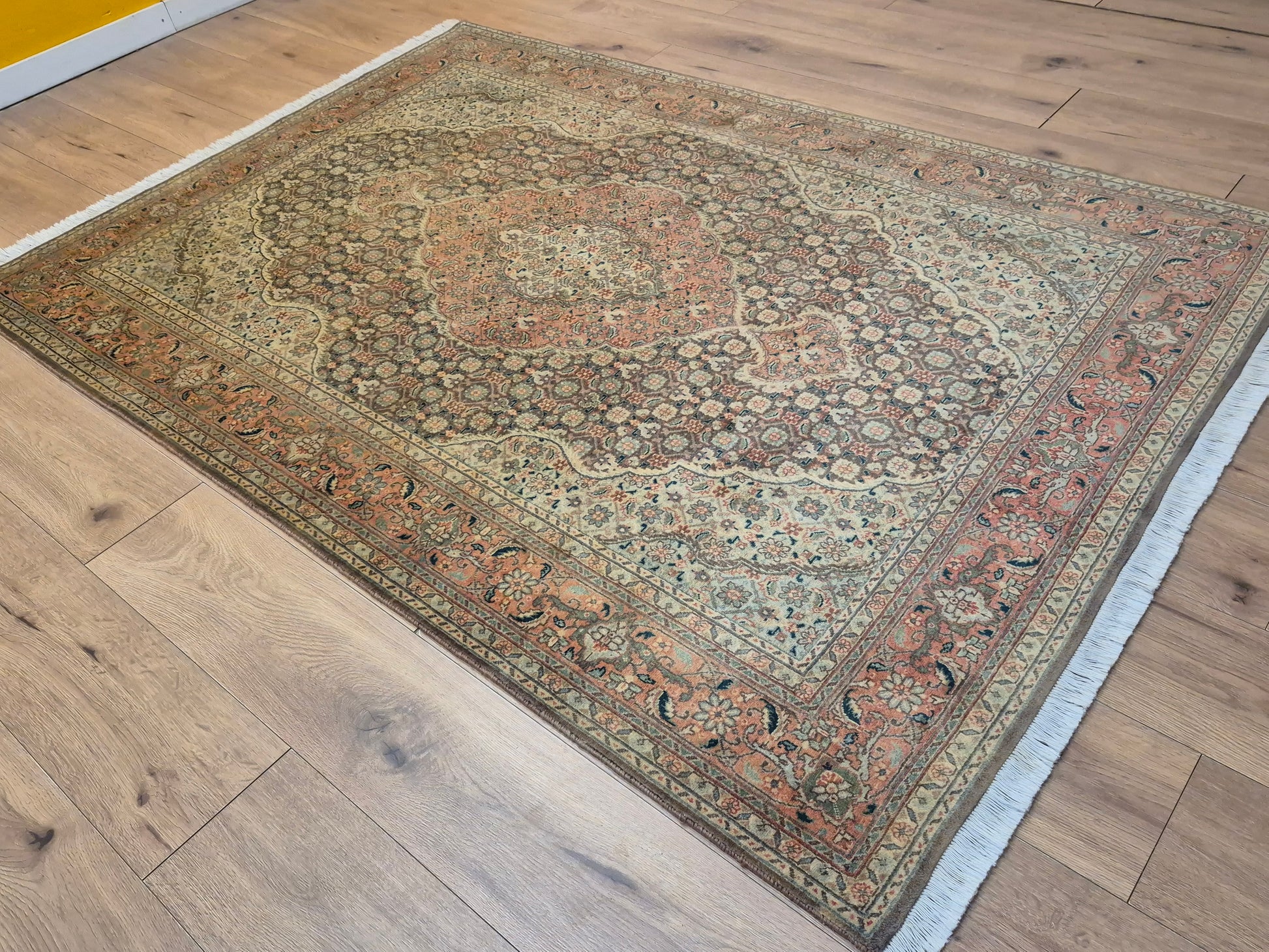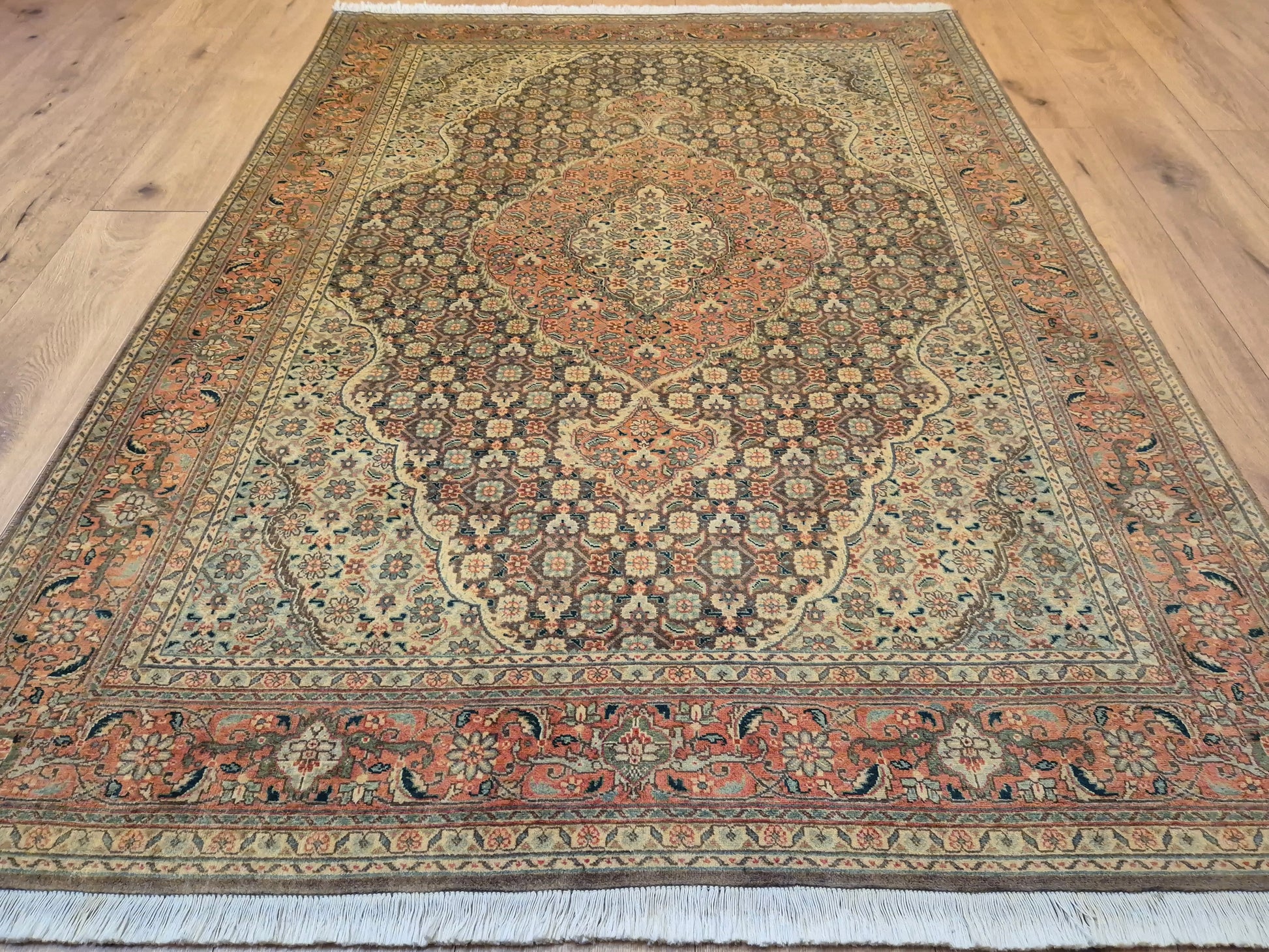 angeboten wird ein klassischer Täbriz Teppich aus feiner Korkwolle, handgeknüpft in detailreicher Ausführung. Das Design zeigt ein großes Zentralmedaillon, eingebettet in das berühmte Mahi-Muster (Fischmuster), das sich in feiner Wiederholung über das gesamte Feld erstreckt. Die Bordüre ist reich mit floralen Ornamenten gestaltet und rundet die elegante Komposition harmonisch ab.