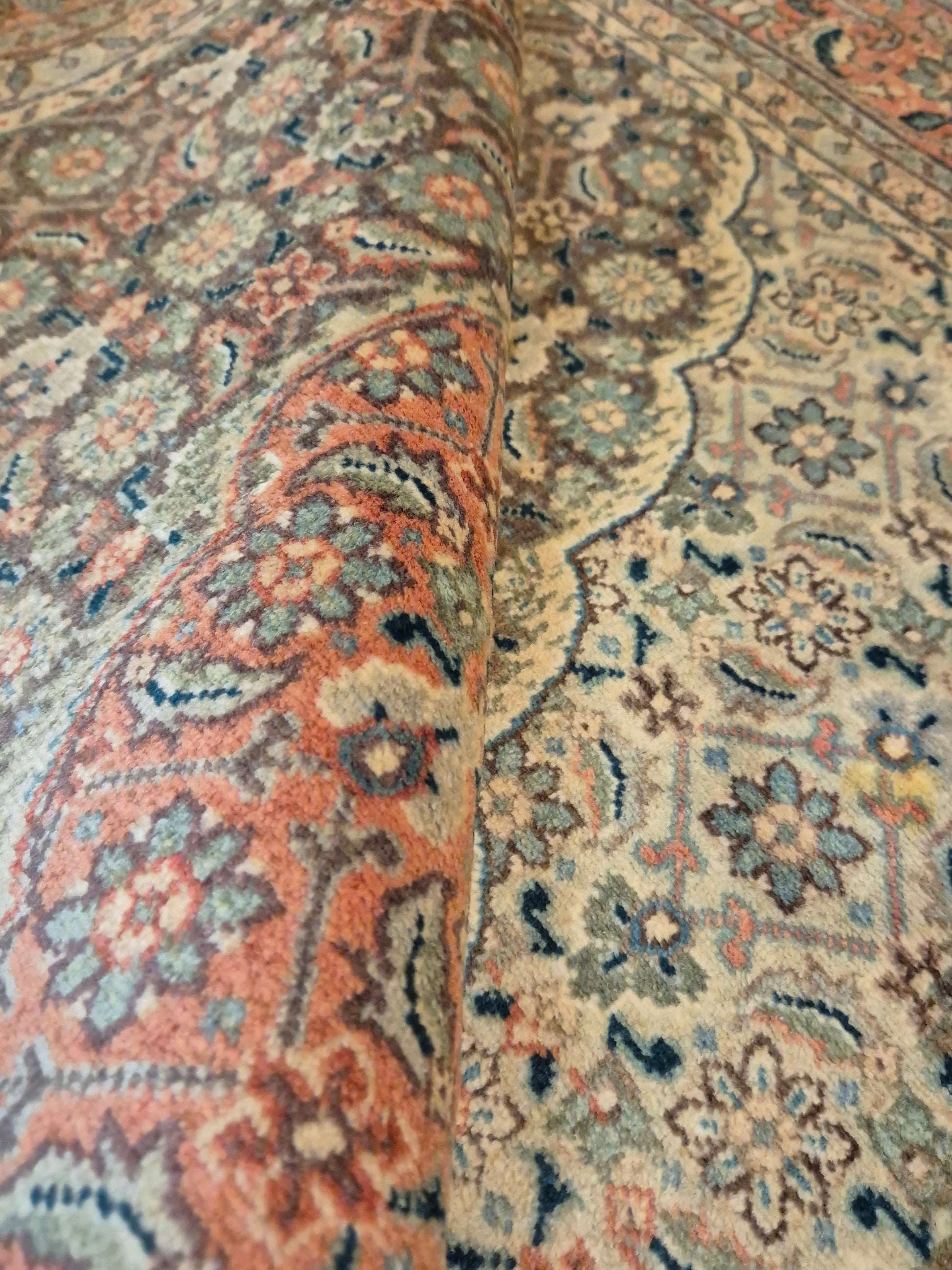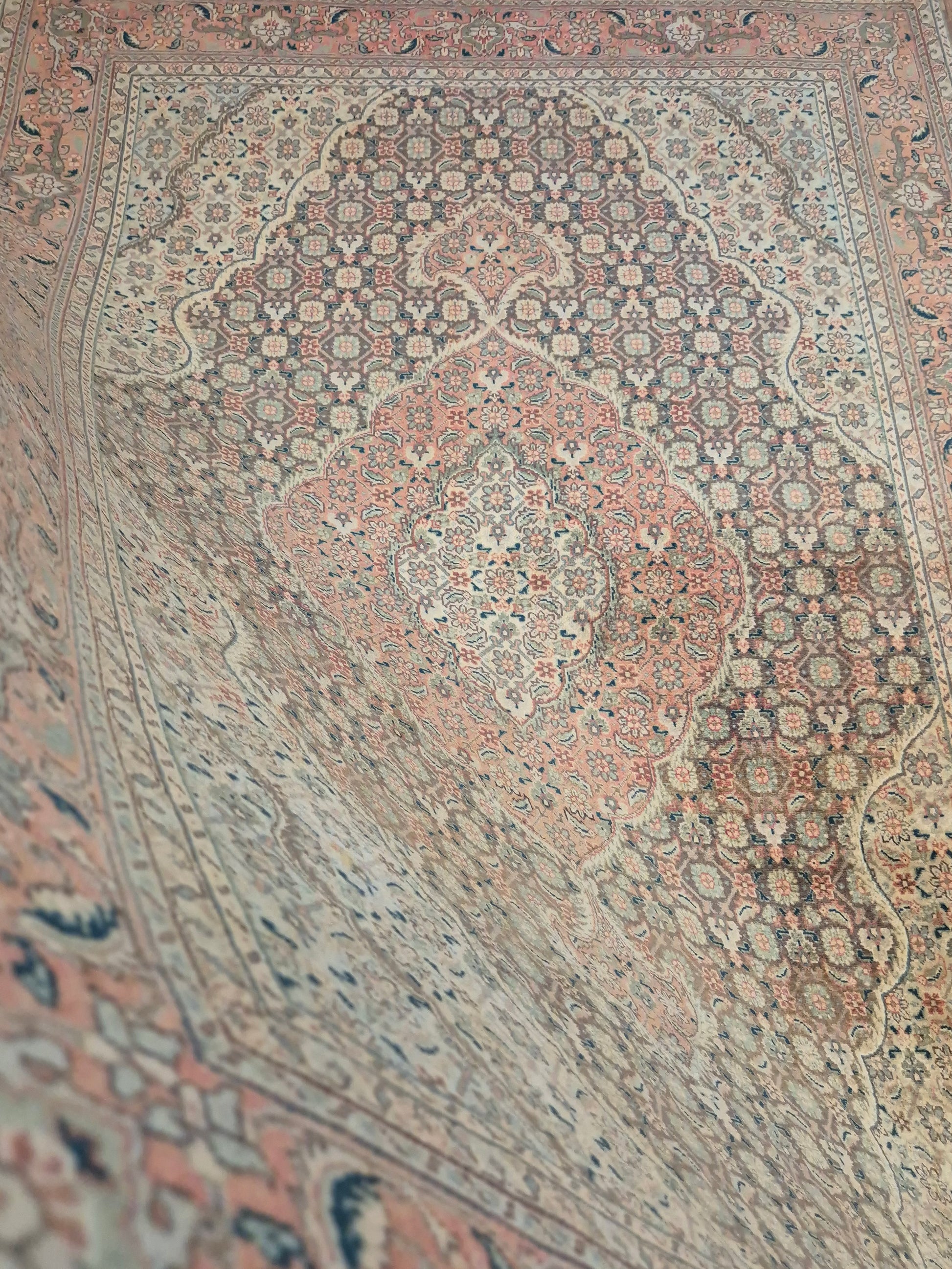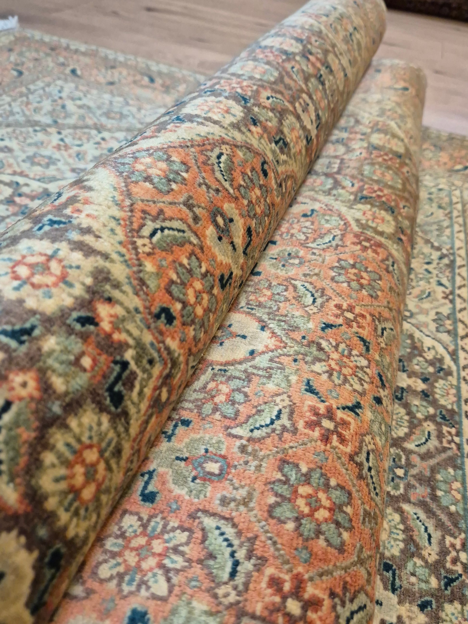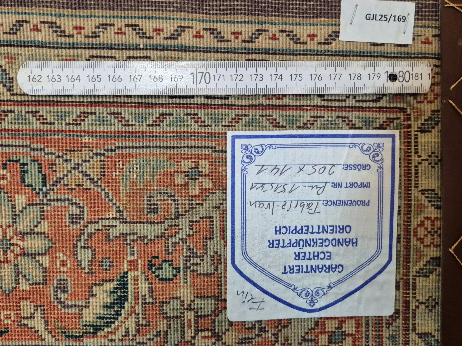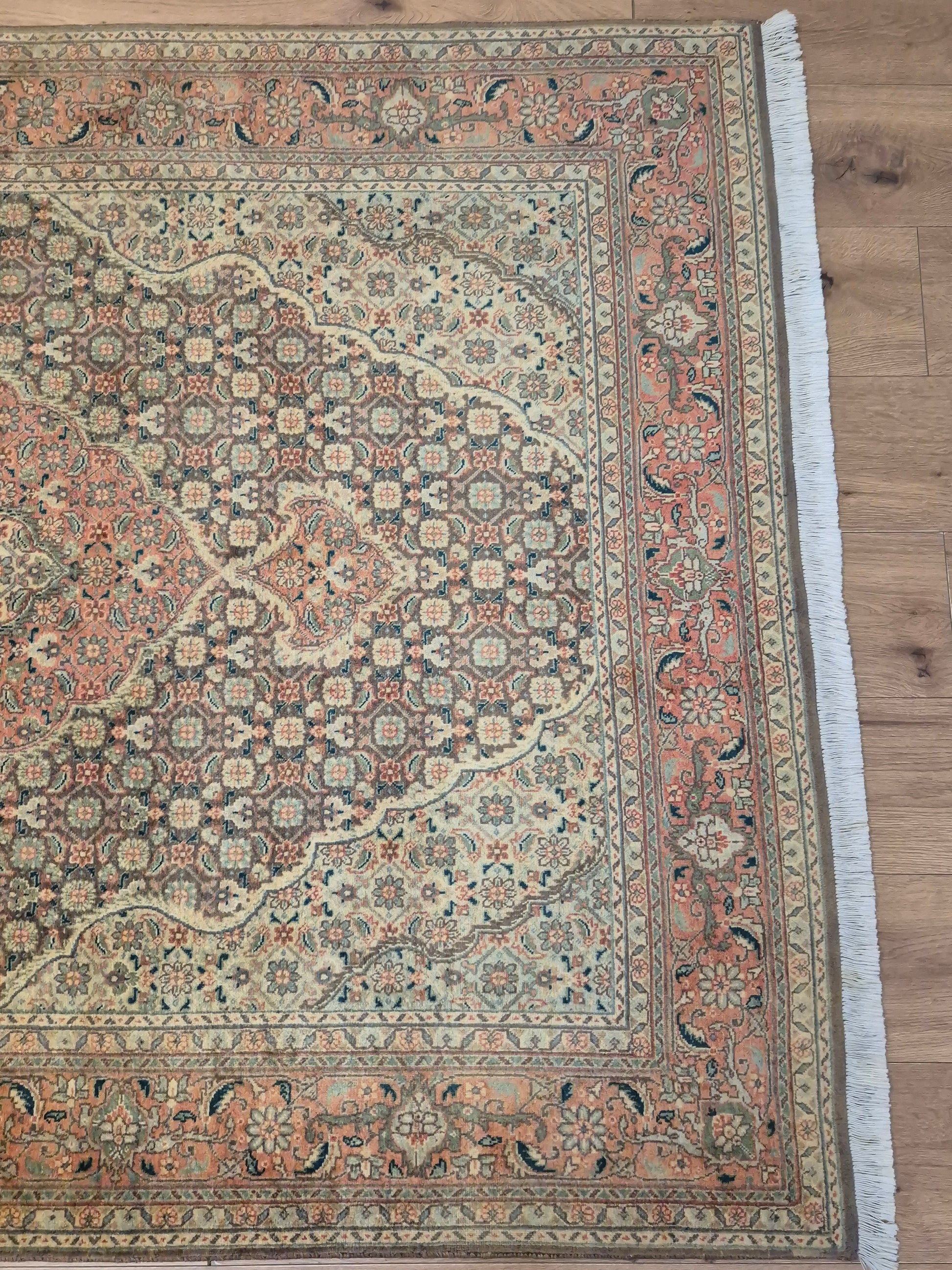 angeboten wird ein klassischer Täbriz Teppich aus feiner Korkwolle, handgeknüpft in detailreicher Ausführung. Das Design zeigt ein großes Zentralmedaillon, eingebettet in das berühmte Mahi-Muster (Fischmuster), das sich in feiner Wiederholung über das gesamte Feld erstreckt. Die Bordüre ist reich mit floralen Ornamenten gestaltet und rundet die elegante Komposition harmonisch ab.