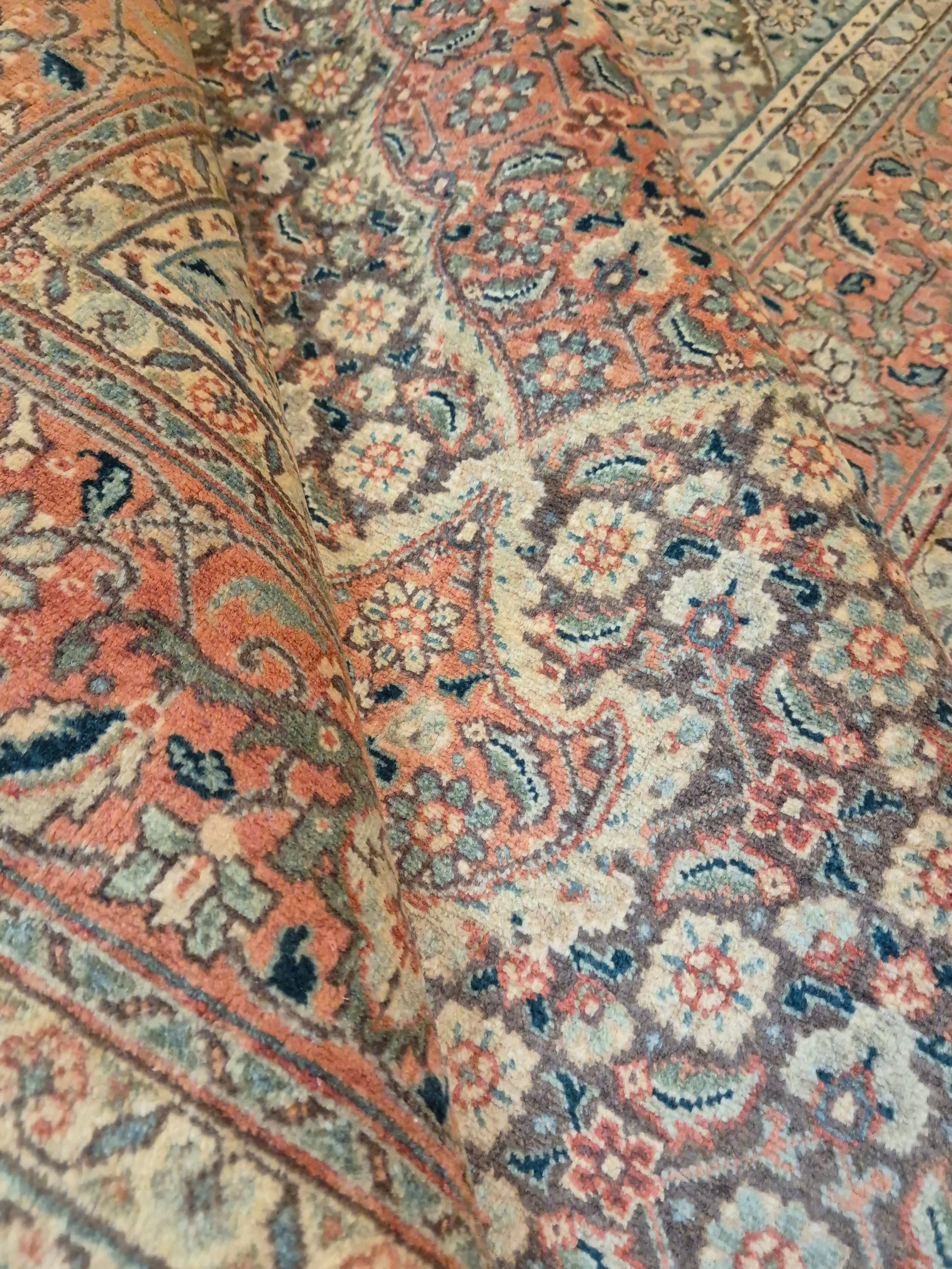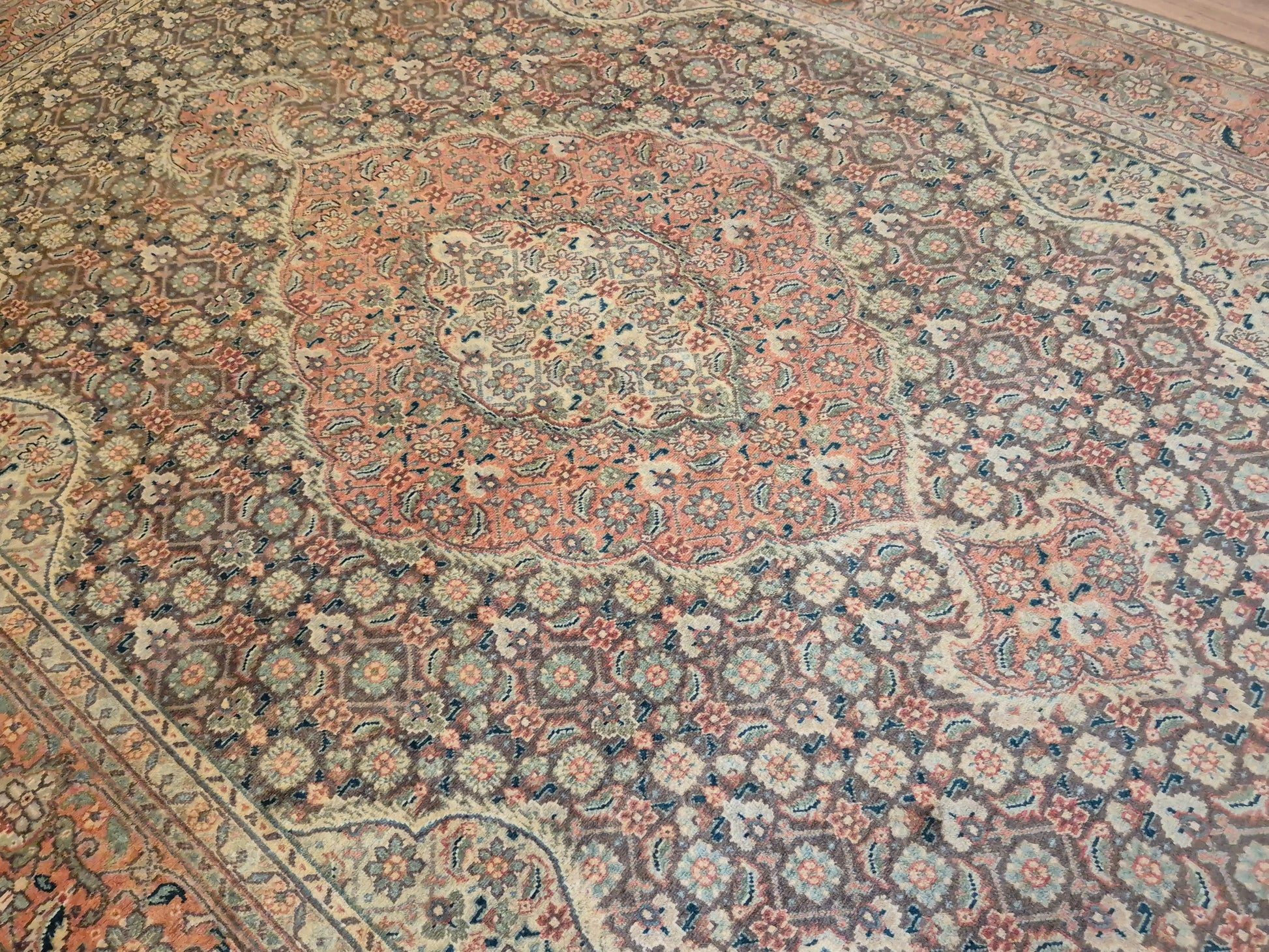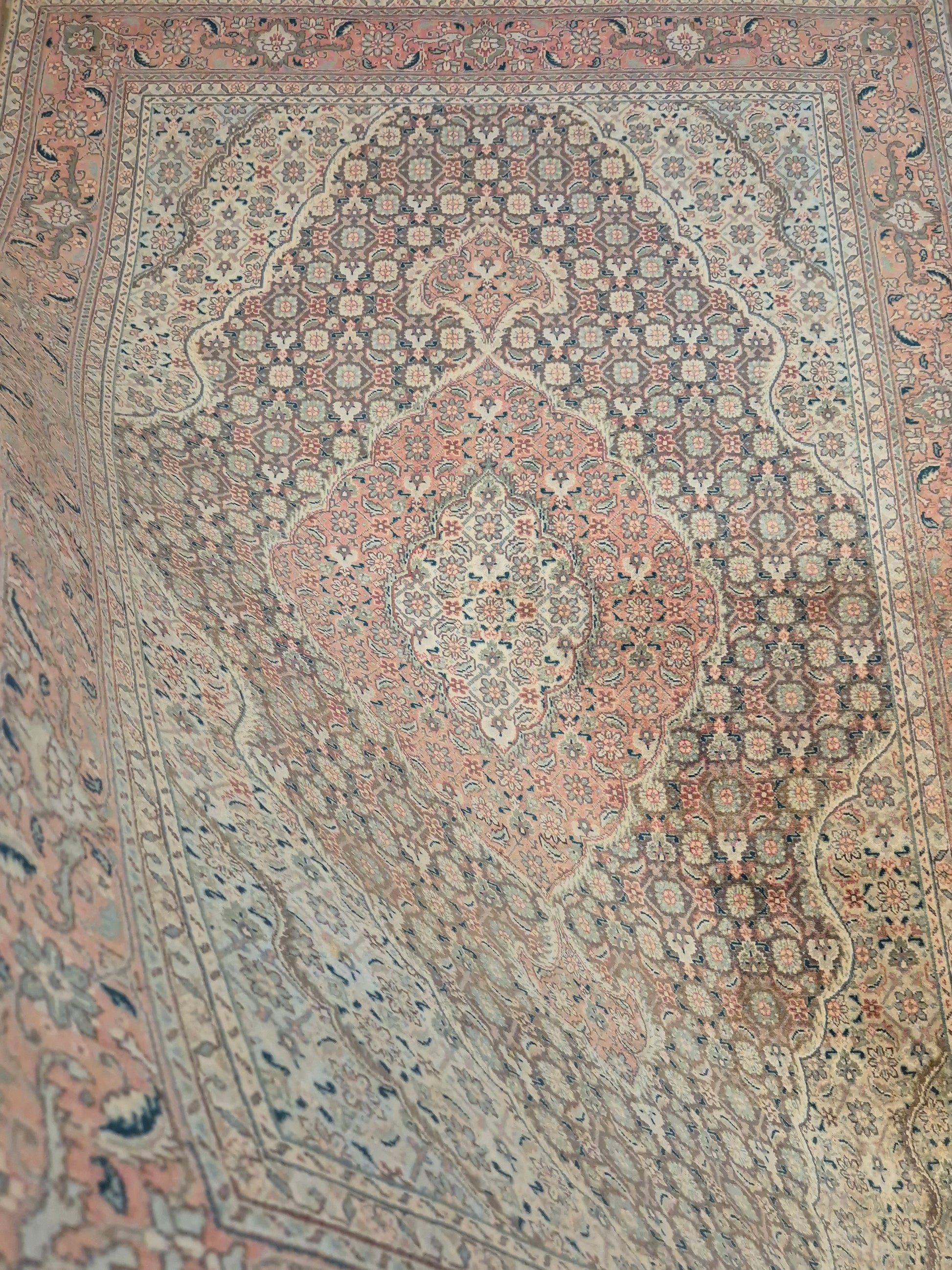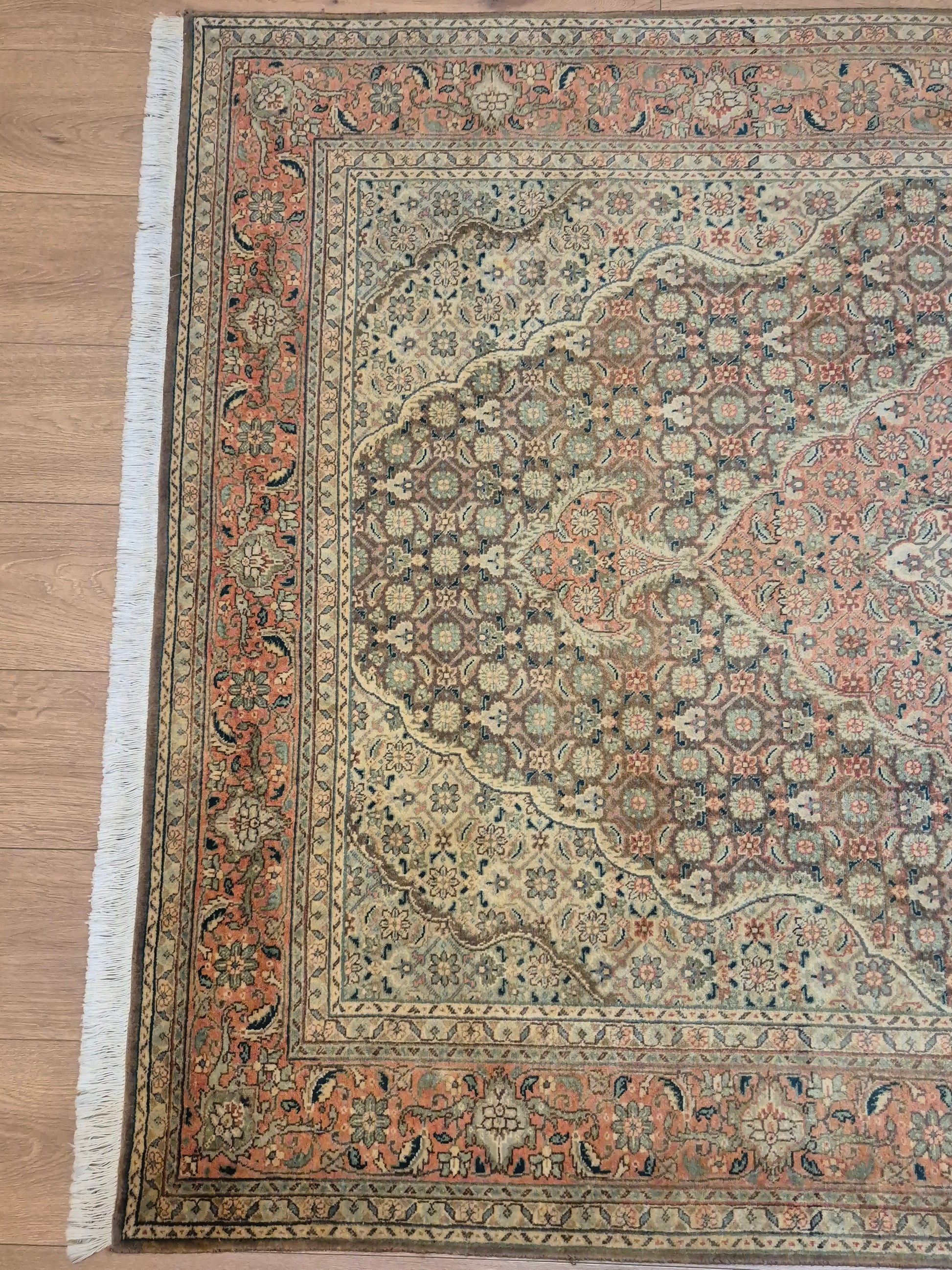 angeboten wird ein klassischer Täbriz Teppich aus feiner Korkwolle, handgeknüpft in detailreicher Ausführung. Das Design zeigt ein großes Zentralmedaillon, eingebettet in das berühmte Mahi-Muster (Fischmuster), das sich in feiner Wiederholung über das gesamte Feld erstreckt. Die Bordüre ist reich mit floralen Ornamenten gestaltet und rundet die elegante Komposition harmonisch ab.