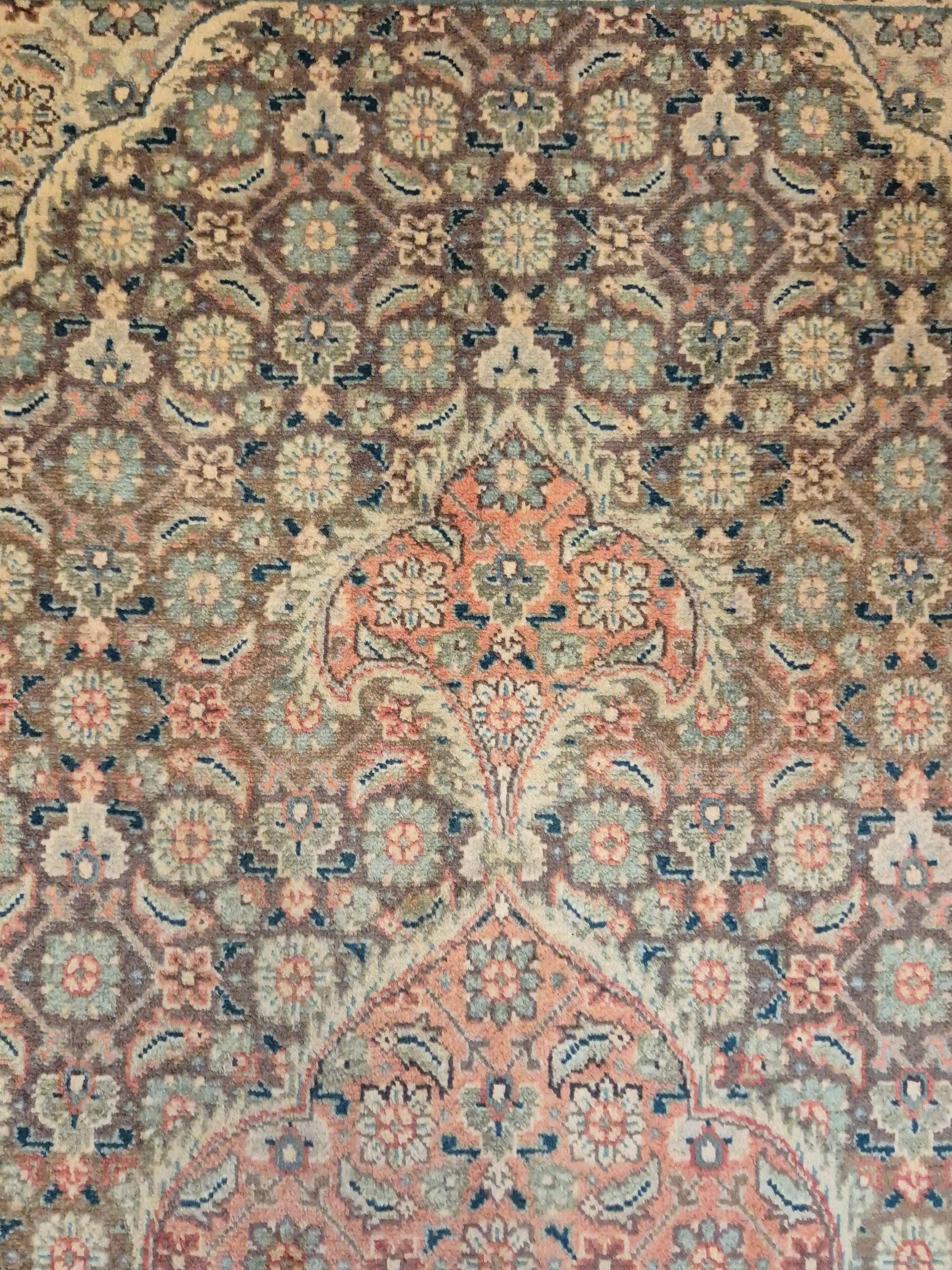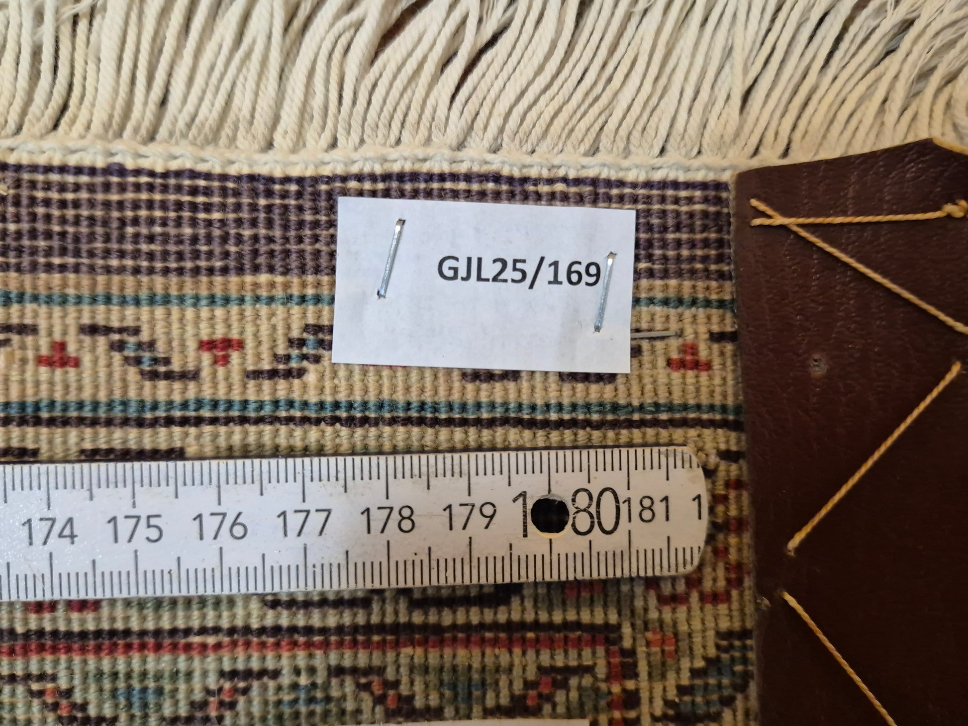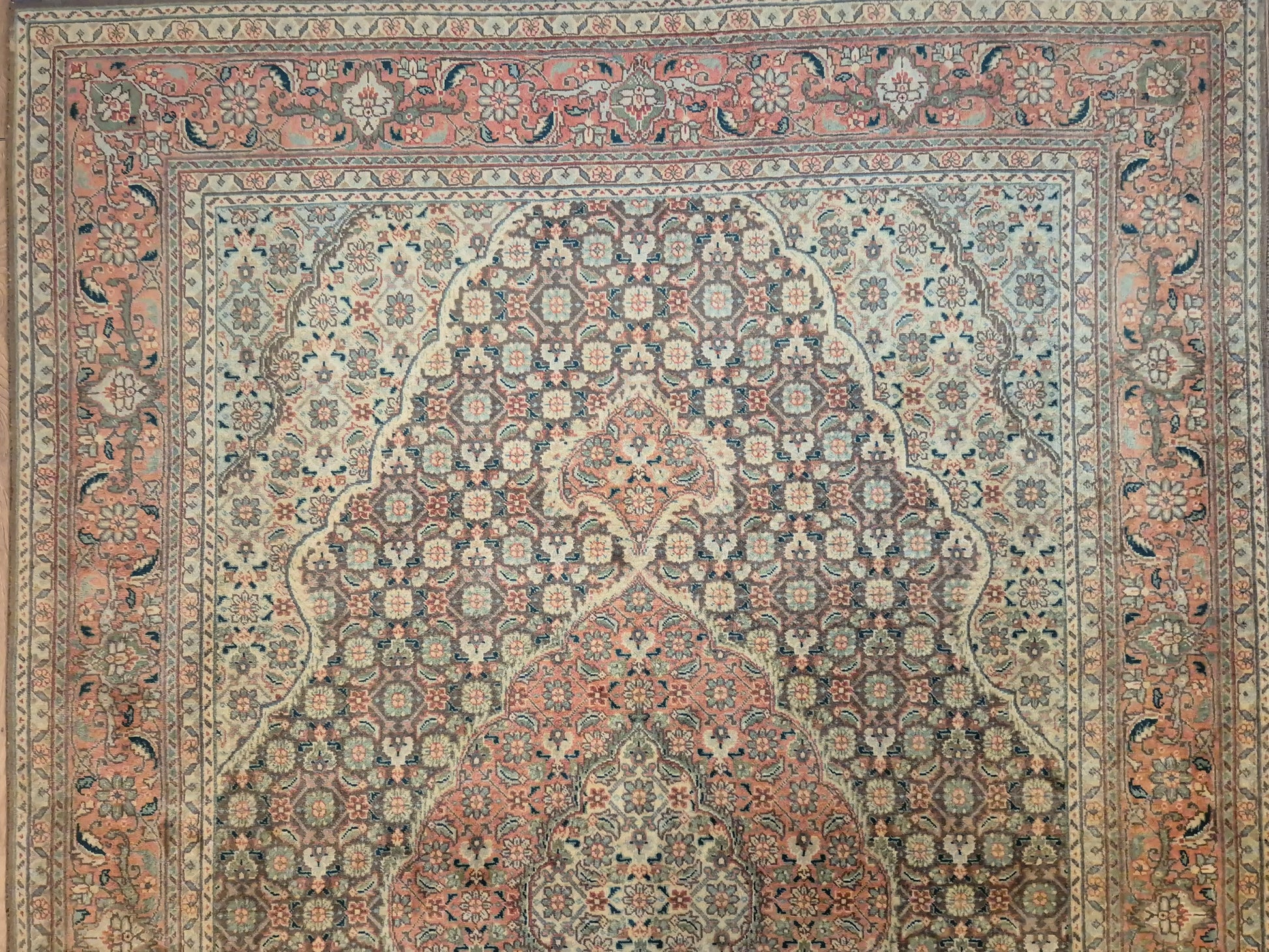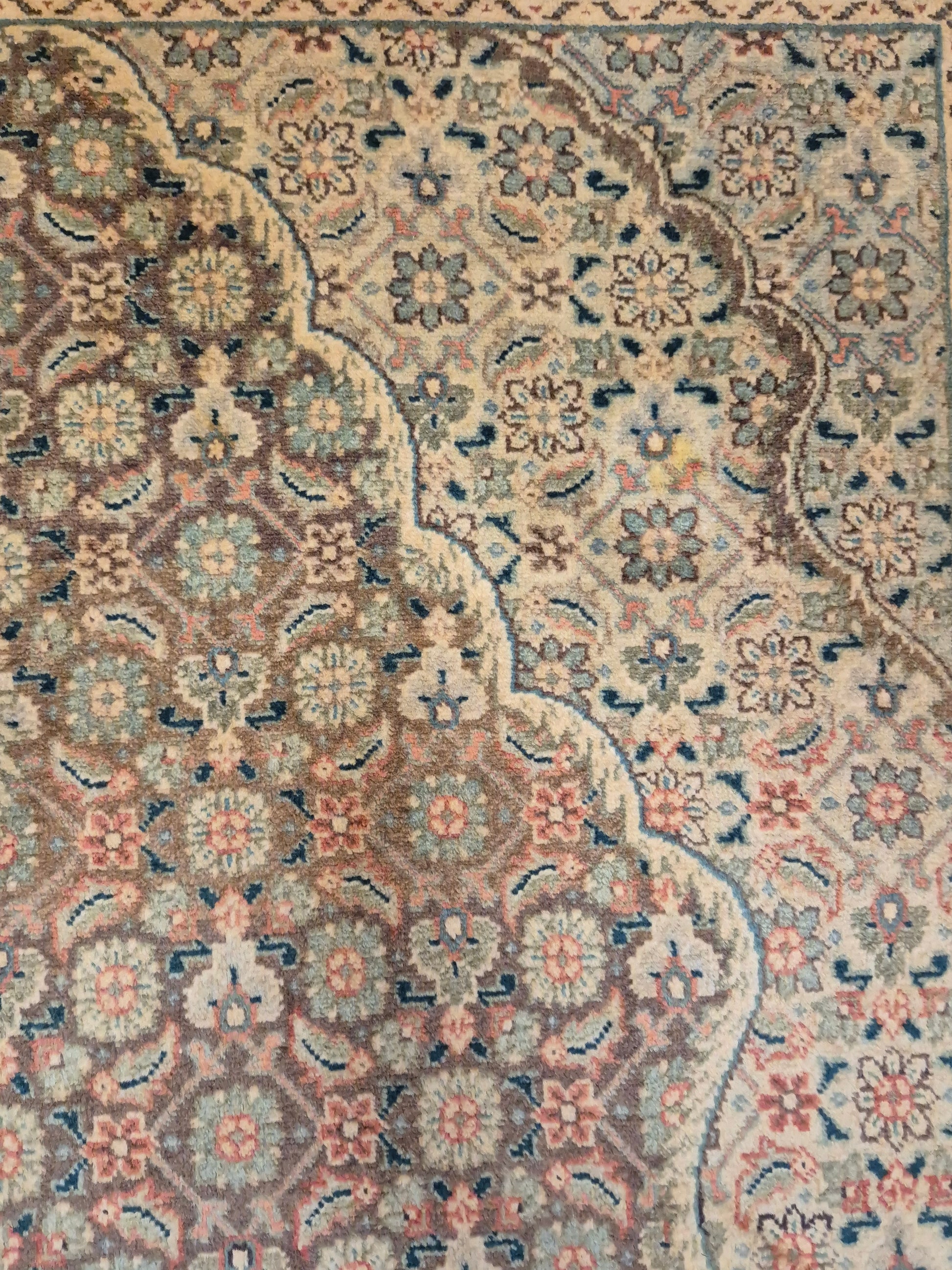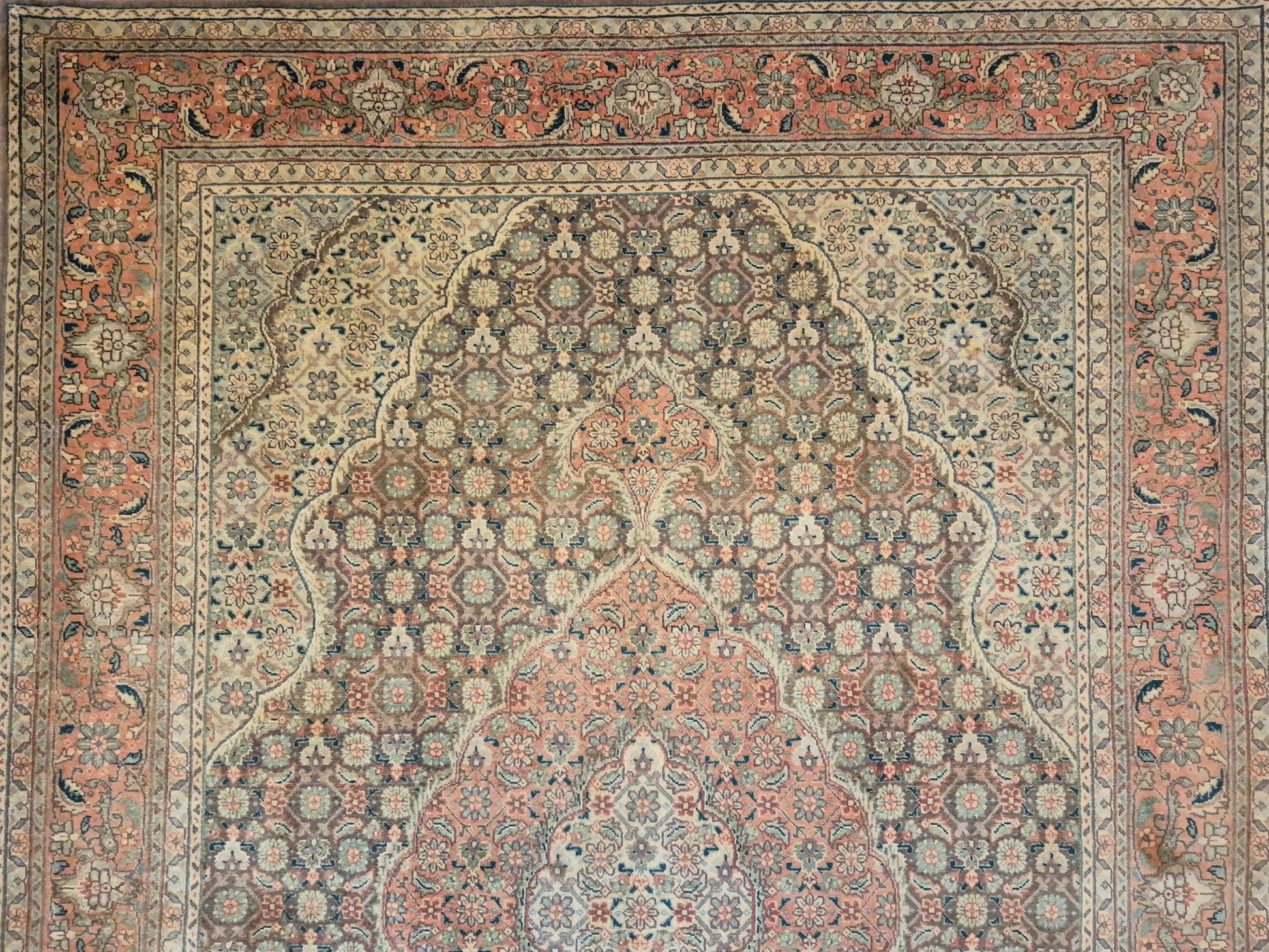 angeboten wird ein klassischer Täbriz Teppich aus feiner Korkwolle, handgeknüpft in detailreicher Ausführung. Das Design zeigt ein großes Zentralmedaillon, eingebettet in das berühmte Mahi-Muster (Fischmuster), das sich in feiner Wiederholung über das gesamte Feld erstreckt. Die Bordüre ist reich mit floralen Ornamenten gestaltet und rundet die elegante Komposition harmonisch ab.