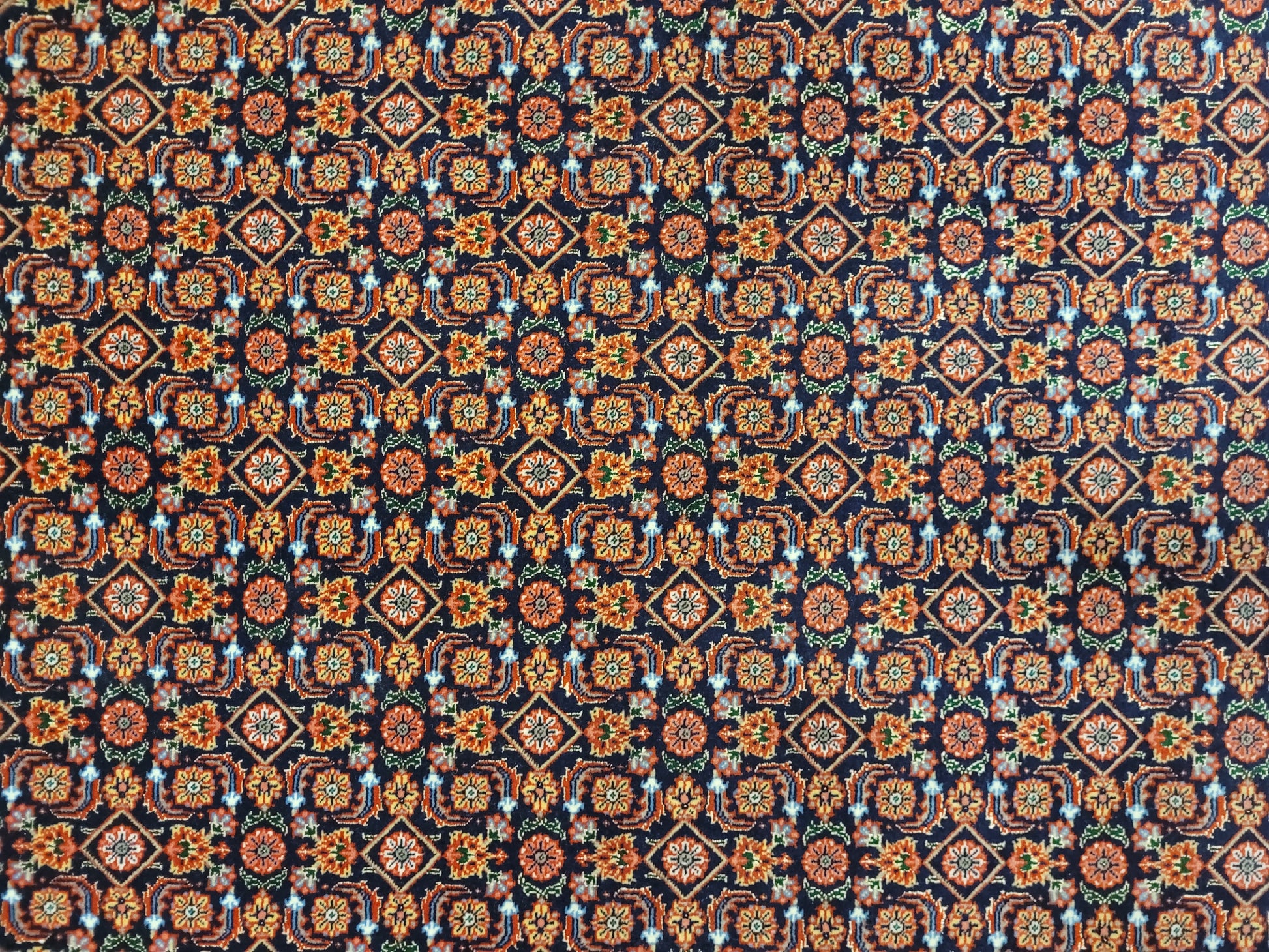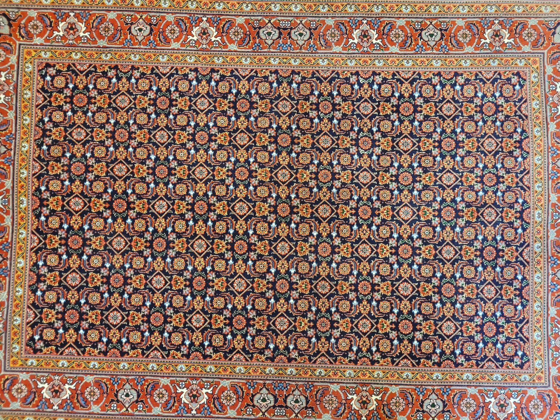 angeboten wird ein erlesener Täbriz Teppich aus Korkwolle mit Seide, handgeknüpft in feiner Ausführung. Das Teppichfeld zeigt ein dicht gearbeitetes Allover-Muster mit kleinen stern- und rosettenförmigen Ornamenten, die in strenger Symmetrie angeordnet sind. Die kräftigen Farben in Kombination mit seidigen Glanzlichtern verleihen dem Teppich eine edle Strahlkraft.