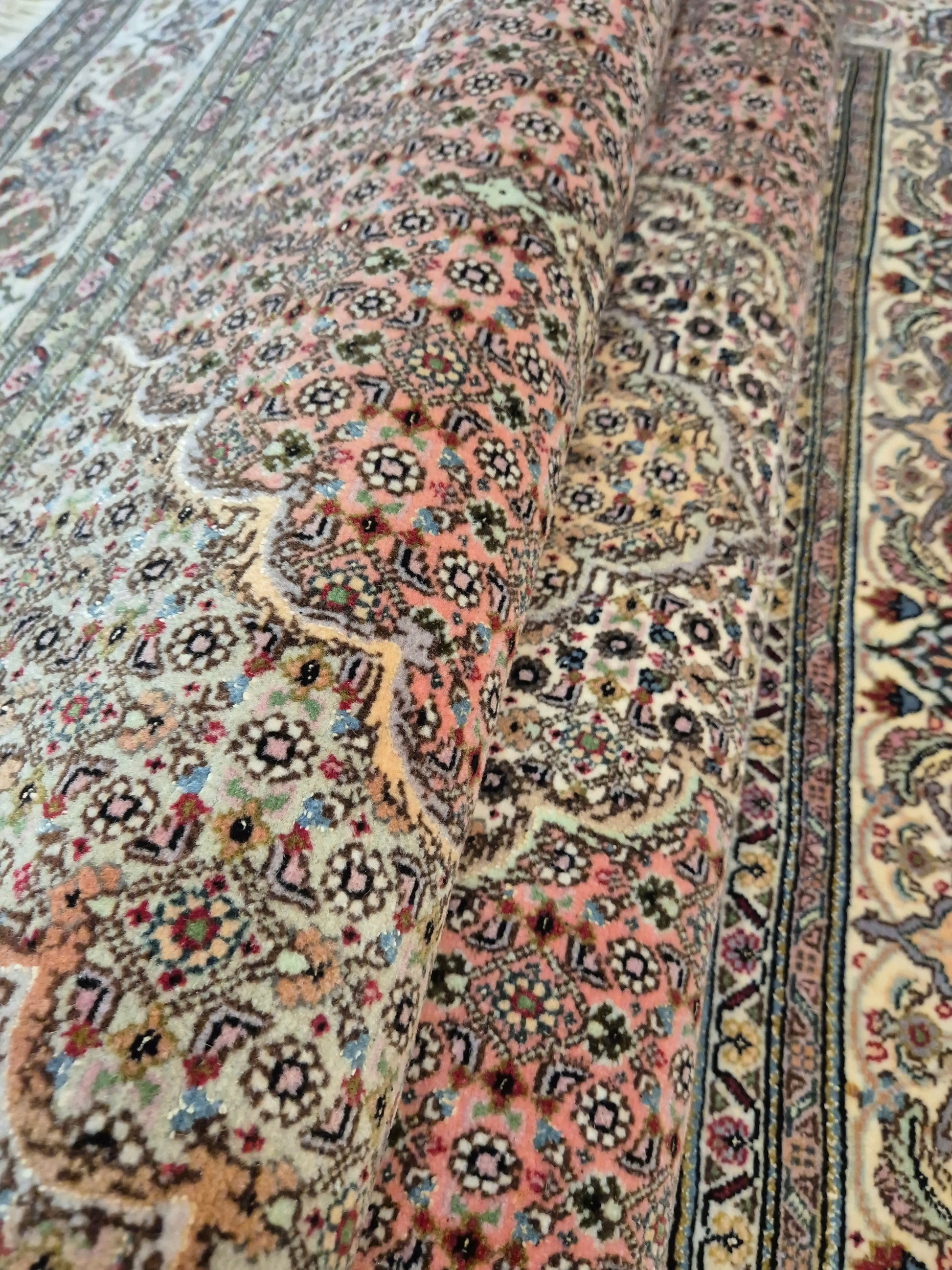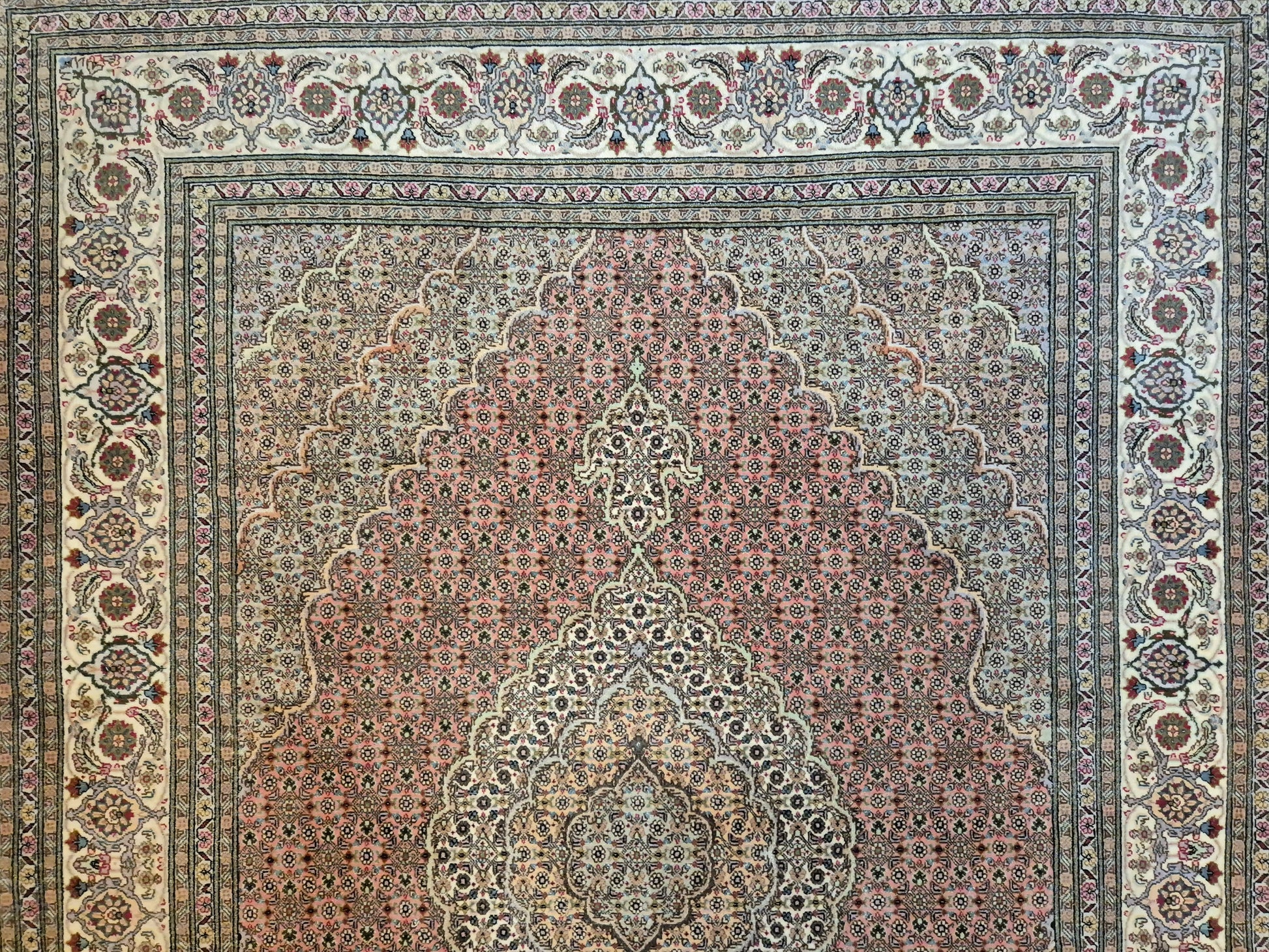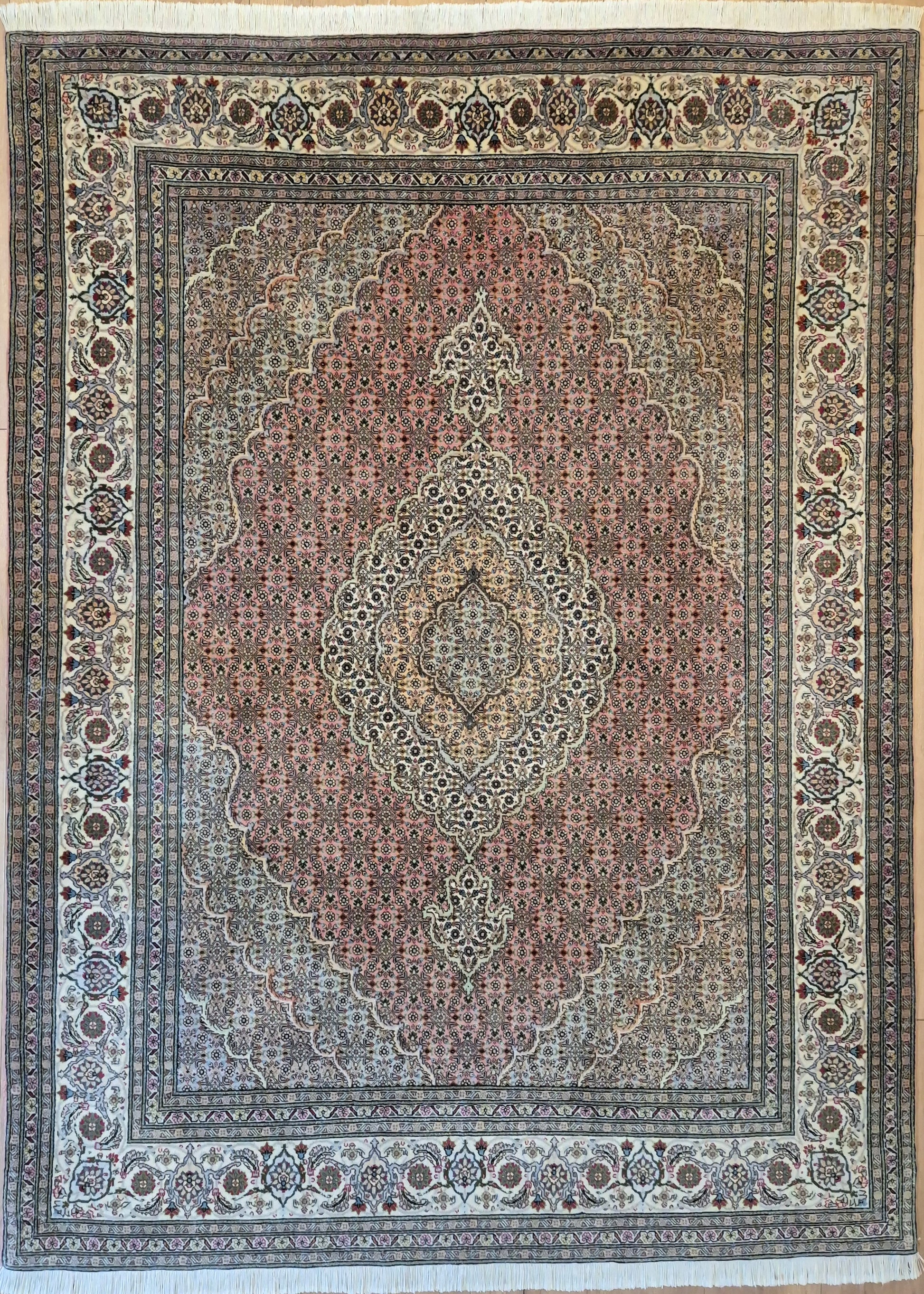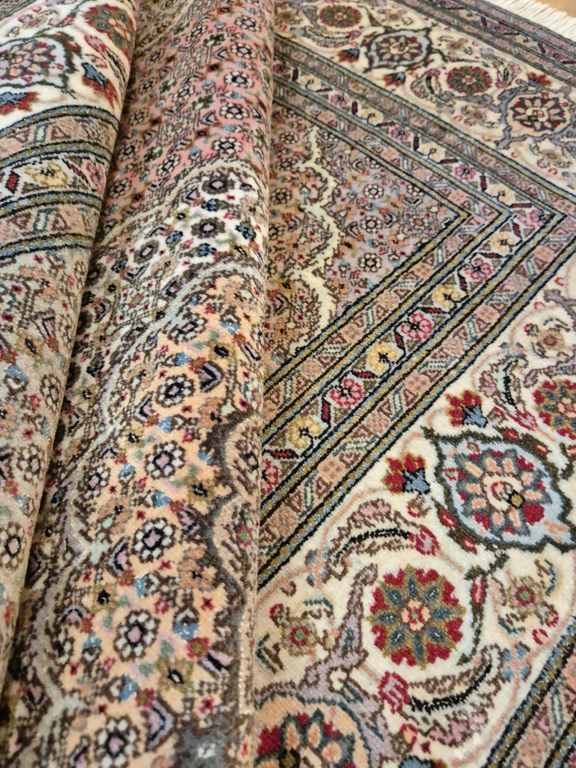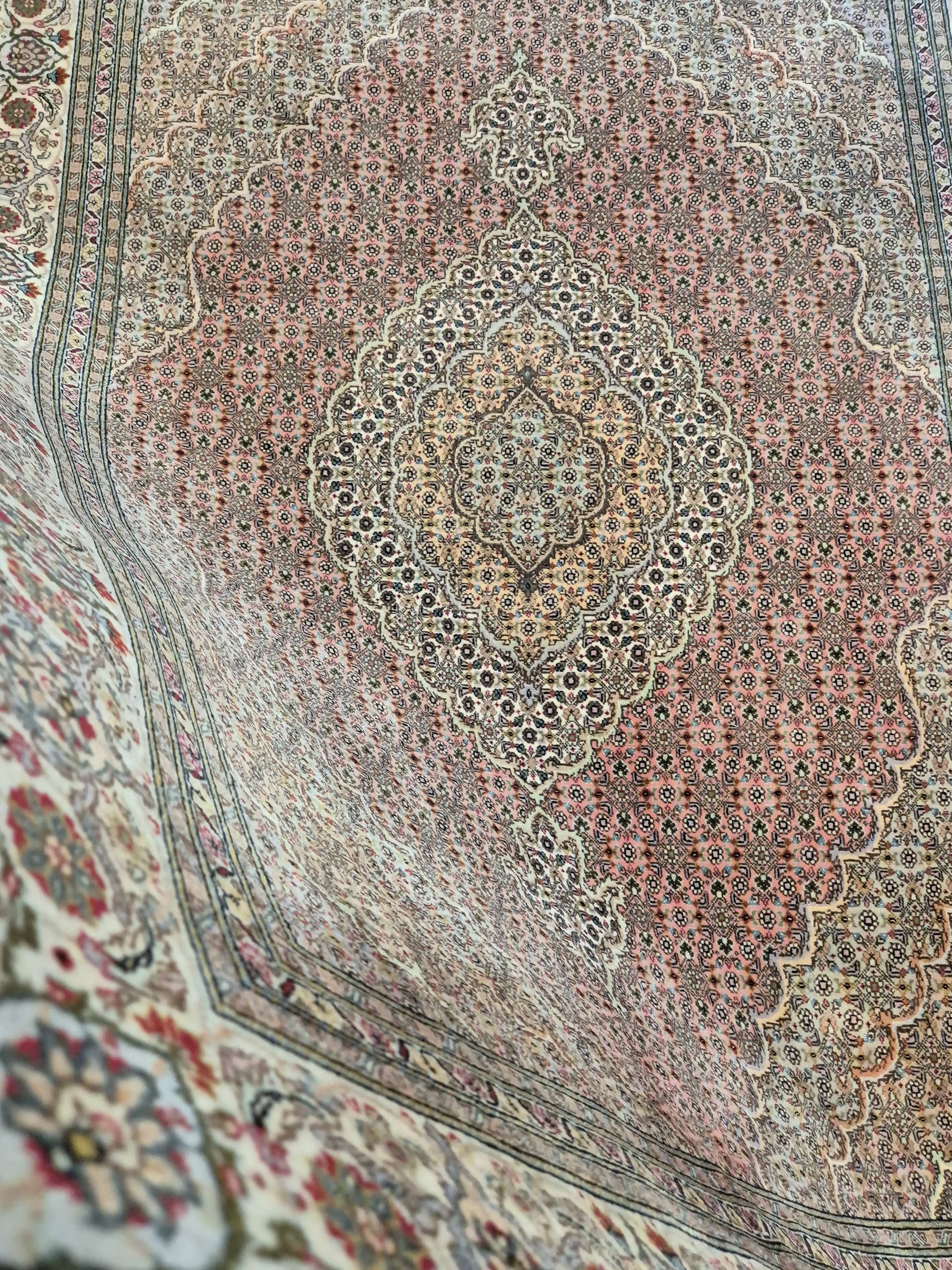 angeboten wird ein exquisiter Täbriz Teppich aus feiner Korkwolle mit Seidenakzenten, handgeknüpft in besonders detailreicher Ausführung. Das kunstvolle Medaillon im Zentrum ist von einer symmetrischen Anordnung floraler Motive umgeben, die sich in sanften Wellen bis in die Ecken des Feldes ausbreiten. Die helle Bordüre mit reich gestalteten Blütenornamenten bildet einen harmonischen Kontrast und unterstreicht die elegante Gesamtwirkung.