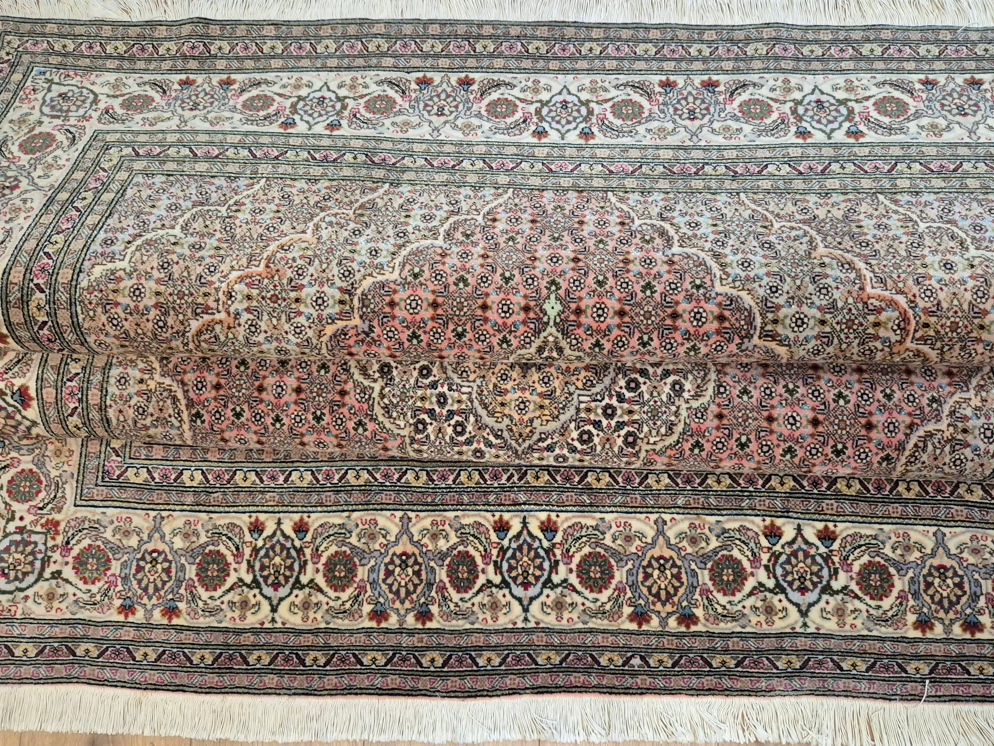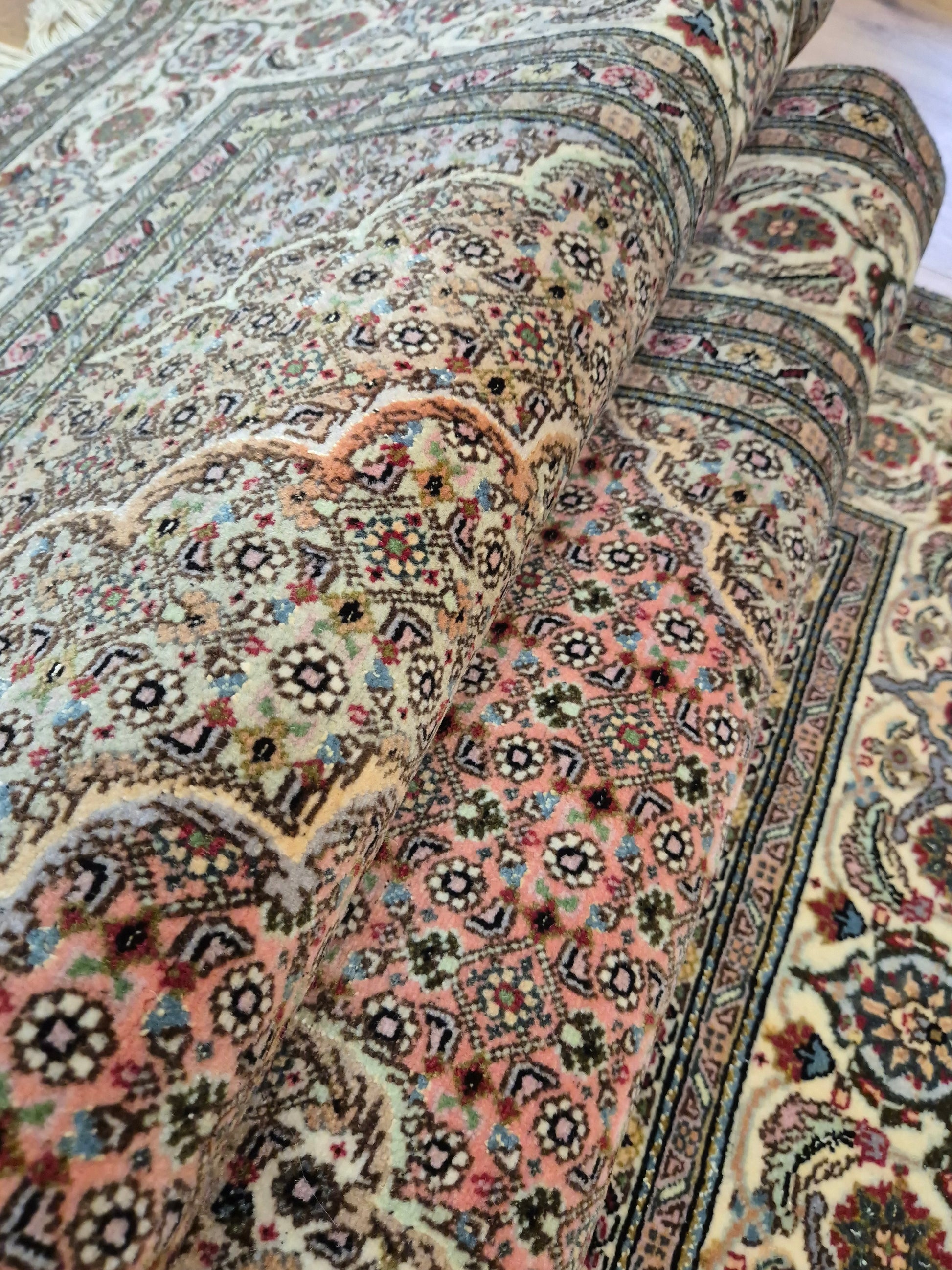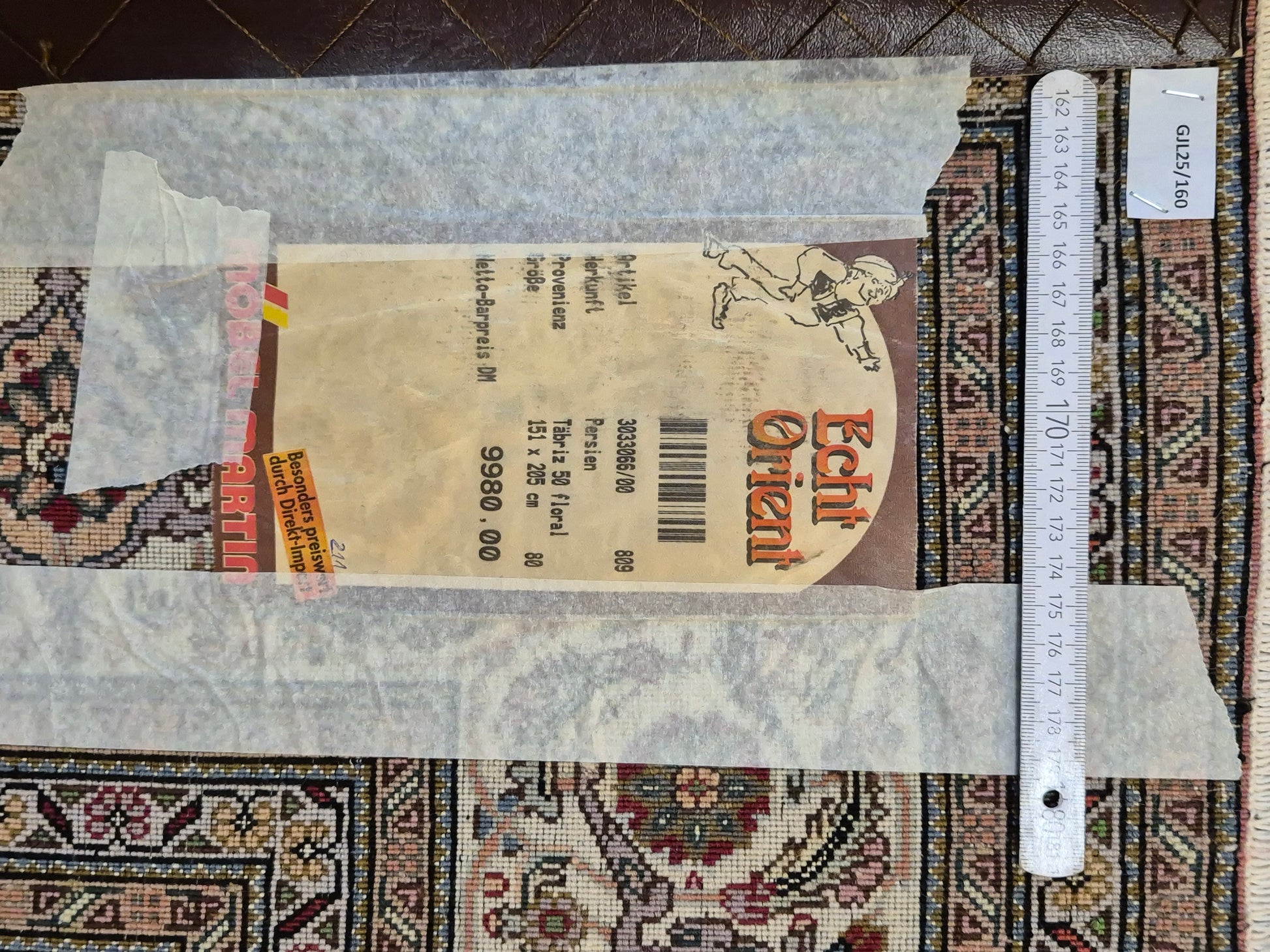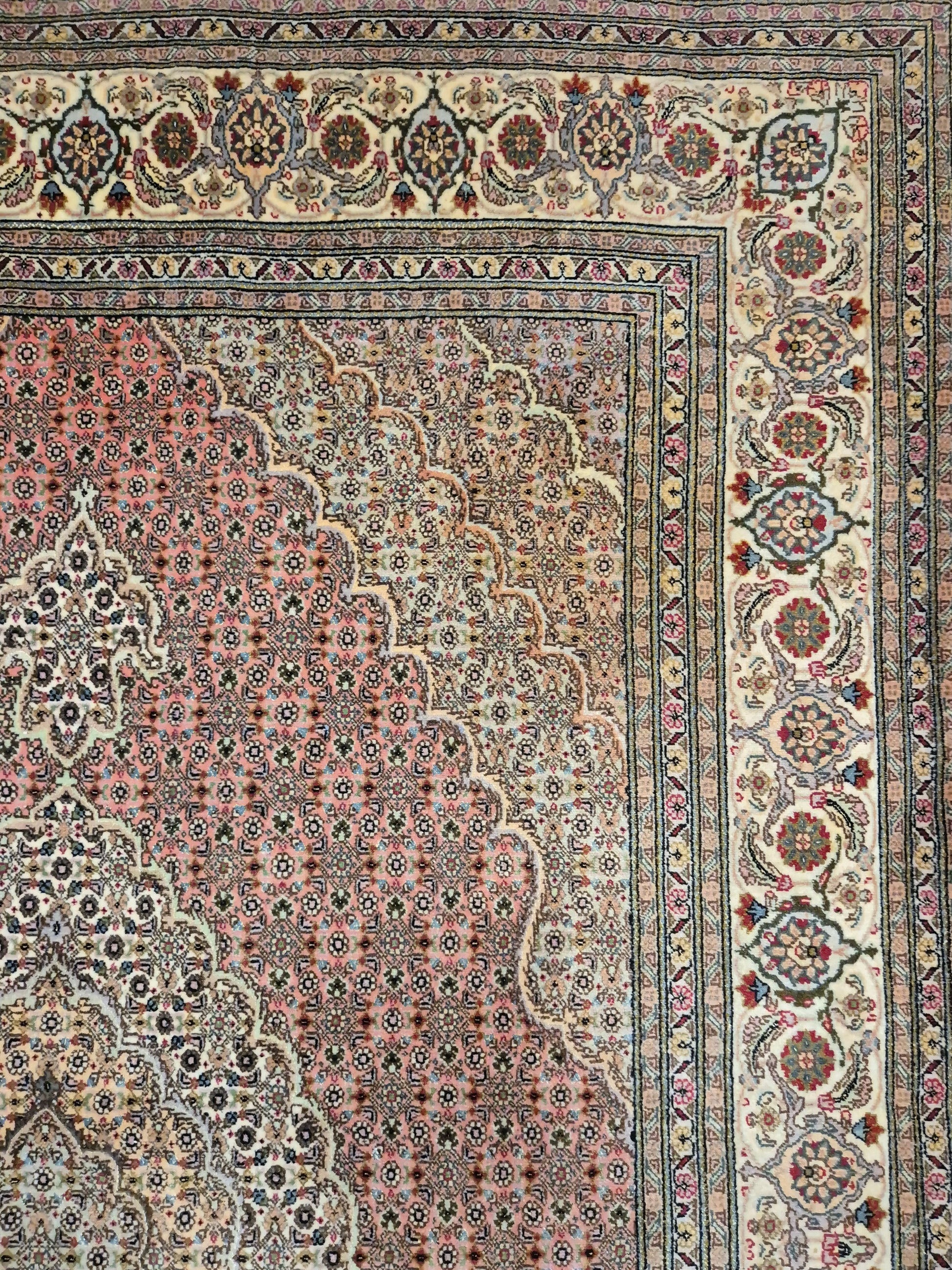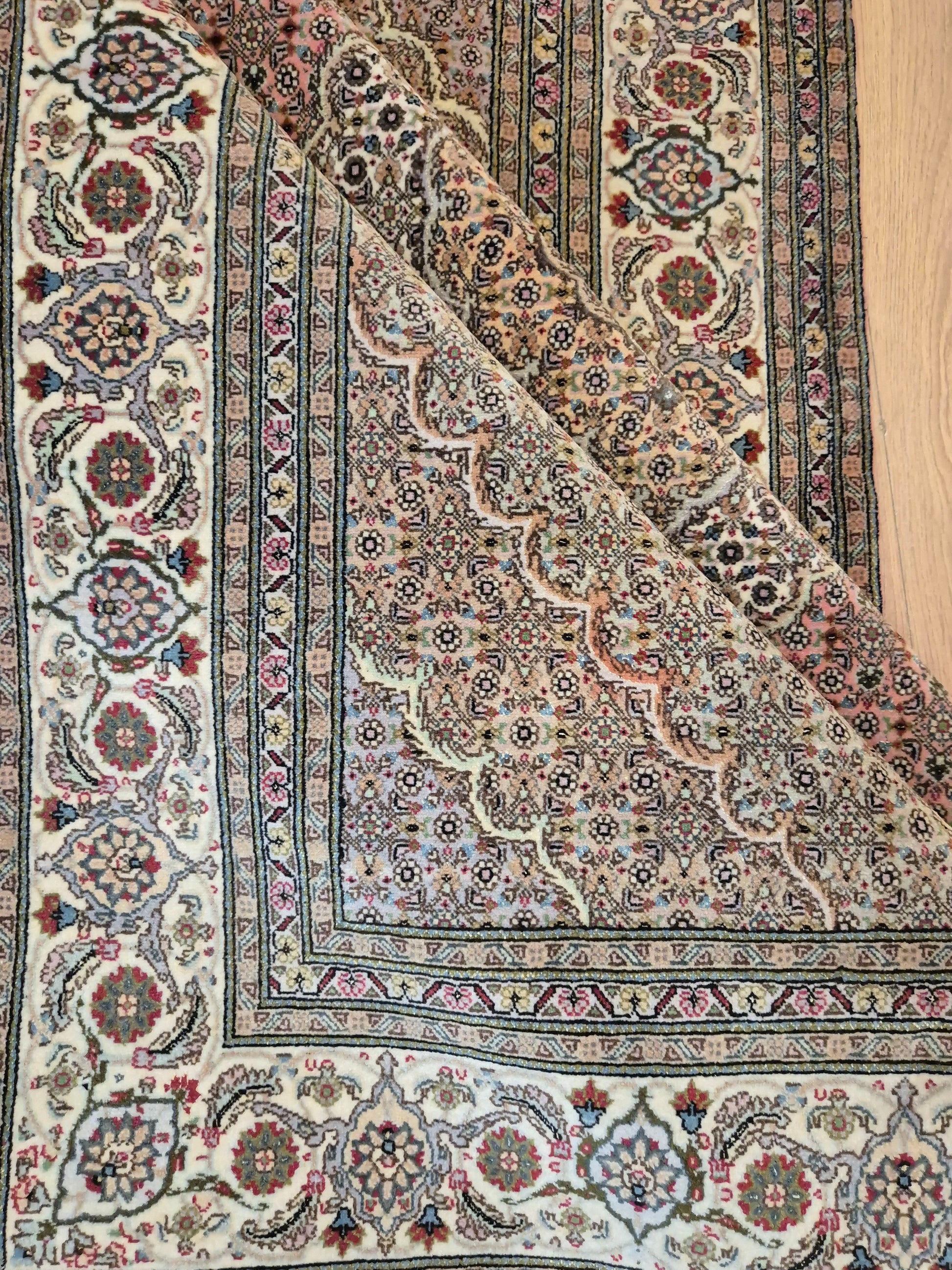 angeboten wird ein exquisiter Täbriz Teppich aus feiner Korkwolle mit Seidenakzenten, handgeknüpft in besonders detailreicher Ausführung. Das kunstvolle Medaillon im Zentrum ist von einer symmetrischen Anordnung floraler Motive umgeben, die sich in sanften Wellen bis in die Ecken des Feldes ausbreiten. Die helle Bordüre mit reich gestalteten Blütenornamenten bildet einen harmonischen Kontrast und unterstreicht die elegante Gesamtwirkung.