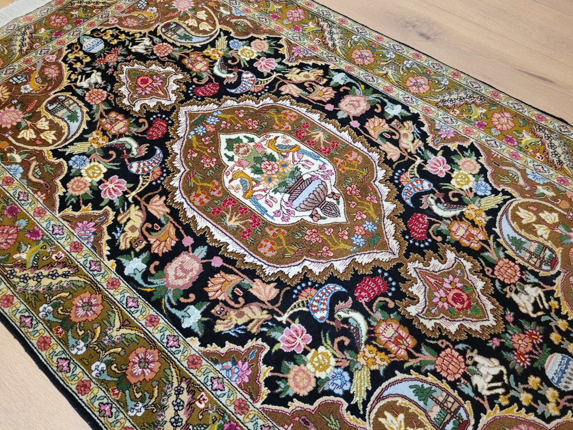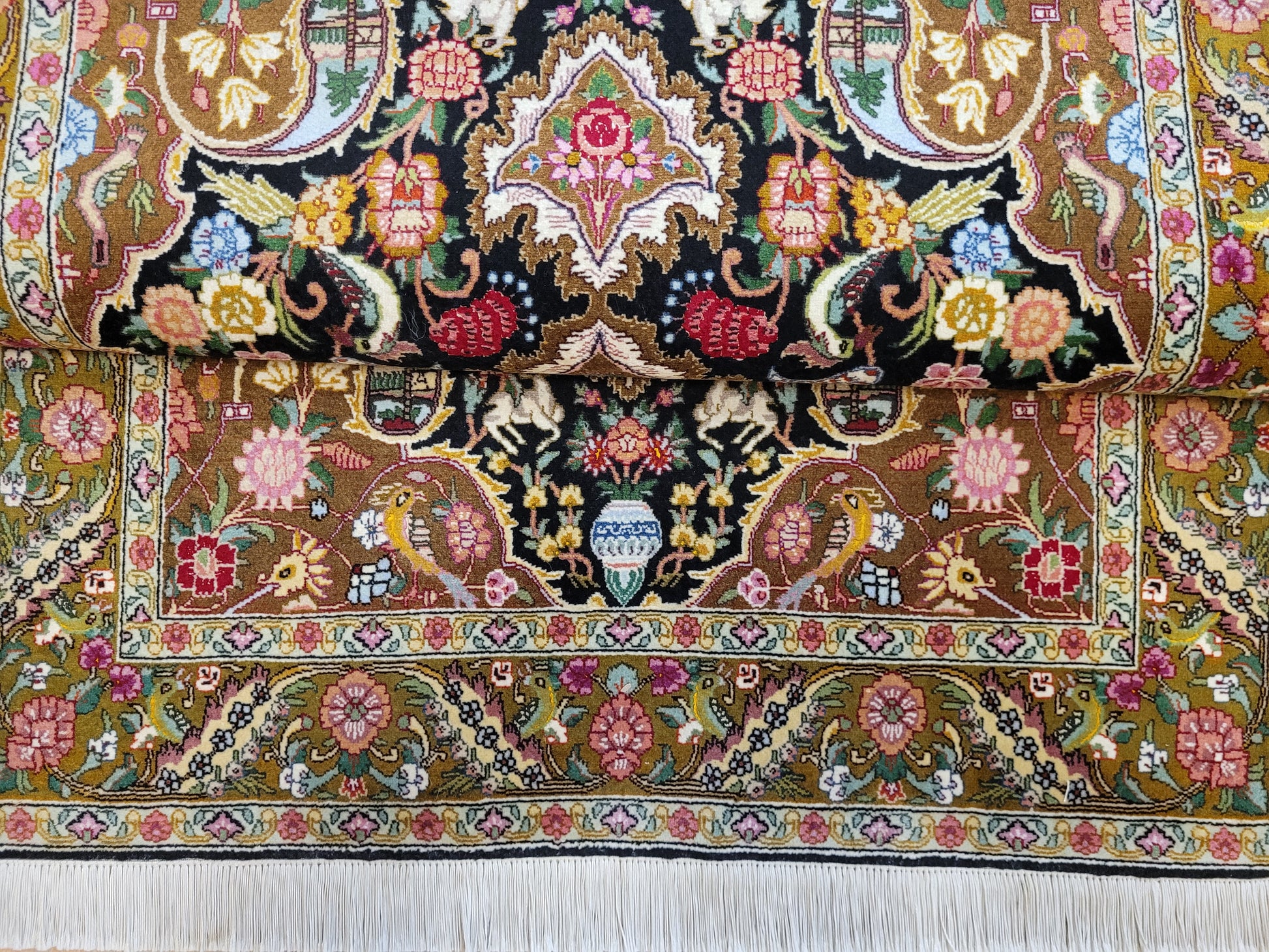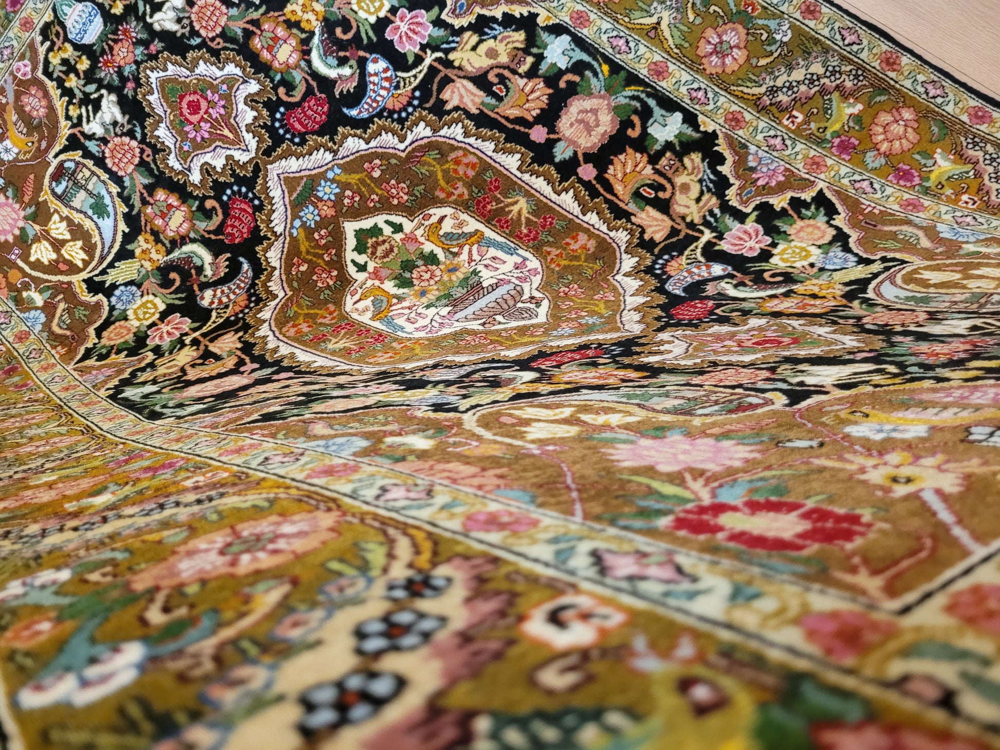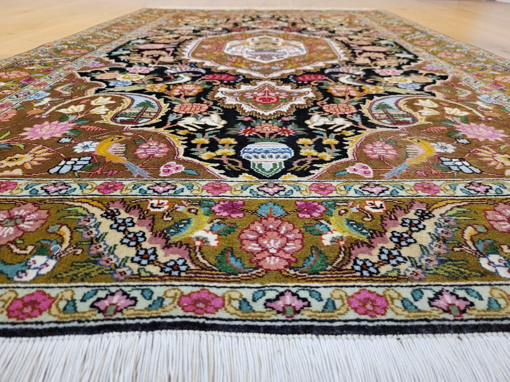angeboten wird ein erlesener Täbriz Teppich aus feiner Korkwolle mit Seide, handgeknüpft in detailreicher Knüpfkunst. Im Zentrum steht ein ornamentales Medaillon mit einer reich gefüllten Vase, flankiert von filigranen Vögeln und Blüten. Die Umrahmung zeigt eine opulente florale Gestaltung mit Ranken, Blüten und Tierdarstellungen, die dem Teppich eine besonders harmonische und zugleich repräsentative Ausstrahlung verleihen.