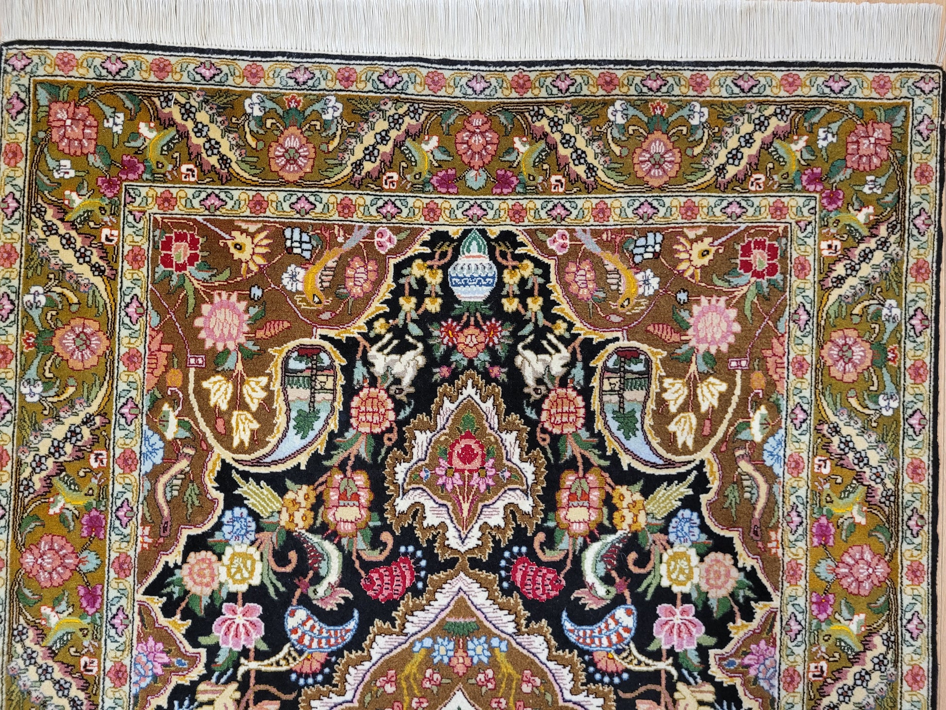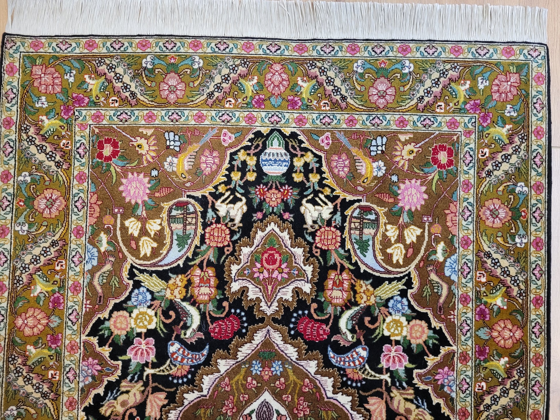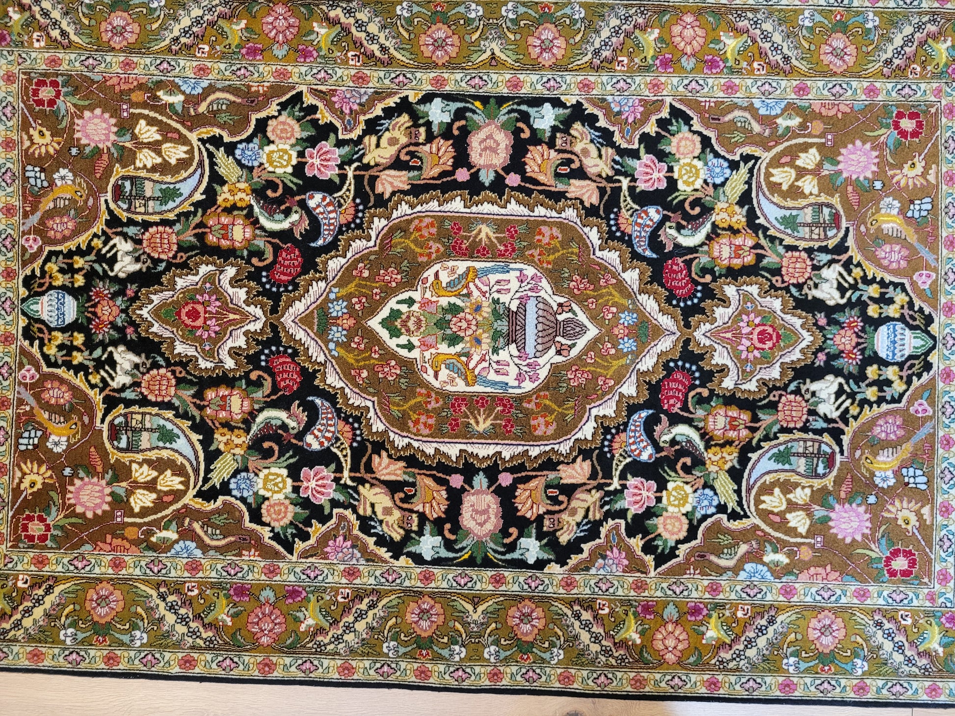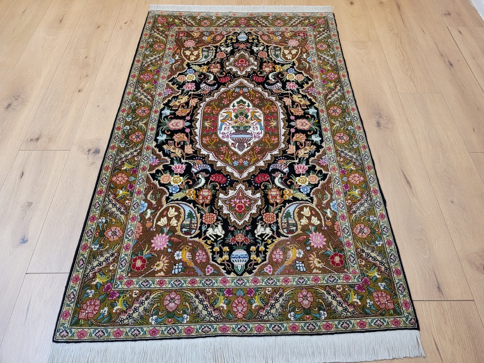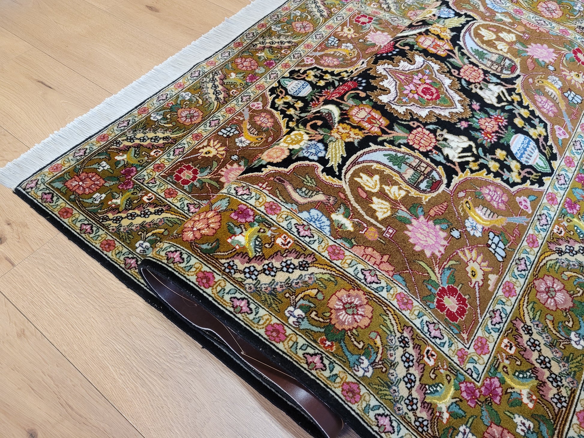 angeboten wird ein erlesener Täbriz Teppich aus feiner Korkwolle mit Seide, handgeknüpft in detailreicher Knüpfkunst. Im Zentrum steht ein ornamentales Medaillon mit einer reich gefüllten Vase, flankiert von filigranen Vögeln und Blüten. Die Umrahmung zeigt eine opulente florale Gestaltung mit Ranken, Blüten und Tierdarstellungen, die dem Teppich eine besonders harmonische und zugleich repräsentative Ausstrahlung verleihen.