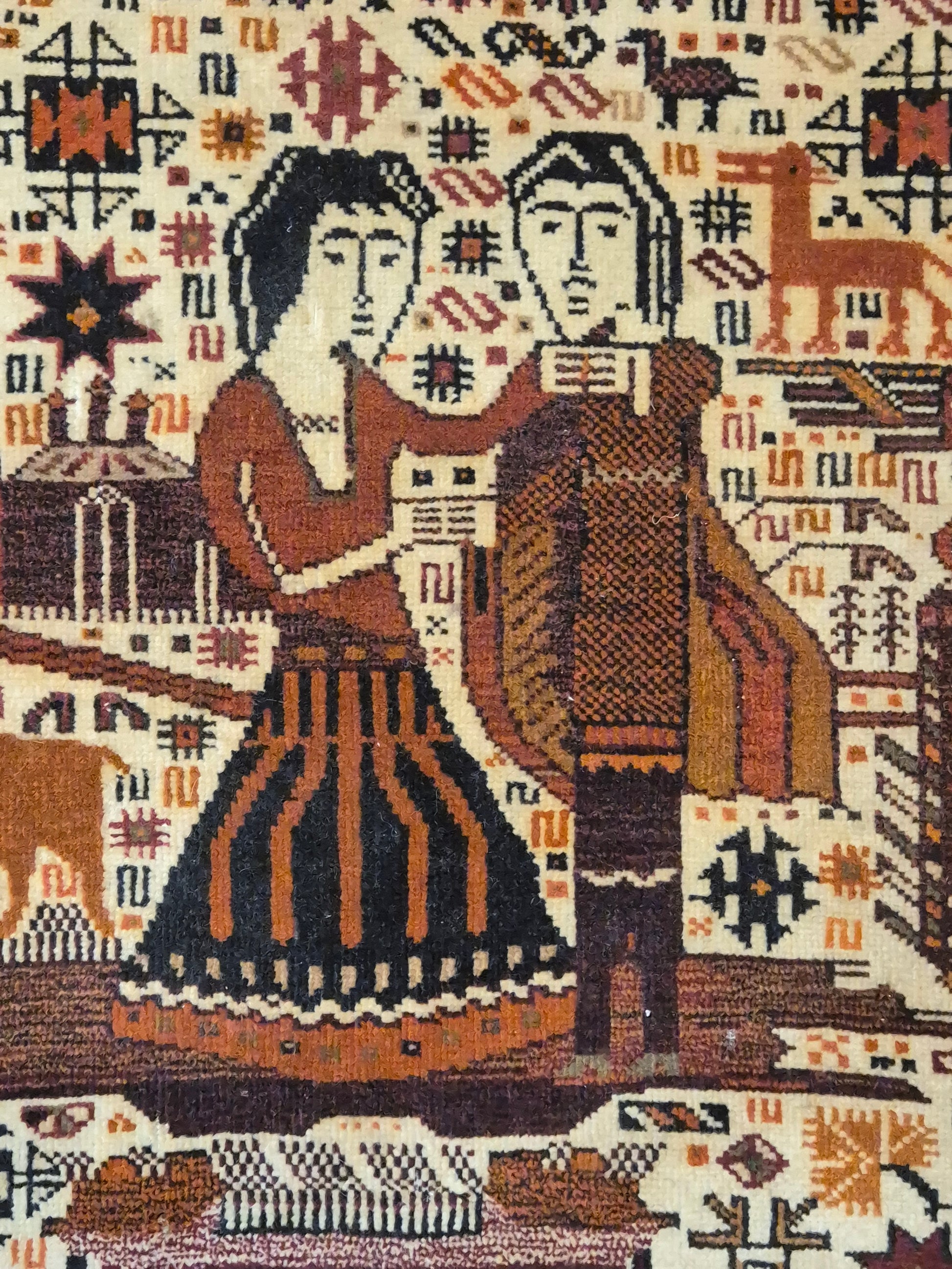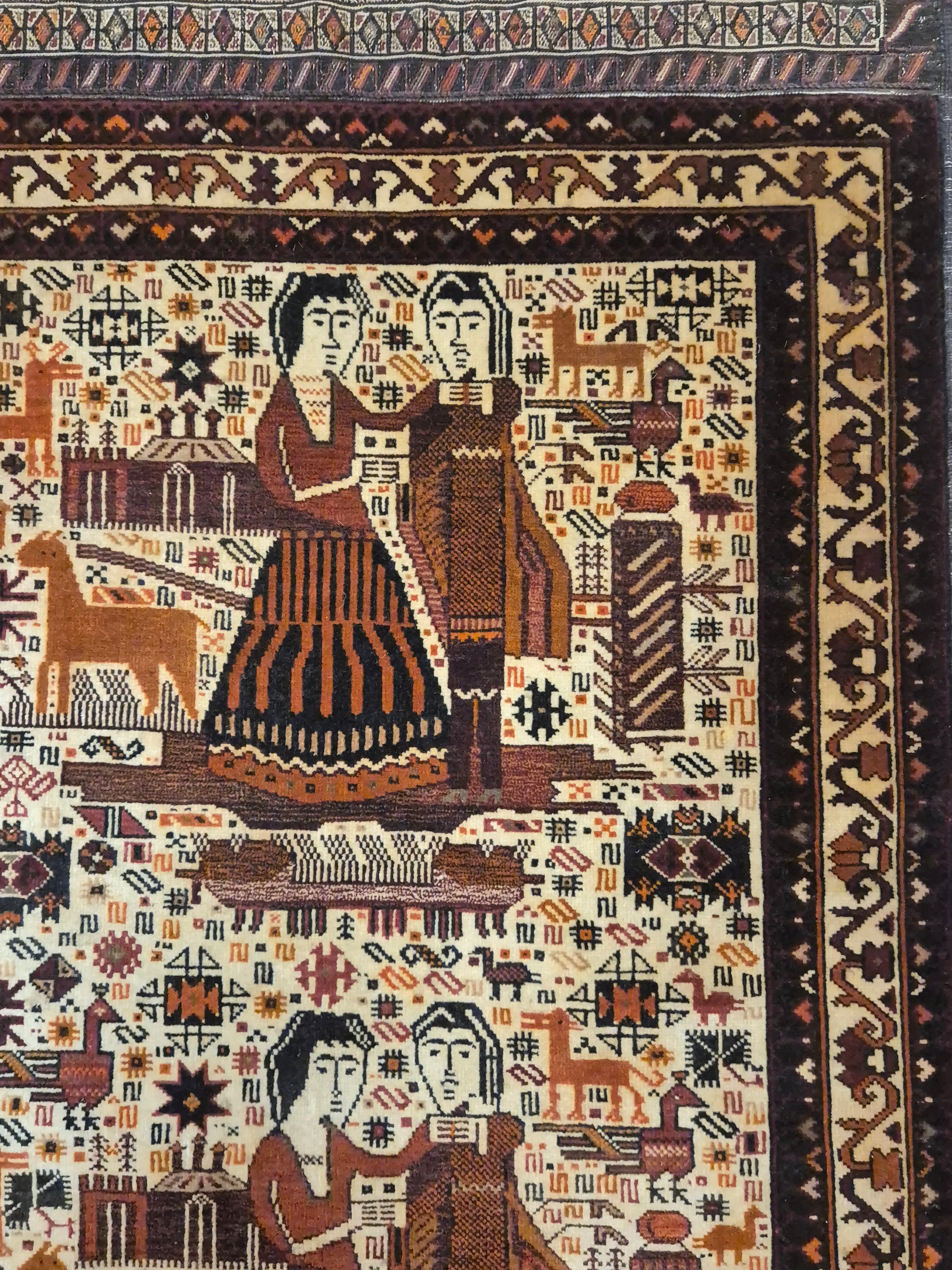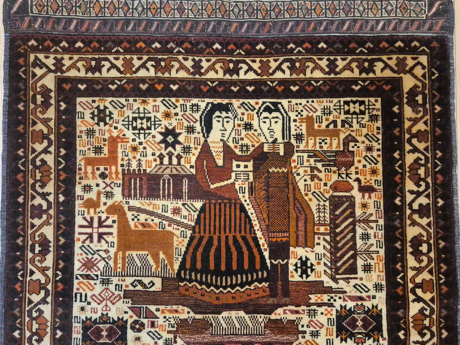 angeboten wird ein charaktervoller Torbat Belutsch Teppich aus reiner Wolle, handgeknüpft in detailreicher Ausführung. Das Motiv zeigt eine doppelte figürliche Szene mit einem Paar in traditioneller Kleidung, umgeben von Tieren, architektonischen Elementen und geometrischen Symbolen. Der Teppich verbindet bildhafte Erzählkunst mit ornamentaler Gestaltung und beeindruckt durch seine warme Farbgebung und fein gearbeitete Muster.