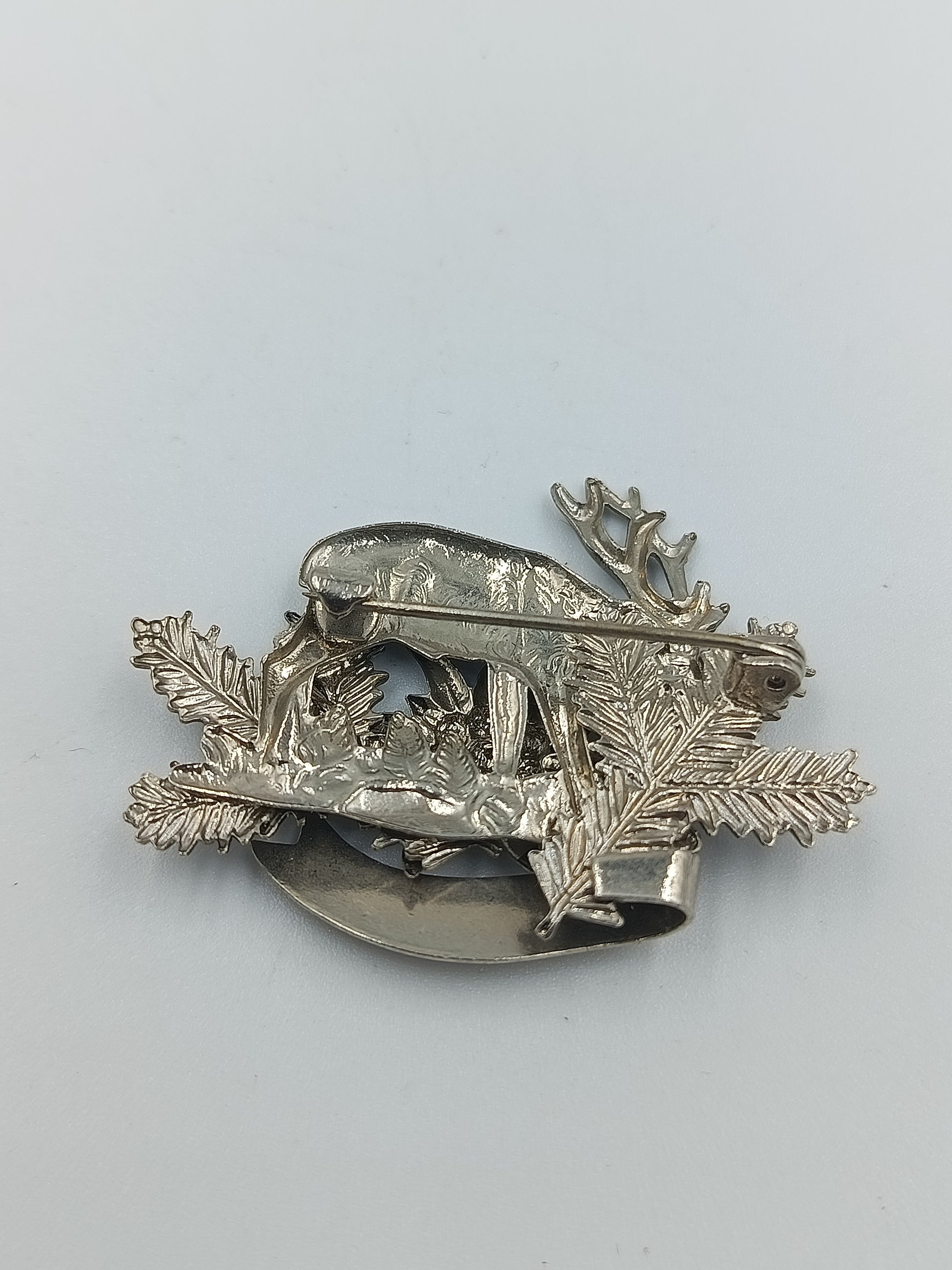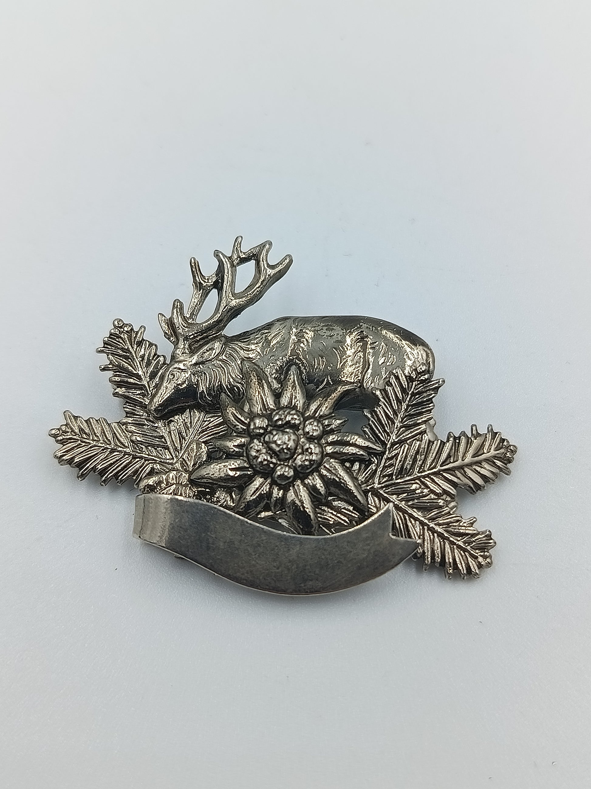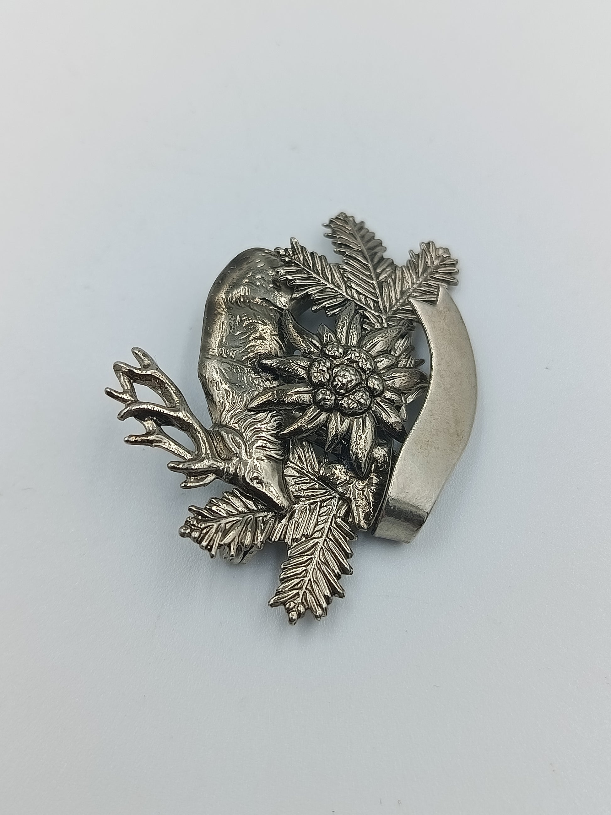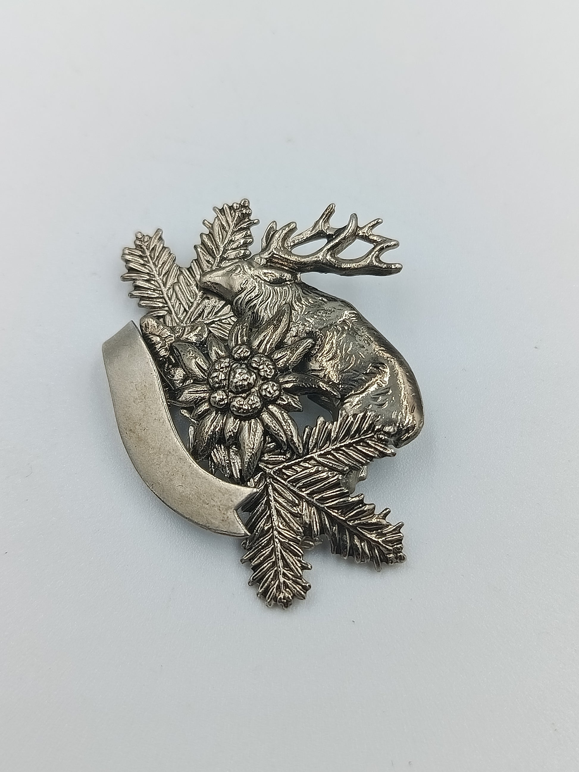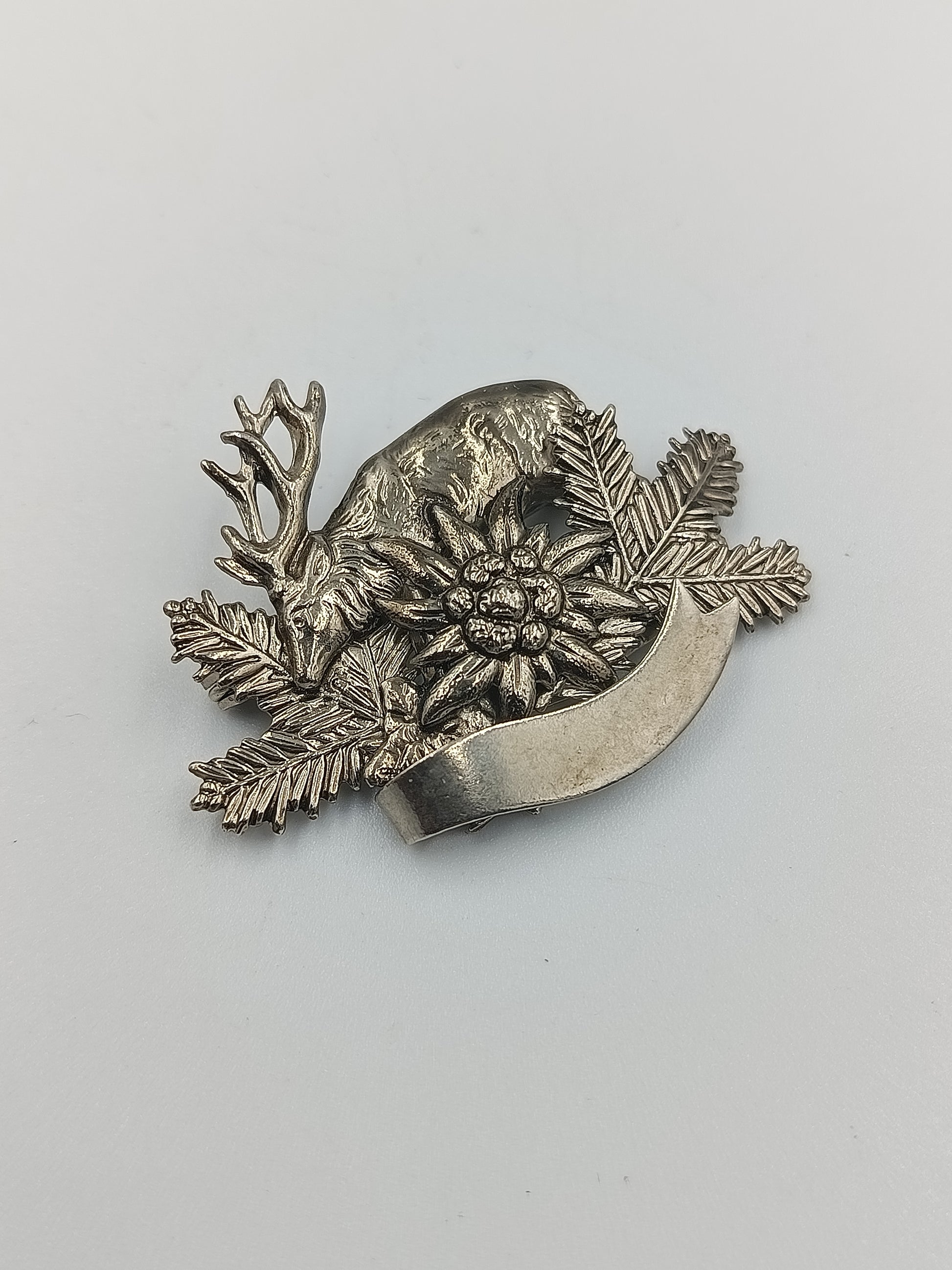Traditionelle Trachtenbrosche aus silberfarbenem Metall mit liebevollen Details: Ein stolzer Hirsch steht vor einem filigranen Tannenzweig und einer großen Edelweißblüte. Perfekt, um jedes Trachtenoutfit oder Janker zu schmücken.