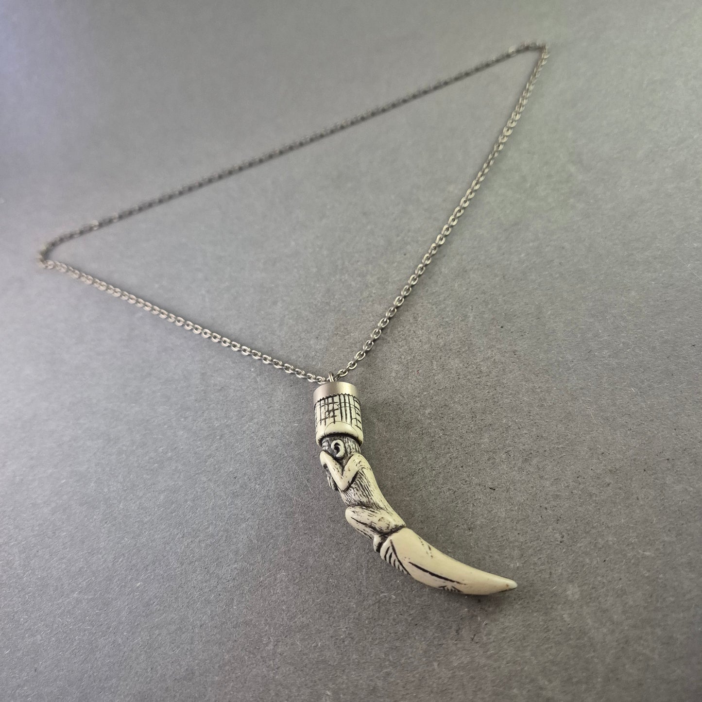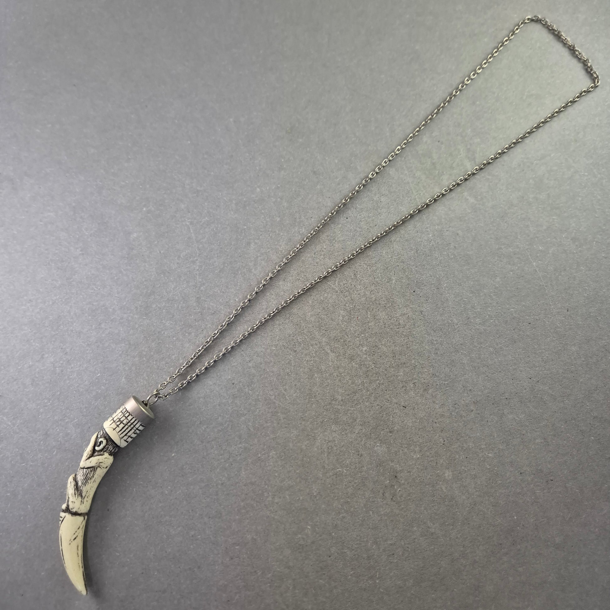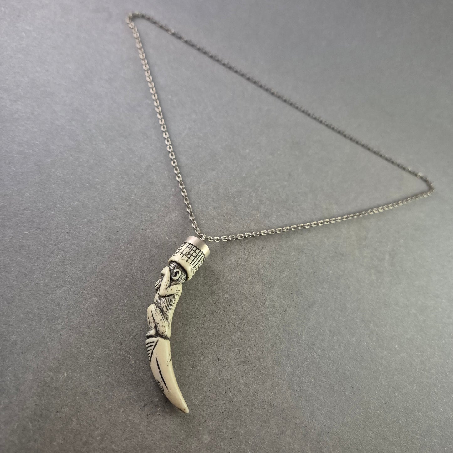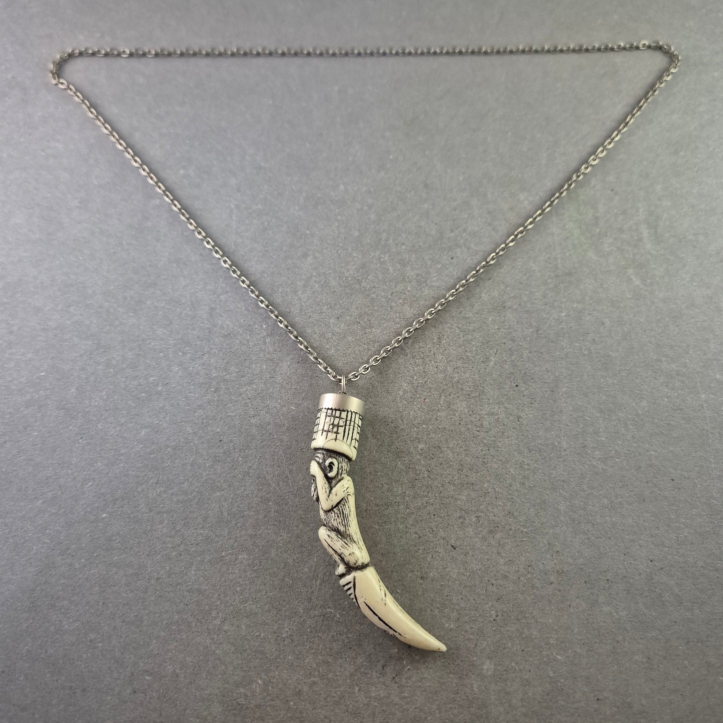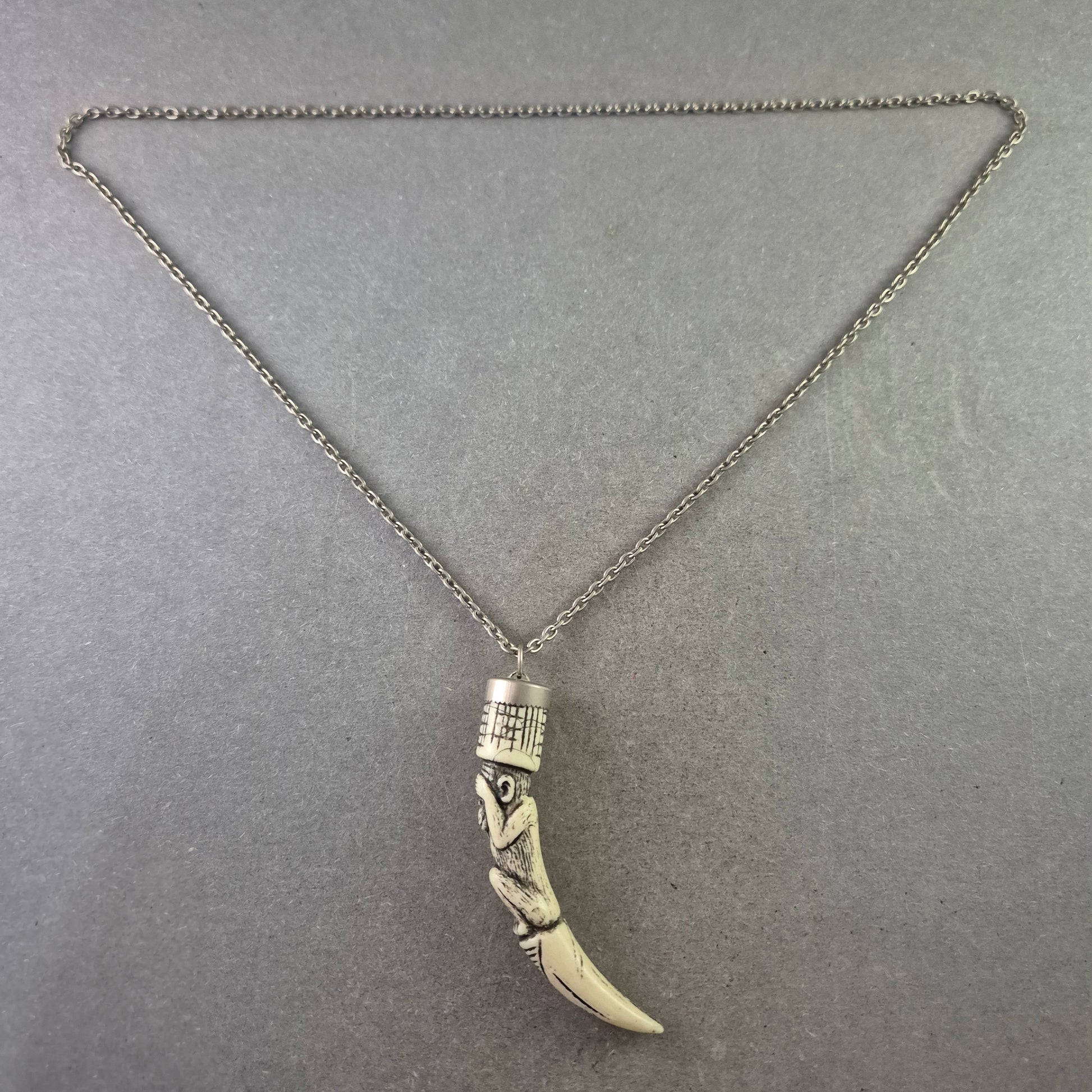 Diese auffällige Halskette besticht durch ihren detailreichen Tribal-Anhänger in Form eines stilisierten Affen auf einem Zahn – ein echtes Statement-Piece mit symbolischer Tiefe. Der Anhänger ist aus hellem Kunststoff gefertigt und wirkt wie geschnitzter Knochen, während die filigrane Metallkette dem Gesamtbild eine moderne Note verleiht. Ein markantes Accessoire für Liebhaber ethnisch inspirierter Designs.