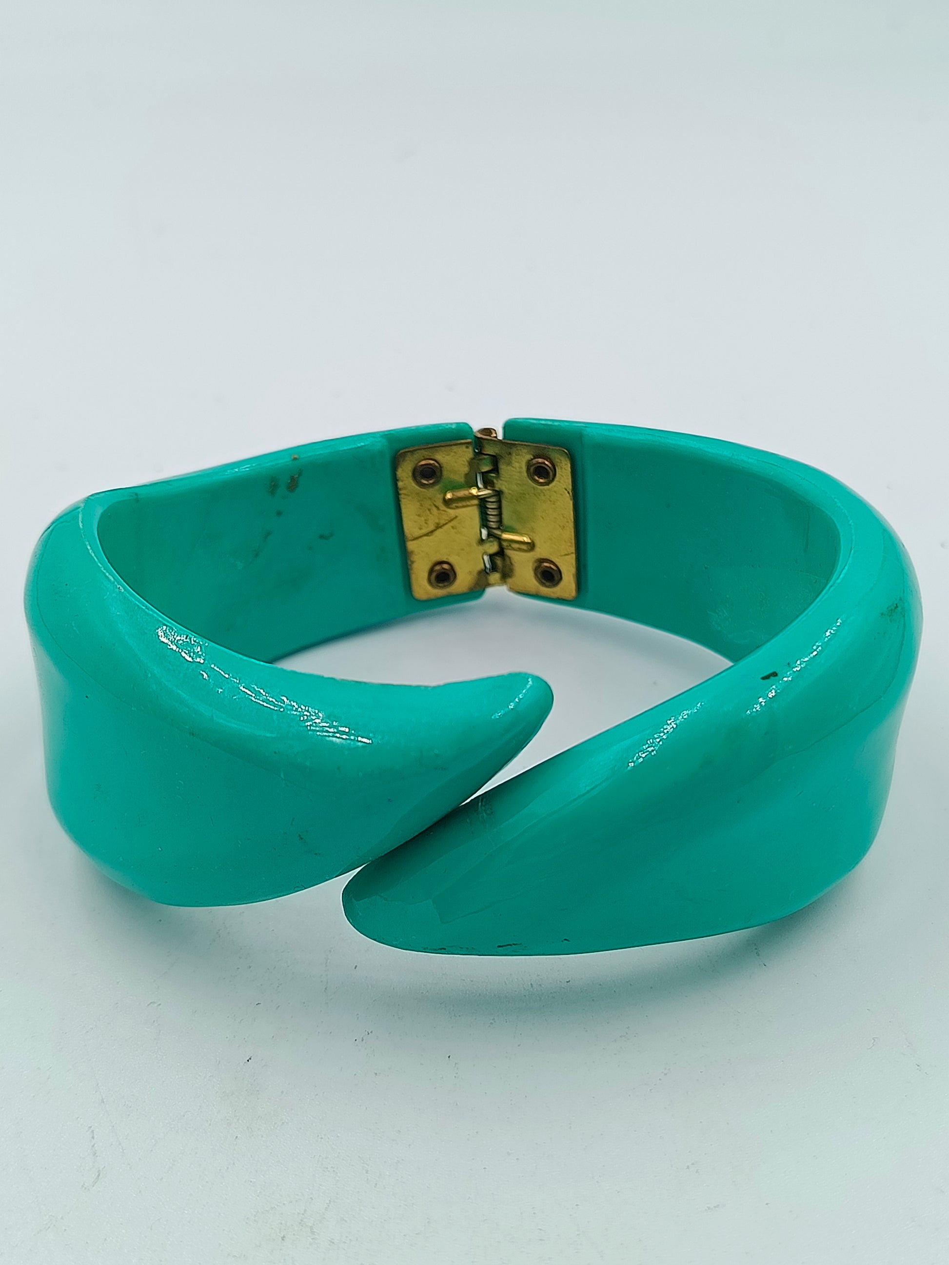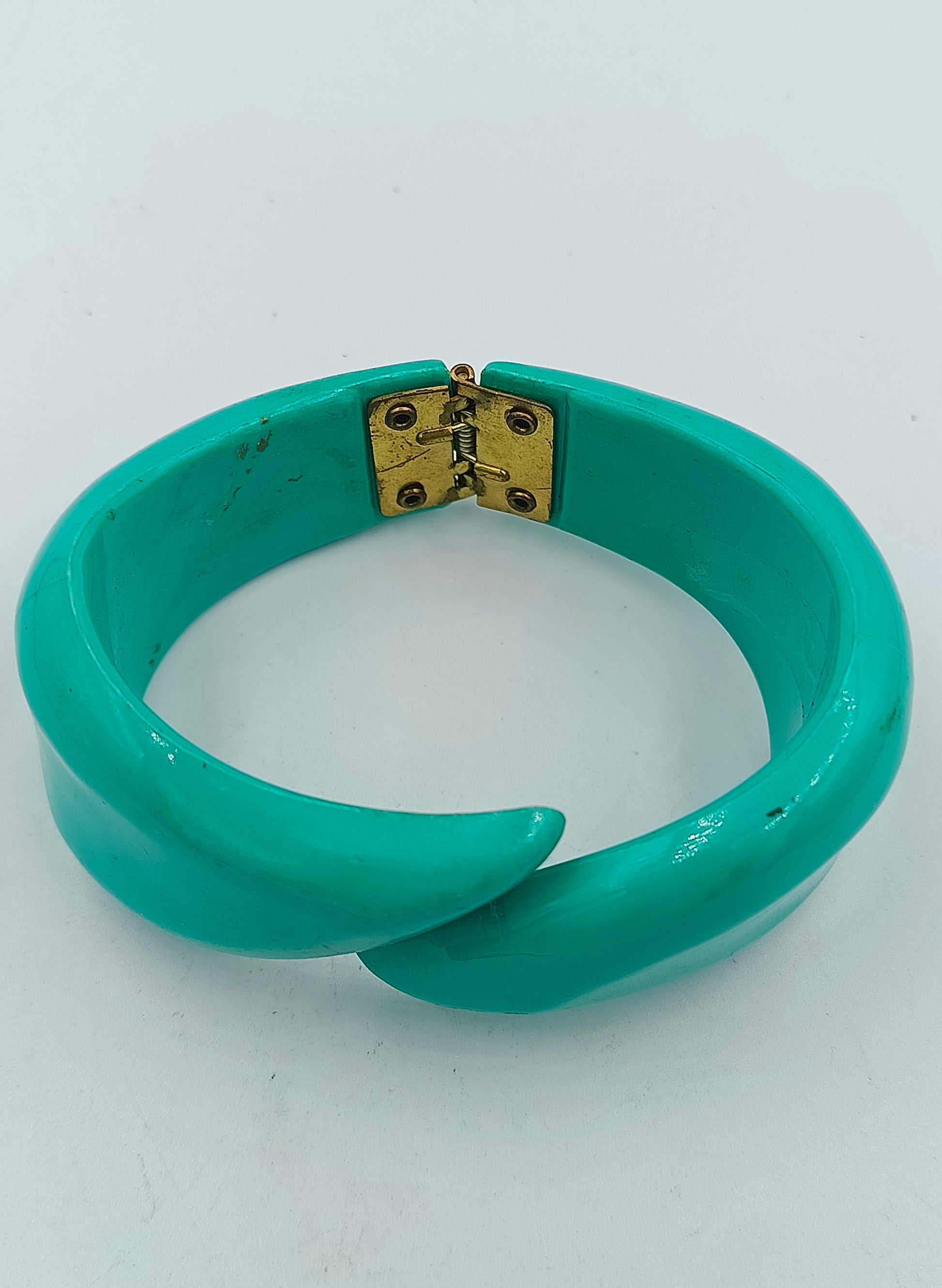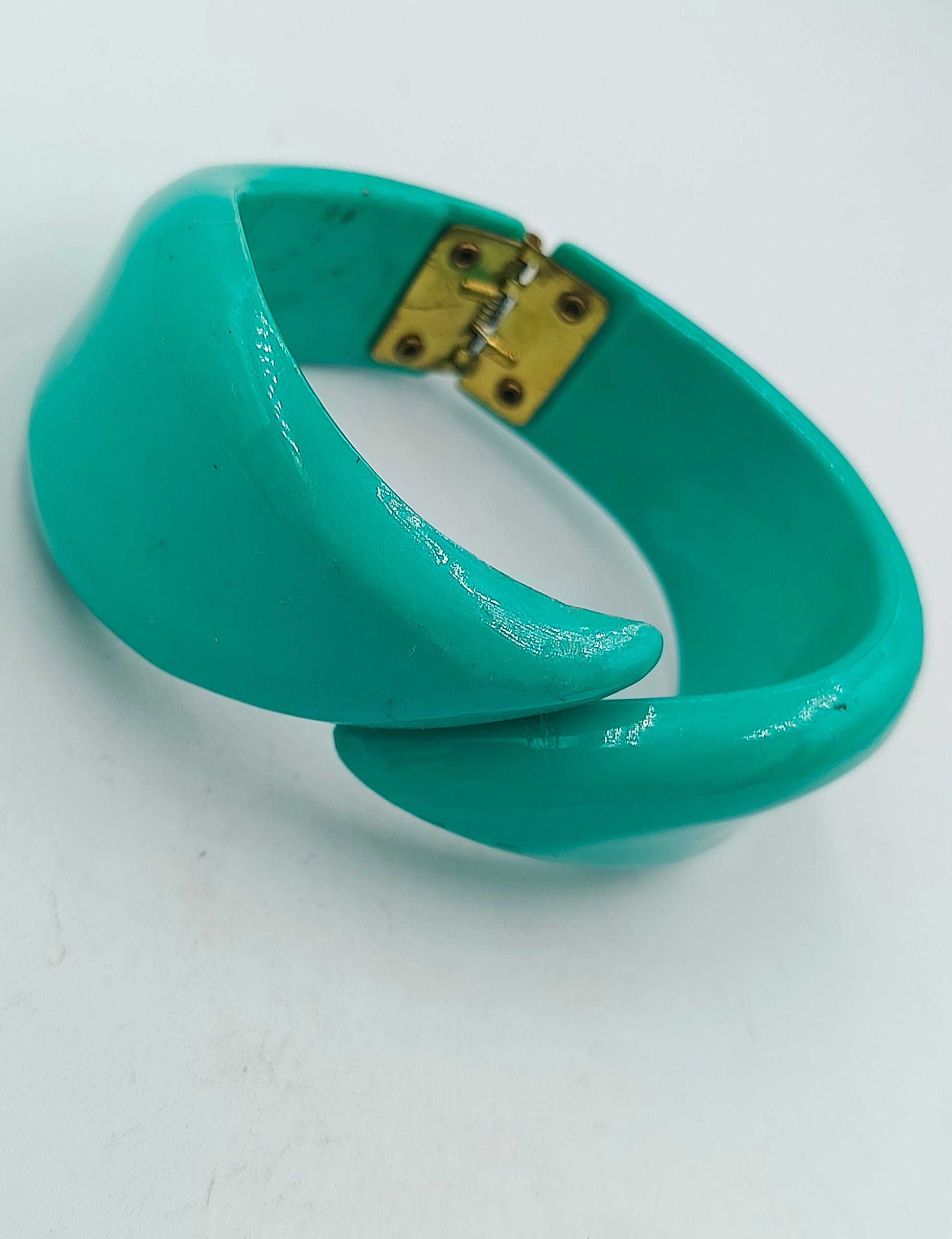 Auffälliger Vintage-Armreif in glänzendem Türkiston mit goldfarbenem Scharnier-Verschluss. Der geschwungene Verlauf an der Vorderseite verleiht dem Stück eine elegante, leicht verspielte Form – ein modisches Statement für jeden Anlass.