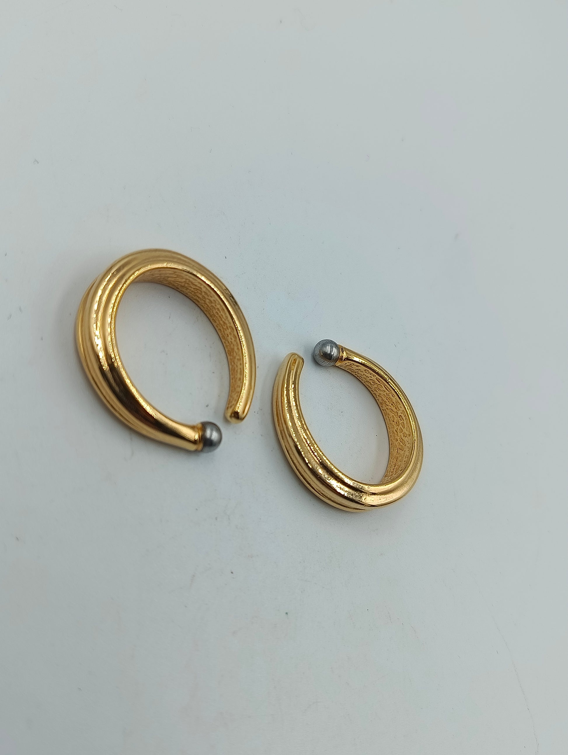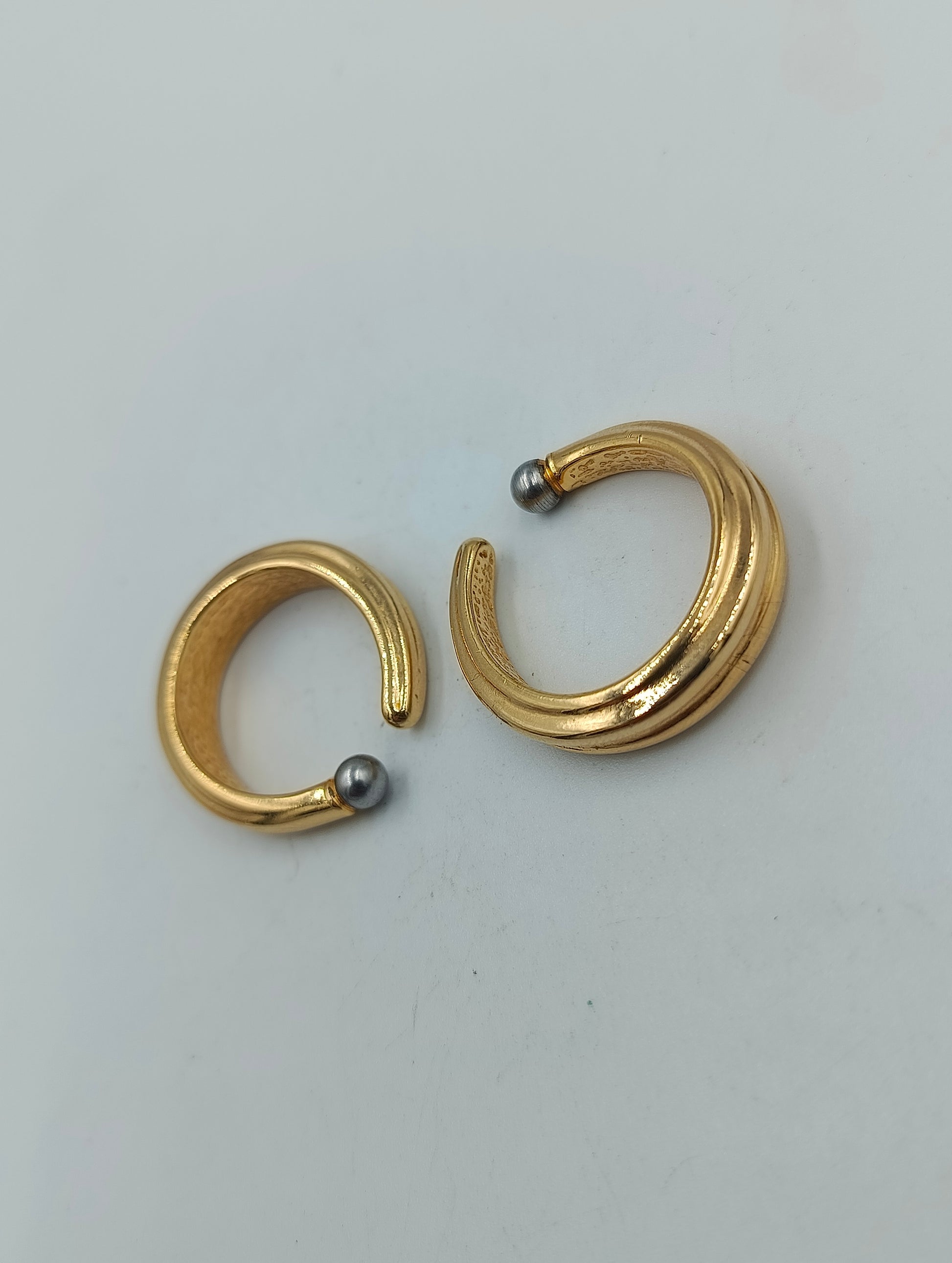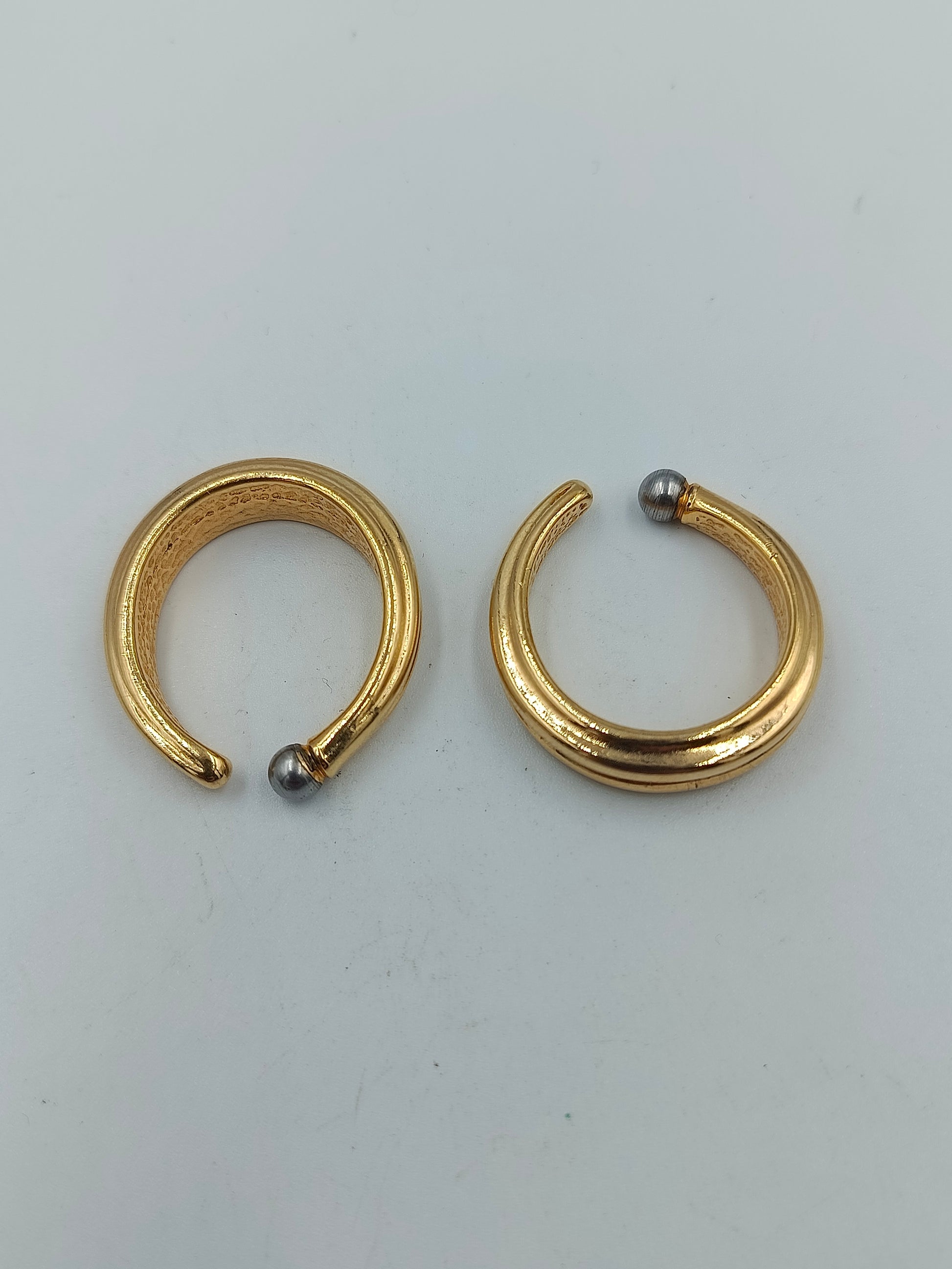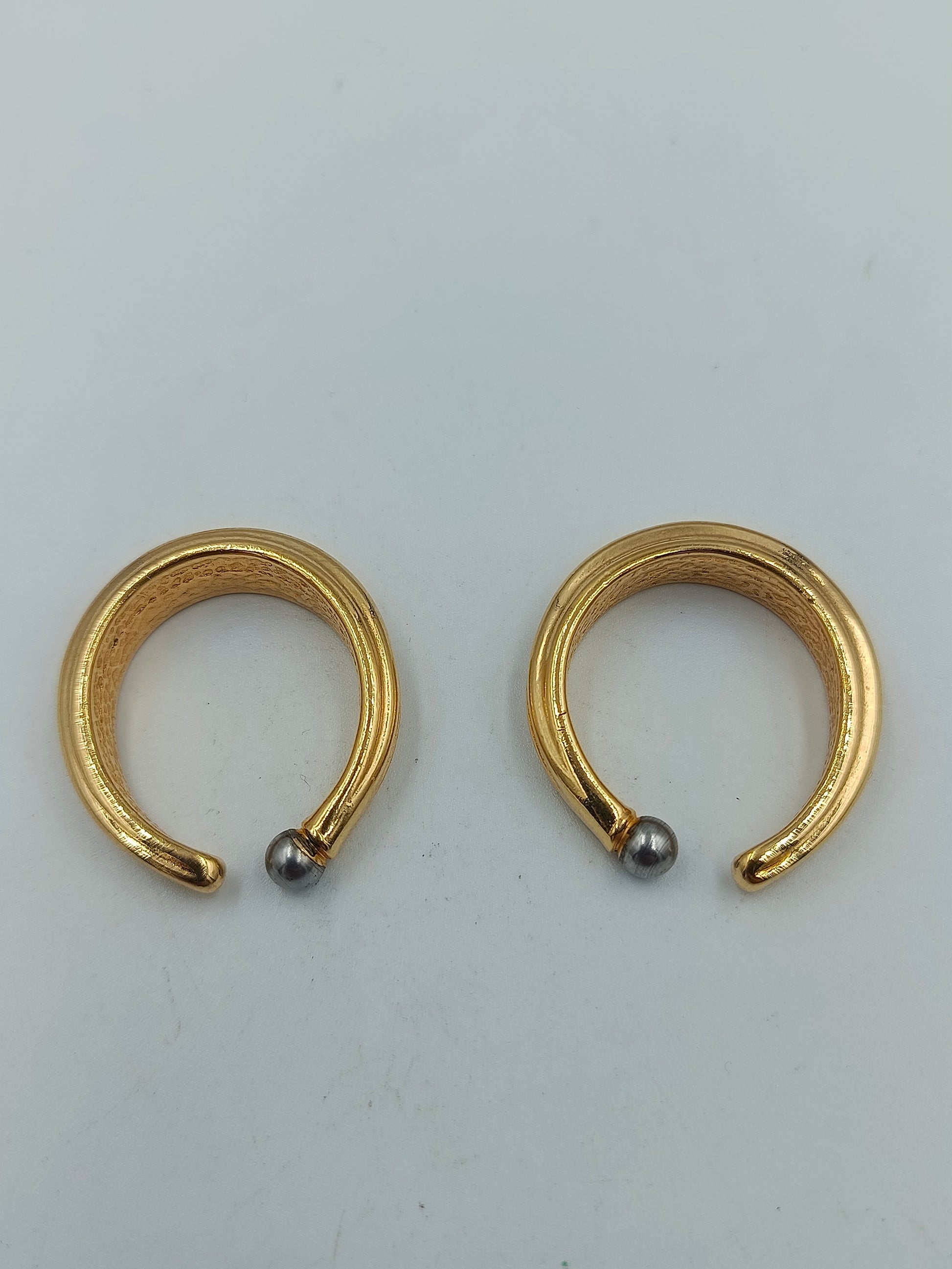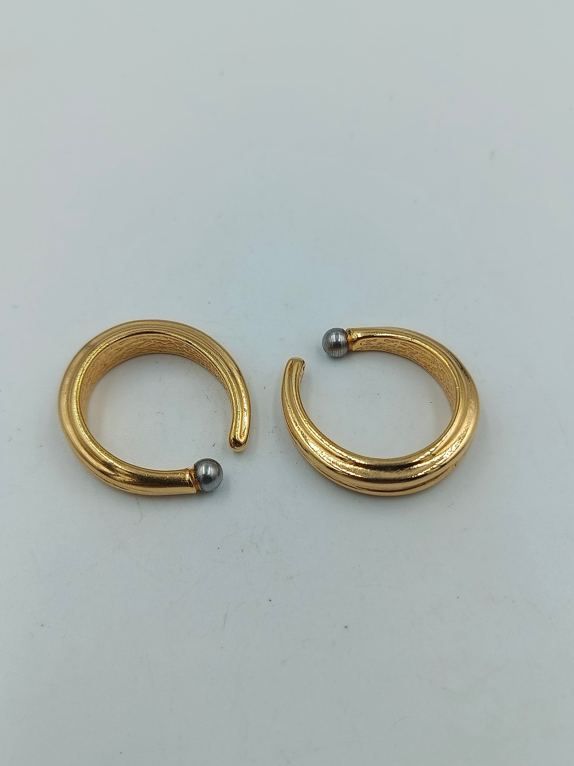 Elegante, massive vergoldete Ohrringe in moderner, halb offener Form. Die Enden sind jeweils mit einer kleinen silberfarbenen Kugel verziert, was den minimalistischen Stil edel abrundet. Die Creolen wirken markant und zugleich zeitlos – ideal für elegante oder schlichte Outfits.