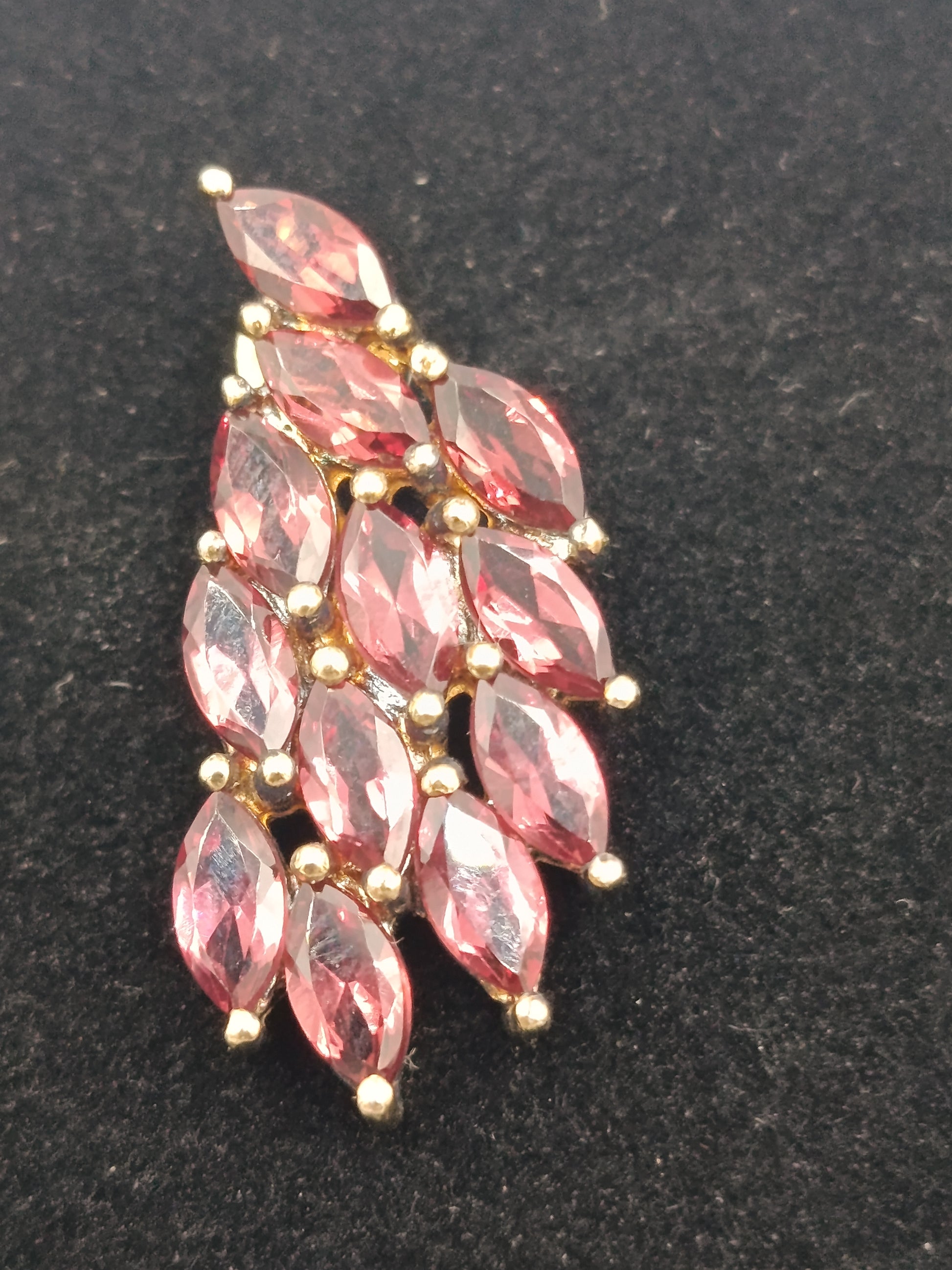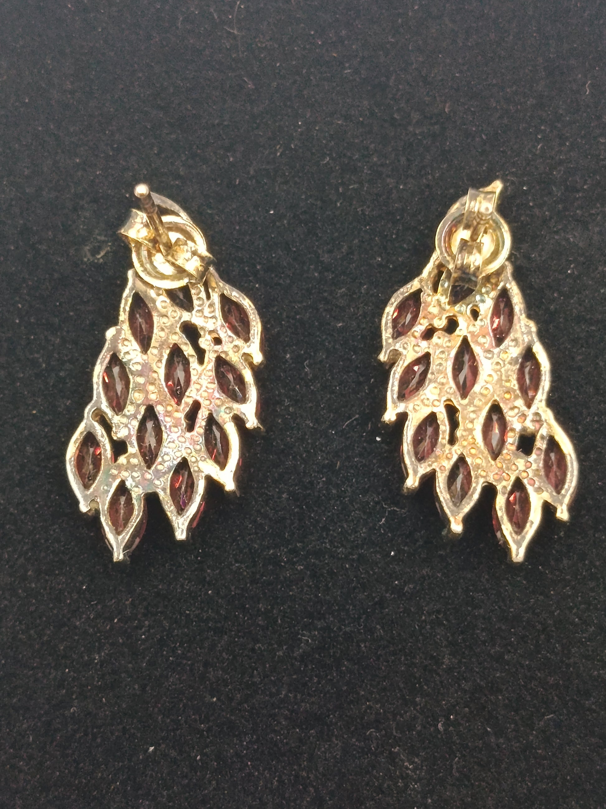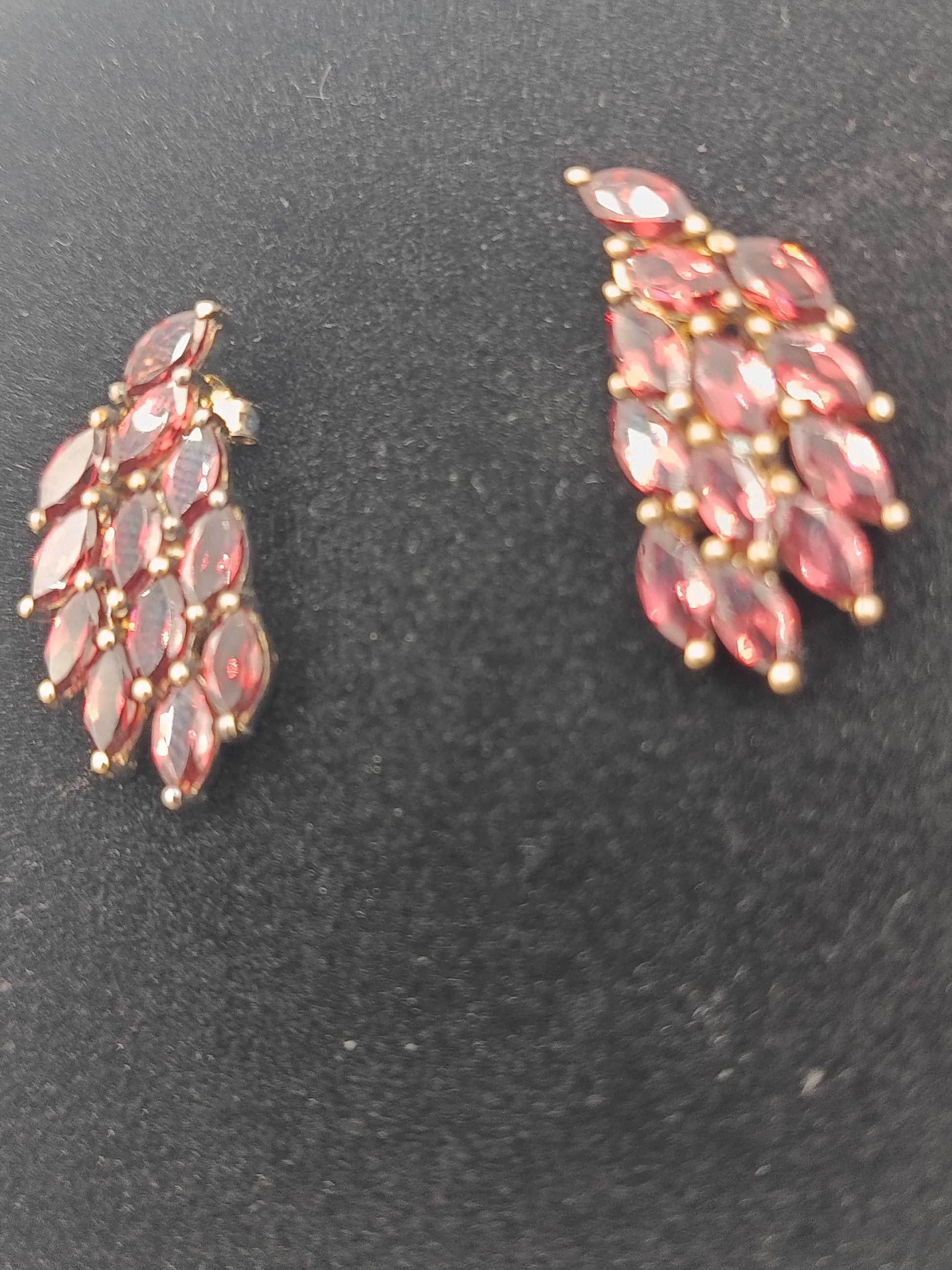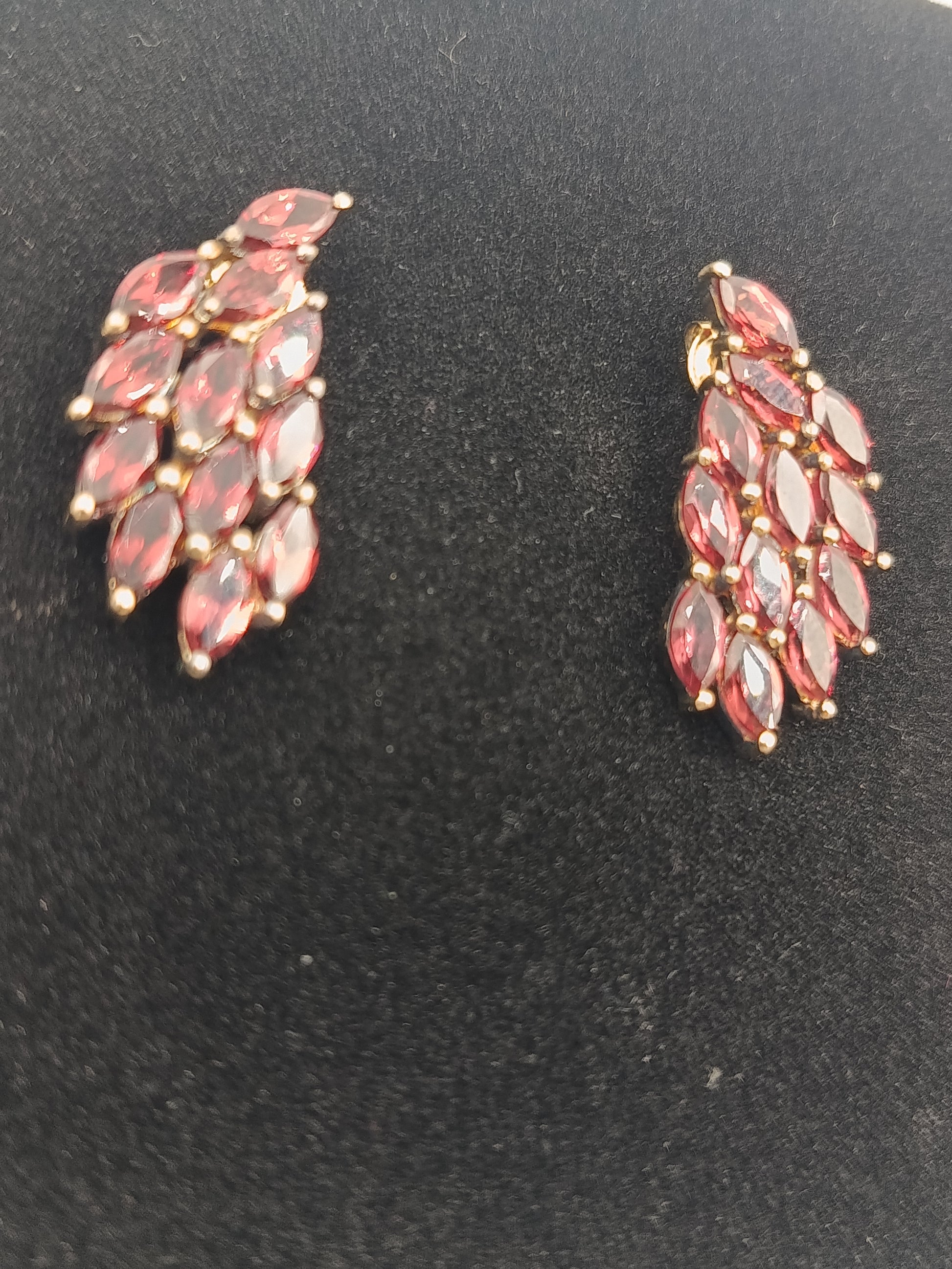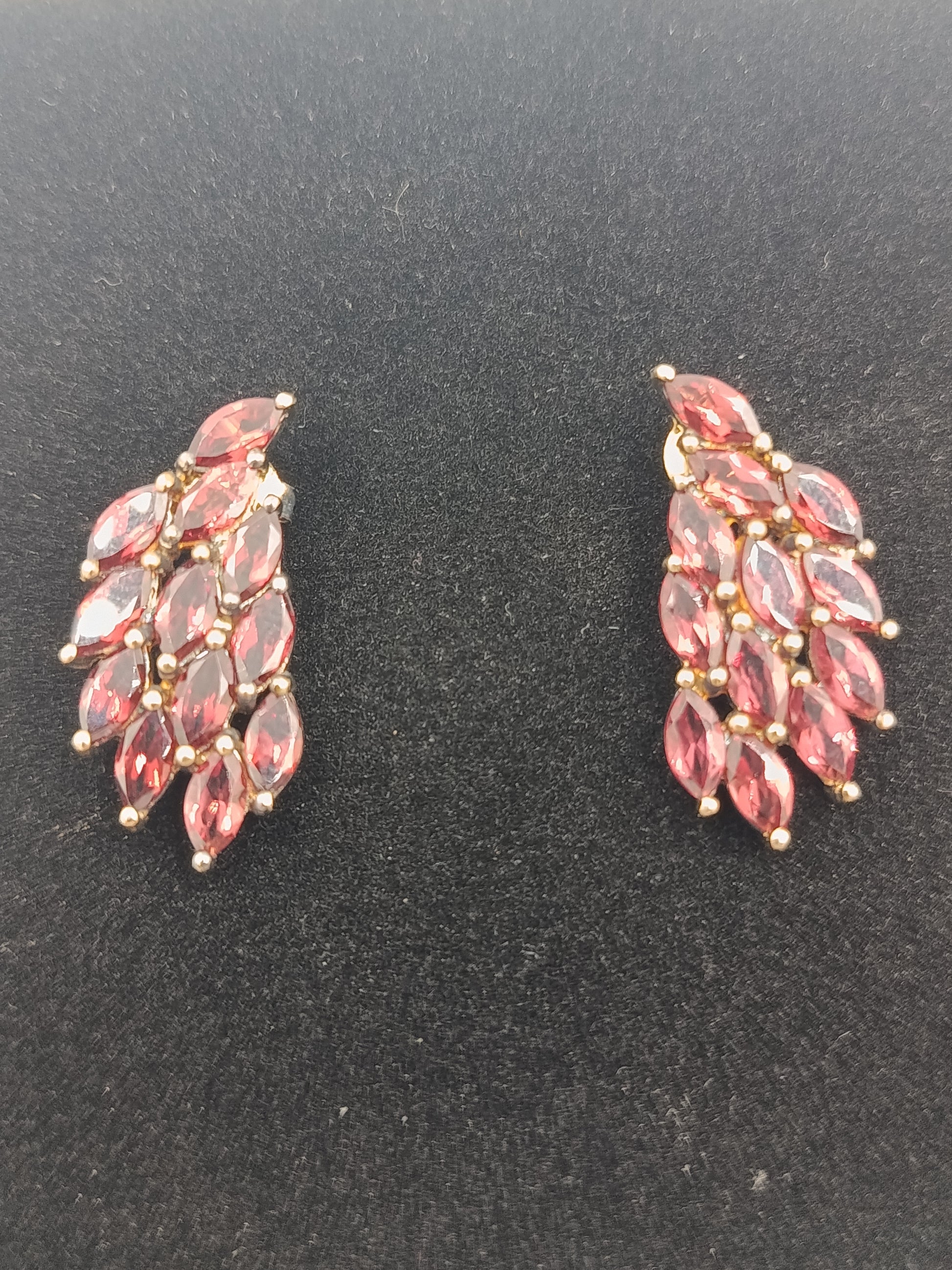 Elegante vergoldete Ohrringe mit roten, facettierten Schmucksteinen in Blattform. Das harmonische Design und die funkelnden Steine verleihen den Ohrringen einen luxuriösen Look – perfekt für Abendgarderobe, festliche Anlässe oder als stilvolles Accessoire im Alltag.